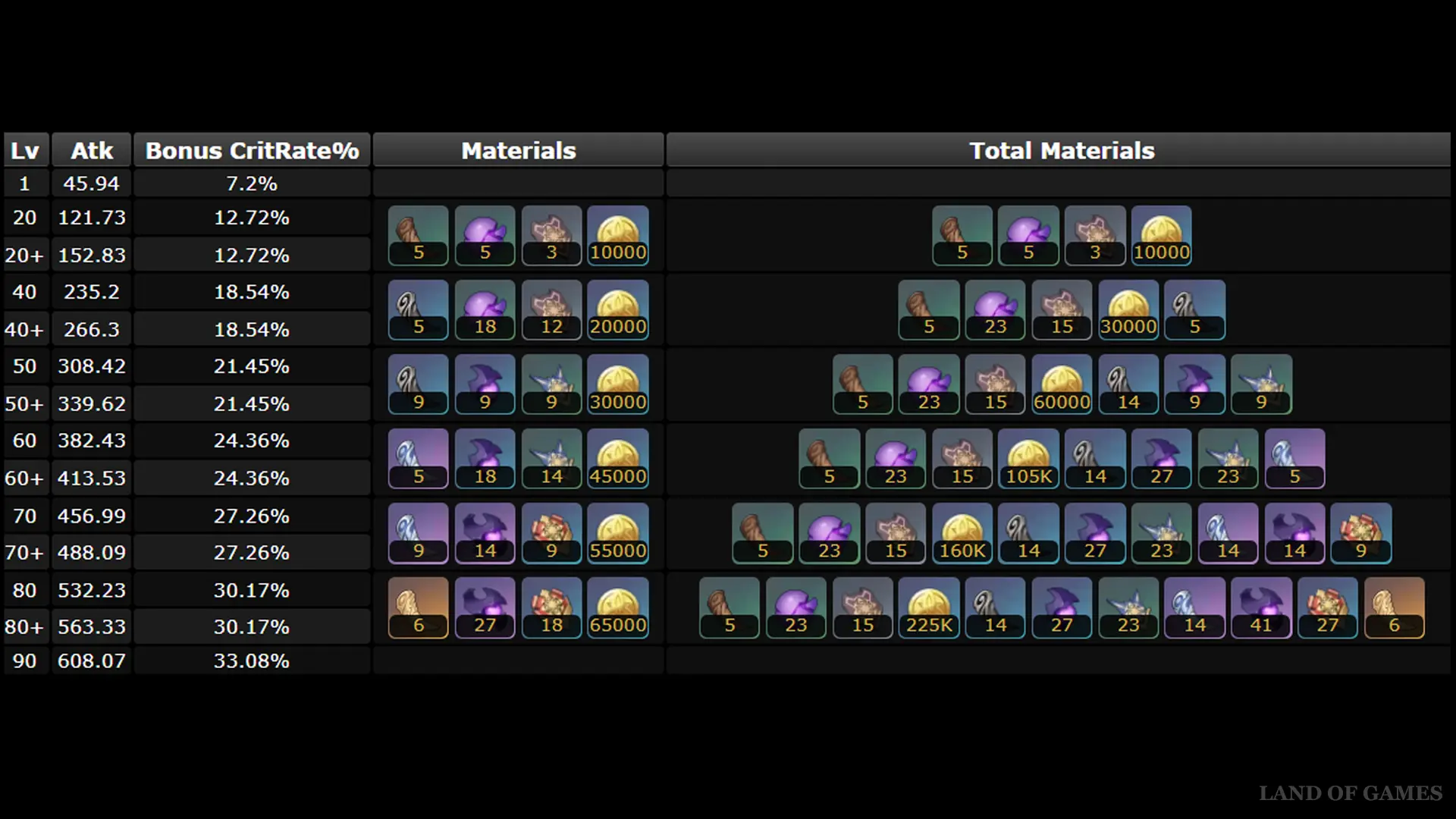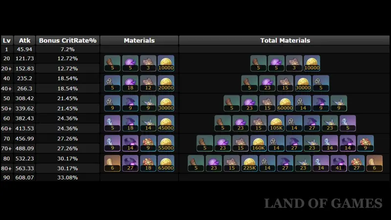 Ниже указан объем ресурсов, необходимых для возвышения и полной прокачки клеймора: