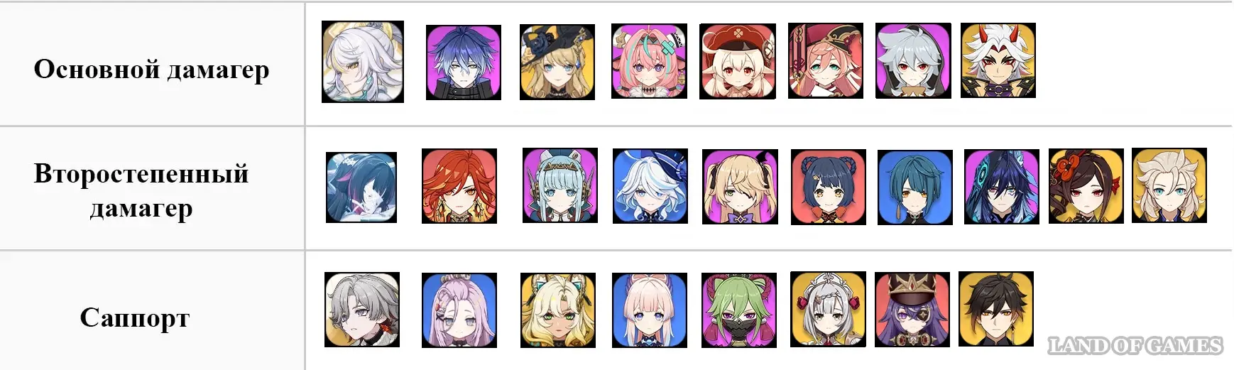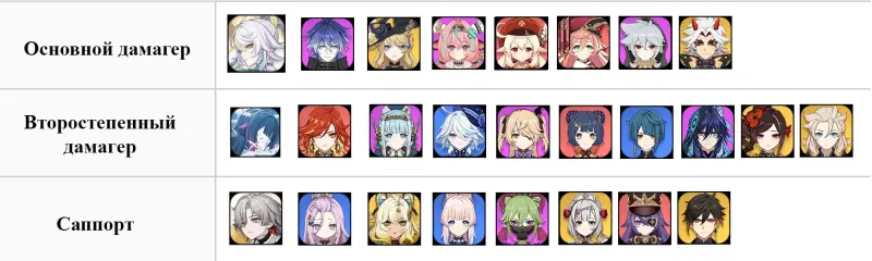 | Мейн-ДД | Саб-ДД | Саб-ДД/Поддержка | Поддержка |