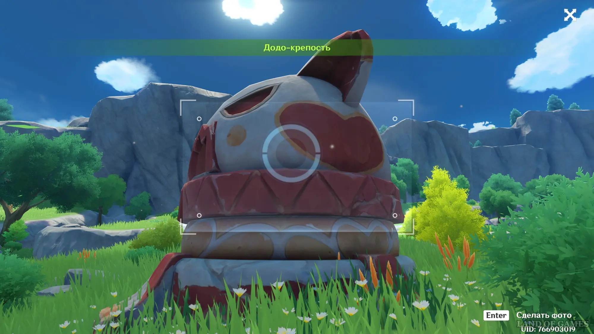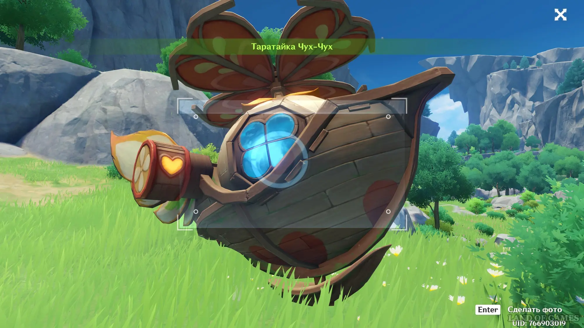 От предыдущей статуи пройдите немного на север, проплыв через озеро и поднявшись на выступ. Здесь вы обнаружите таратайку Чух-Чух, которой пользовались в рамках одного из временных событий предыдущих патчей, – сделайте ее снимок.