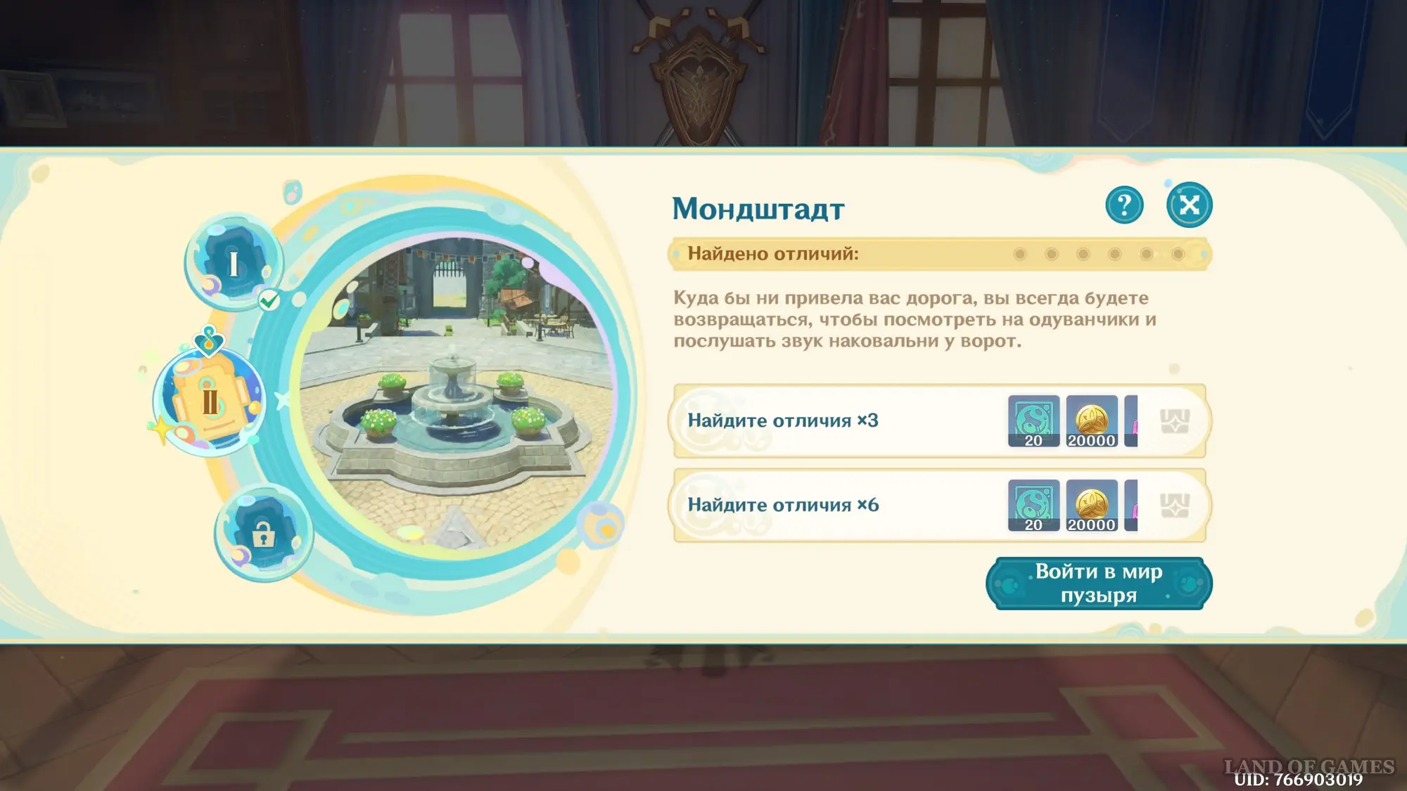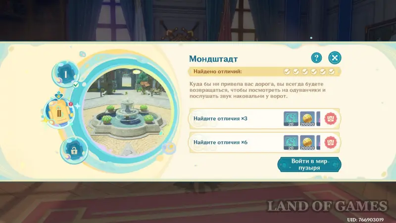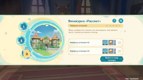 Находясь в измененной версии Мондштадта, вы начнете замечать в нем различные аномалии, которые разительно отличают город от его реальной версии. Вам нужно будет запечатлеть их с помощью Камеры поиска отличий, помогая тем самым Николь с отладкой и зарабатывая награды.