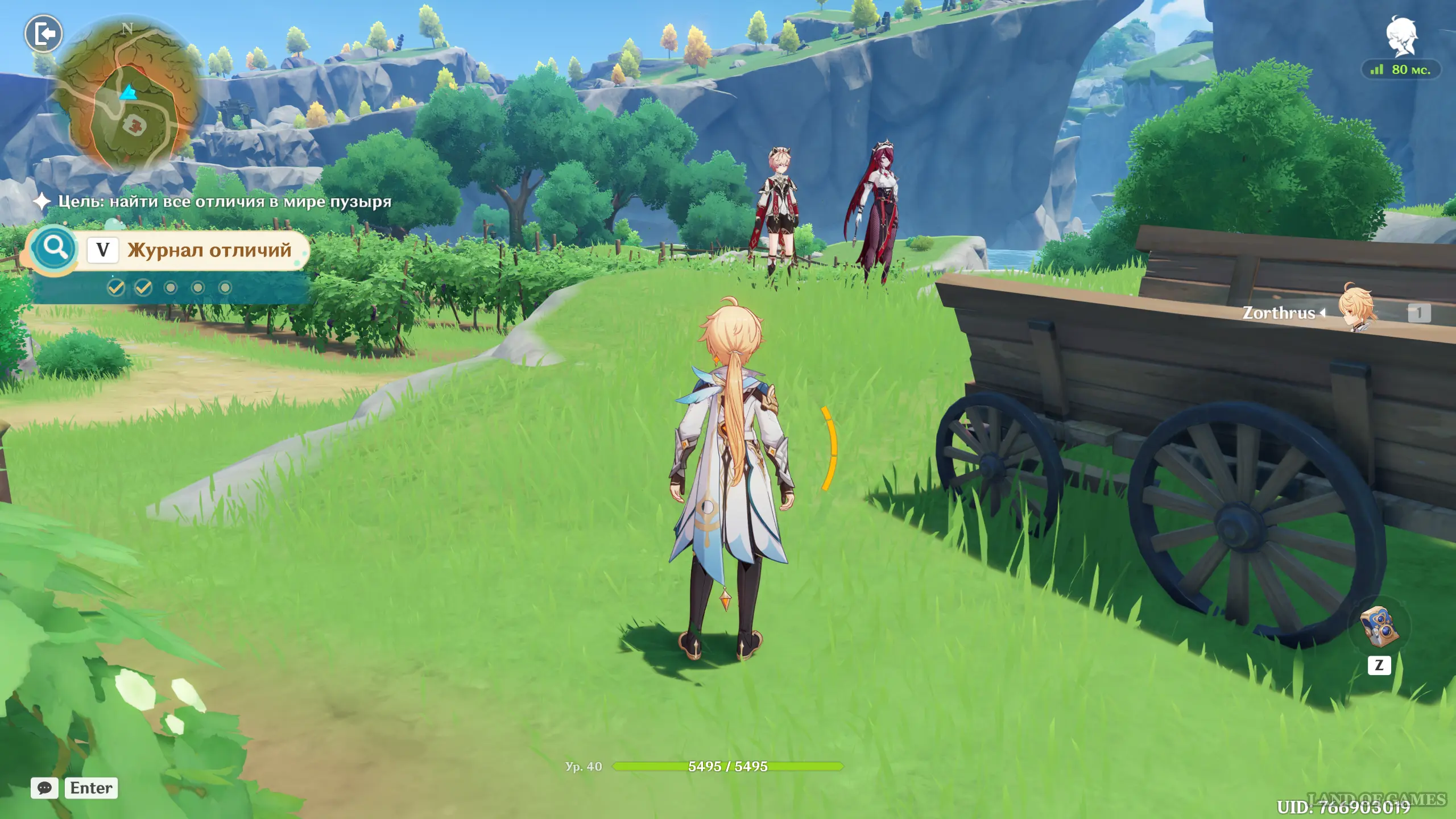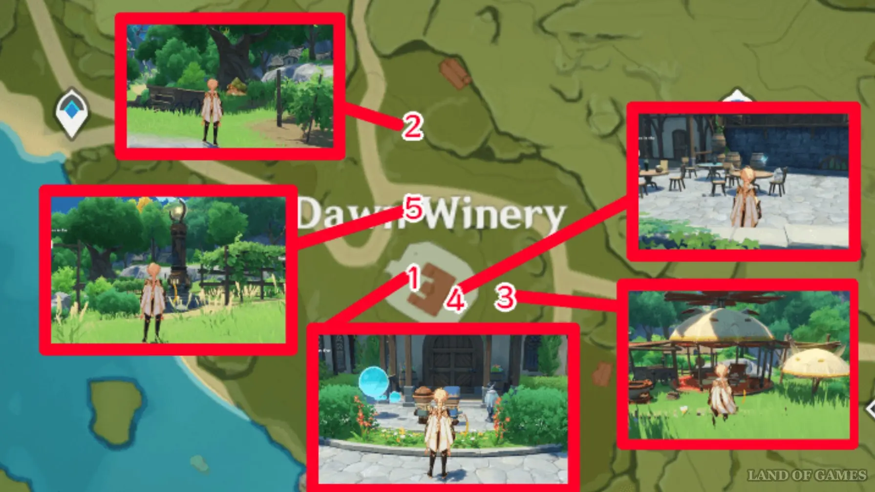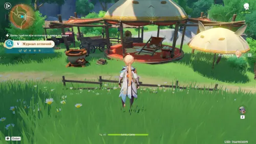 Вернитесь к усадьбе, а потом обойдите ее справа, пройдя немного на восток. Позади нее вы обнаружите тент, принадлежащий Алисе, – сфотографируйте его, а затем поговорите с пришедшими Дилюком и Кэйей.