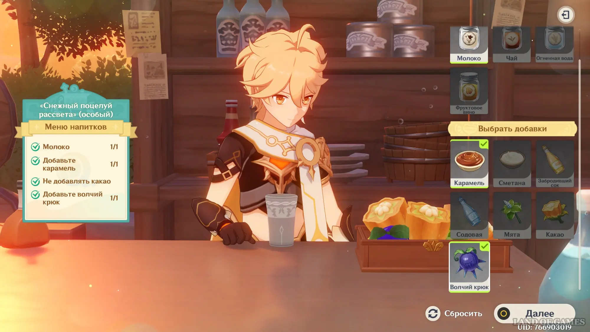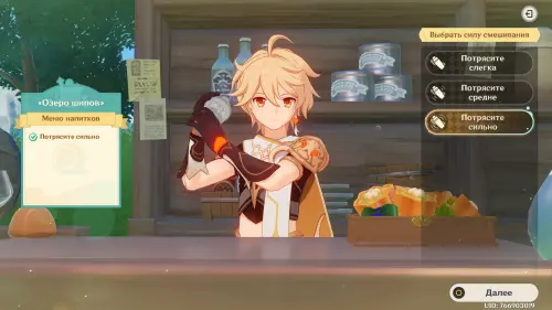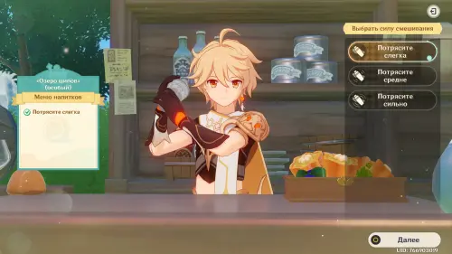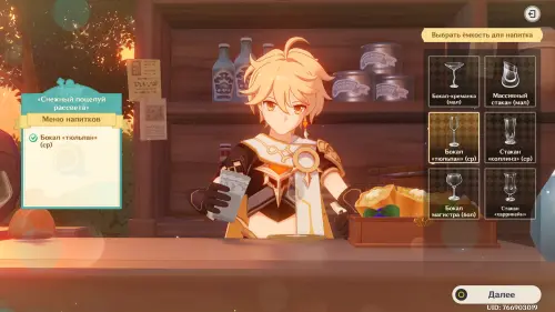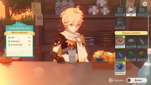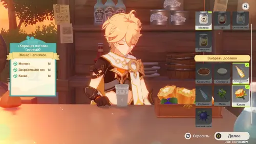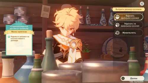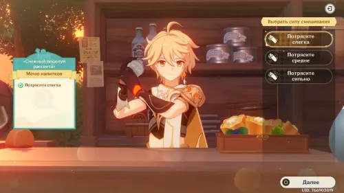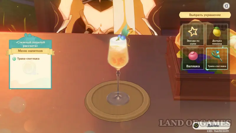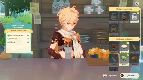 Взаимодействуйте с киоском и примитесь за прохождение первого этапа. Далее возьмитесь за приготовление напитка «Снежный поцелуй рассвета»:
