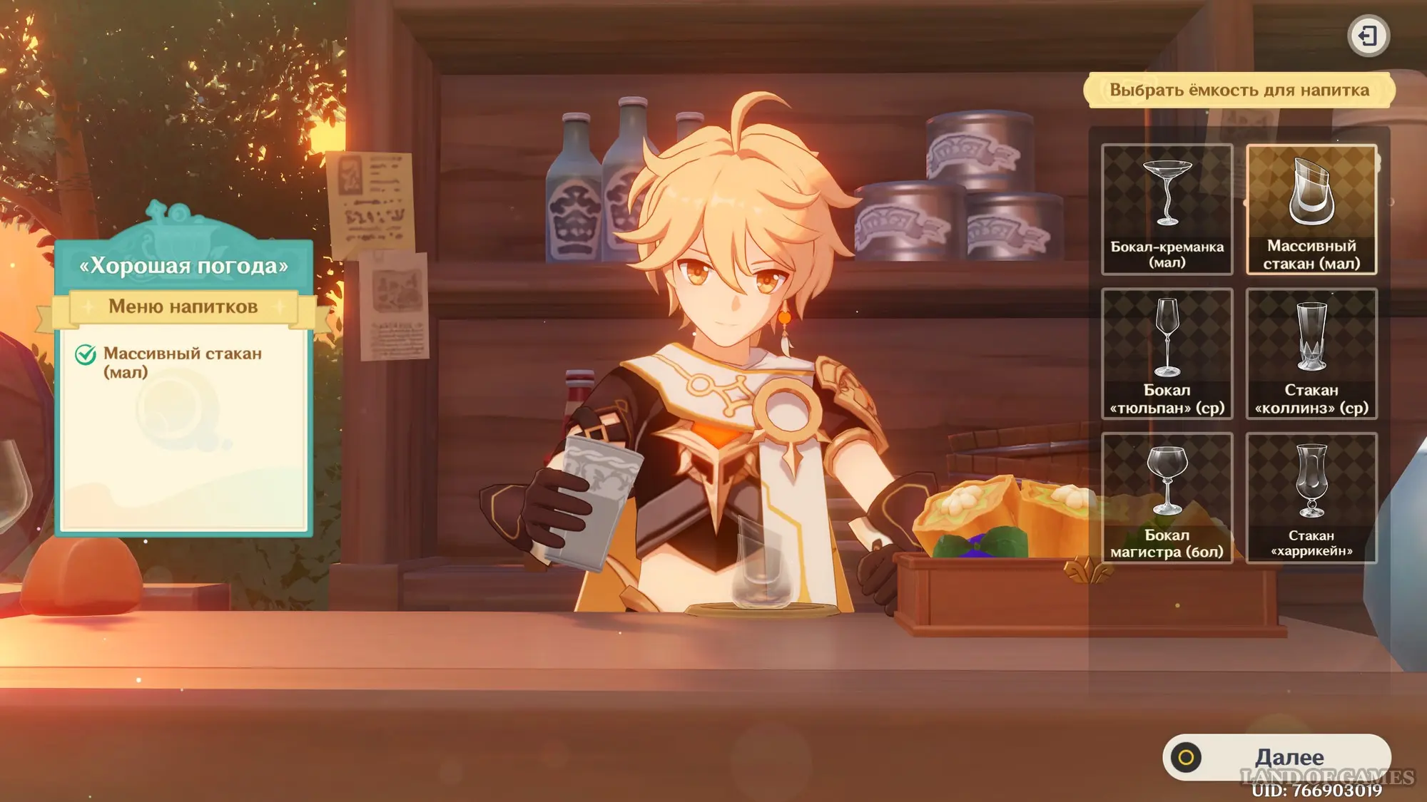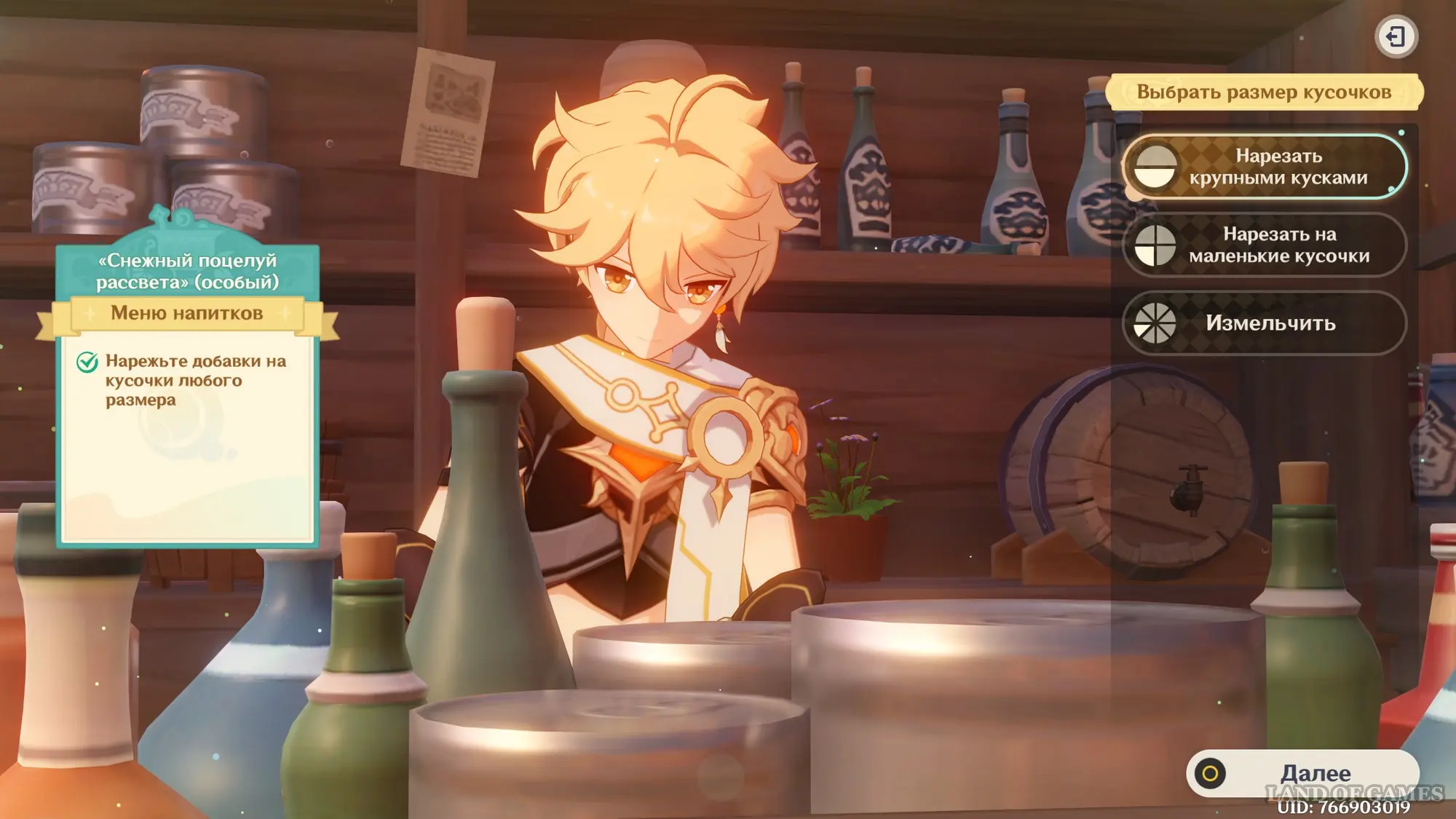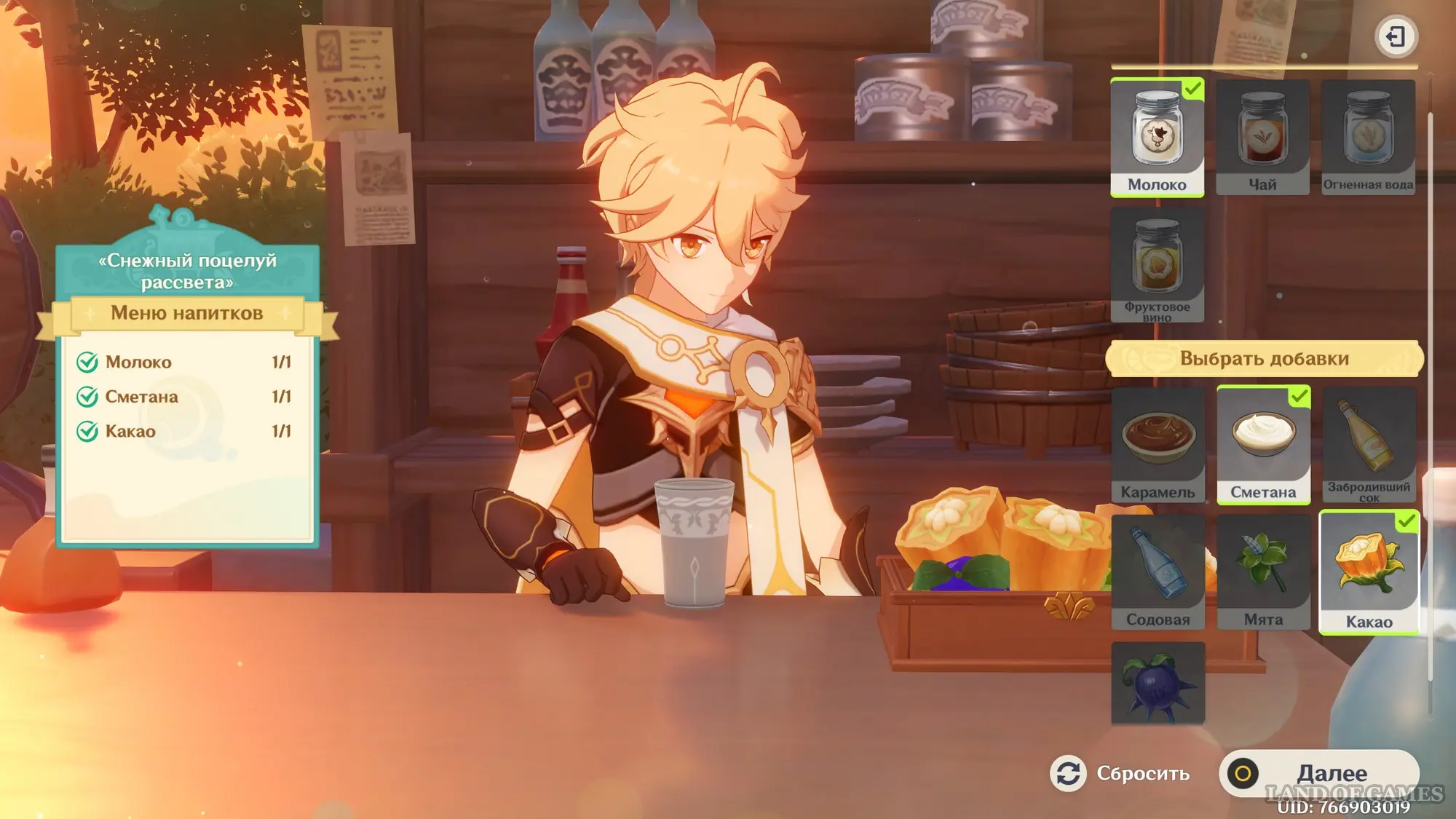 Взаимодействуйте с киоском и примитесь за прохождение первого этапа. Далее возьмитесь за приготовление напитка «Снежный поцелуй рассвета»: