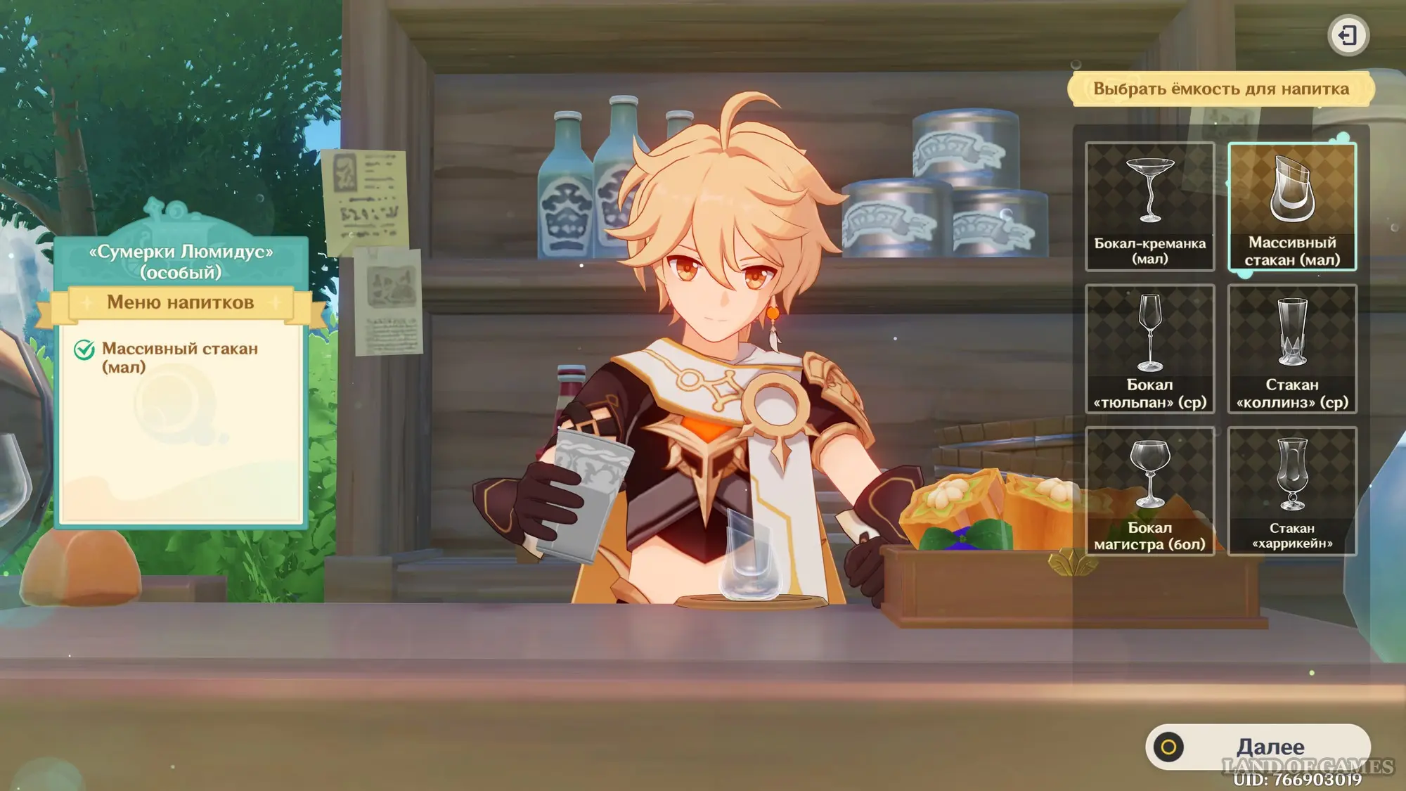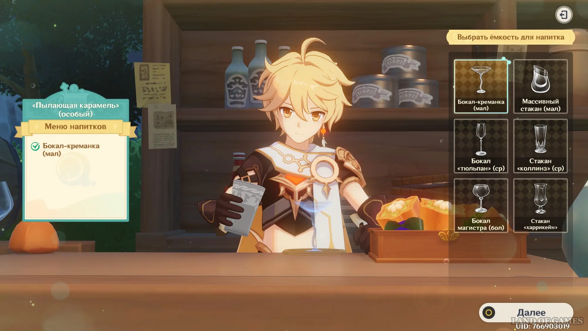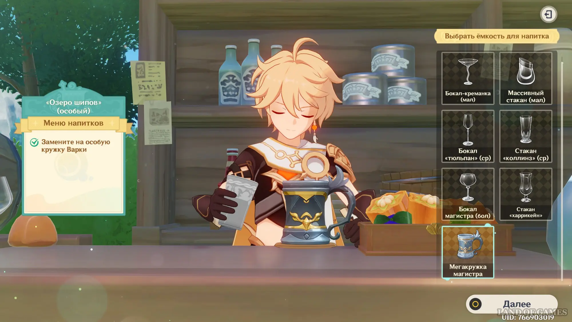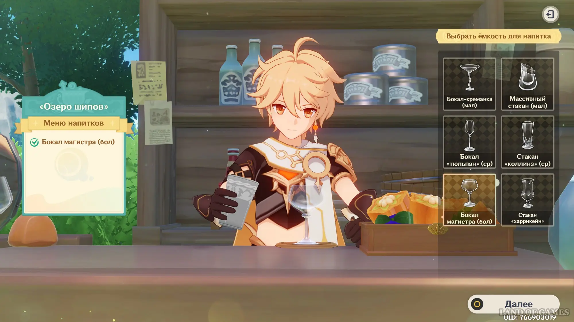 - Емкость для напитка: Бокал магистра (бол)
