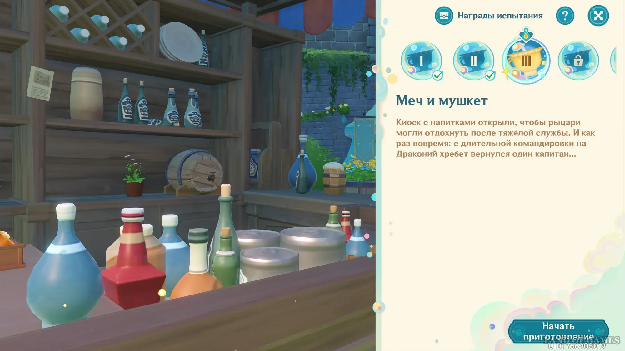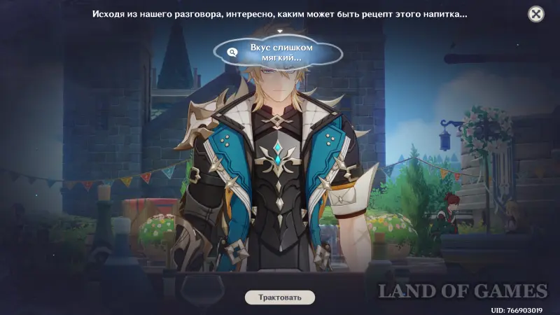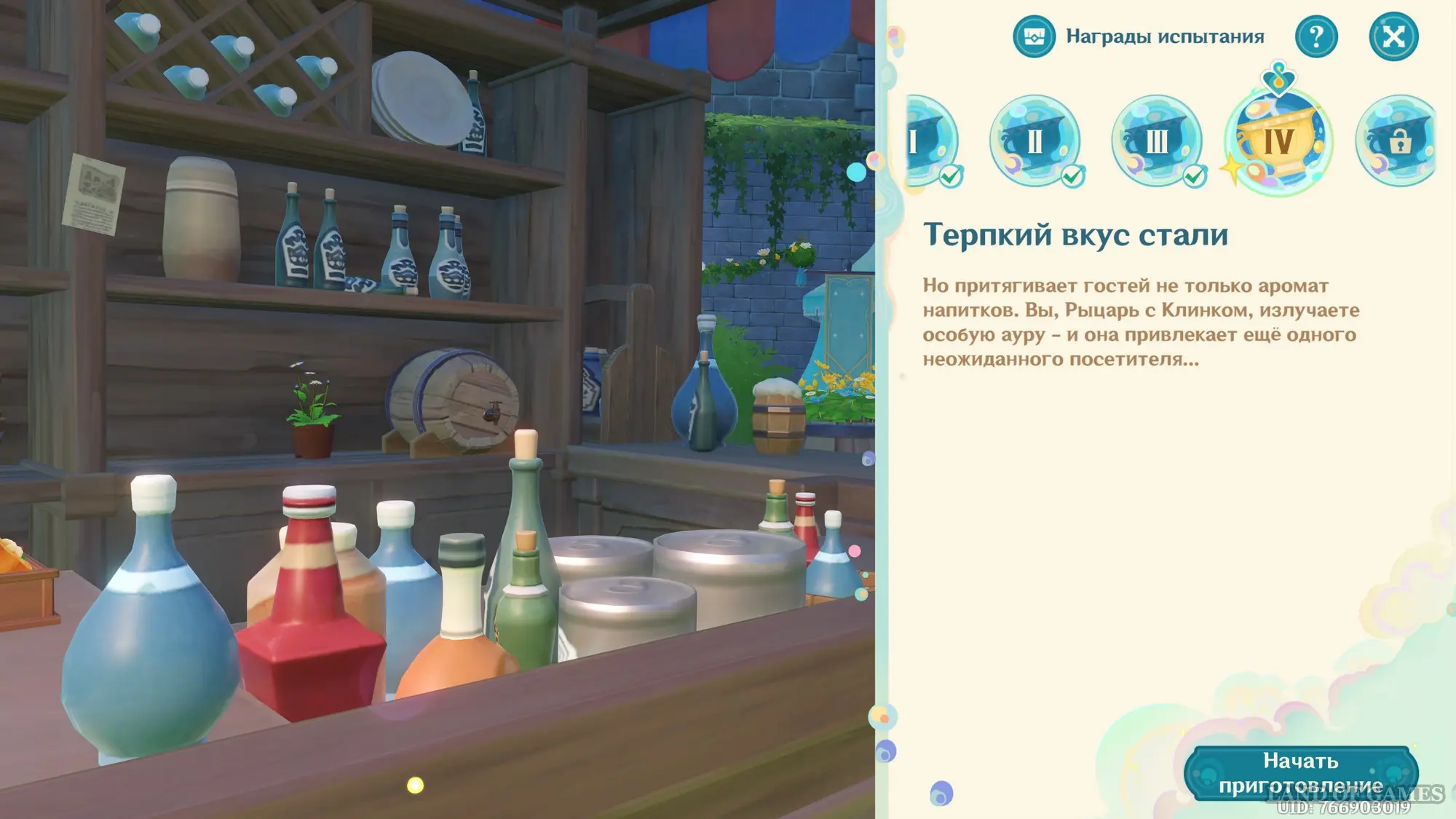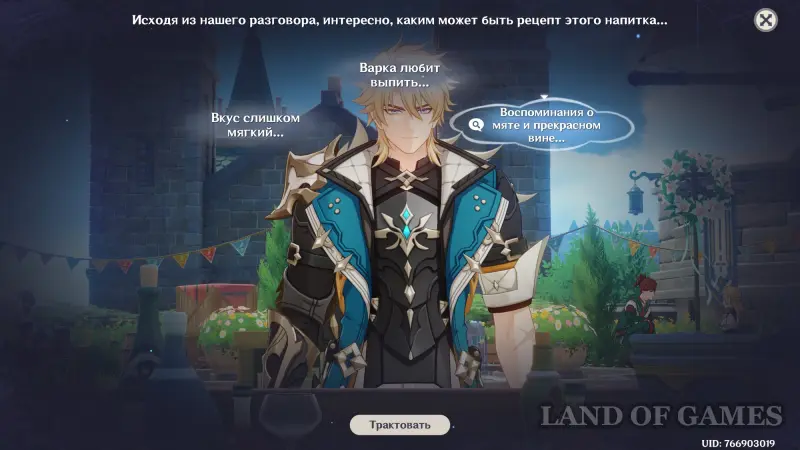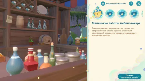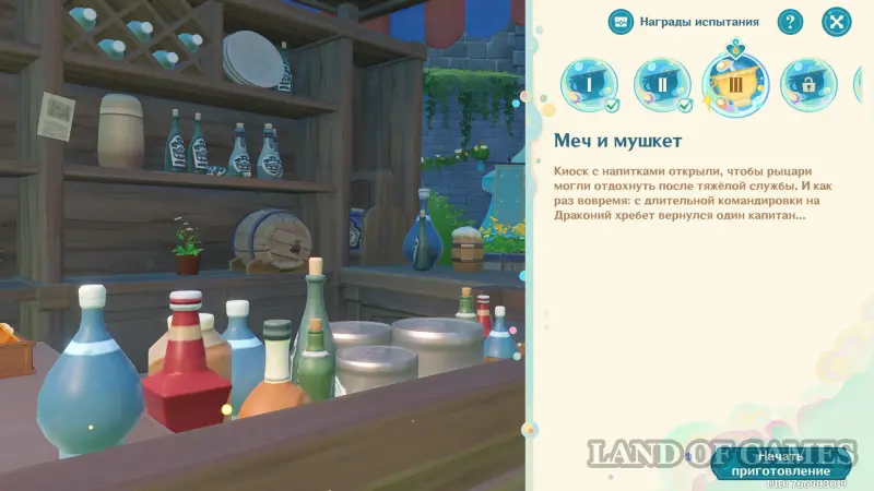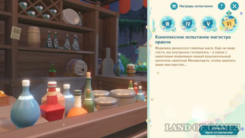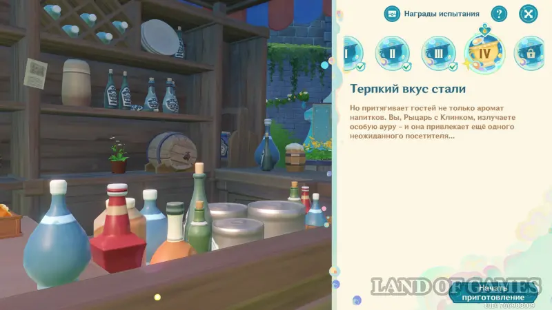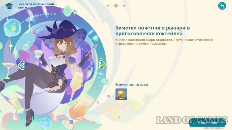 Первым делом вам нужно будет пройти сюжетное задание «Чужеземец, поймавший ветер», чтобы разблокировать доступ ко всем испытаниям главного ивента. Далее возьмитесь за выполнение стартовой миссии этой мини-игры под названием «Заметки почетного рыцаря о приготовлении коктейлей».