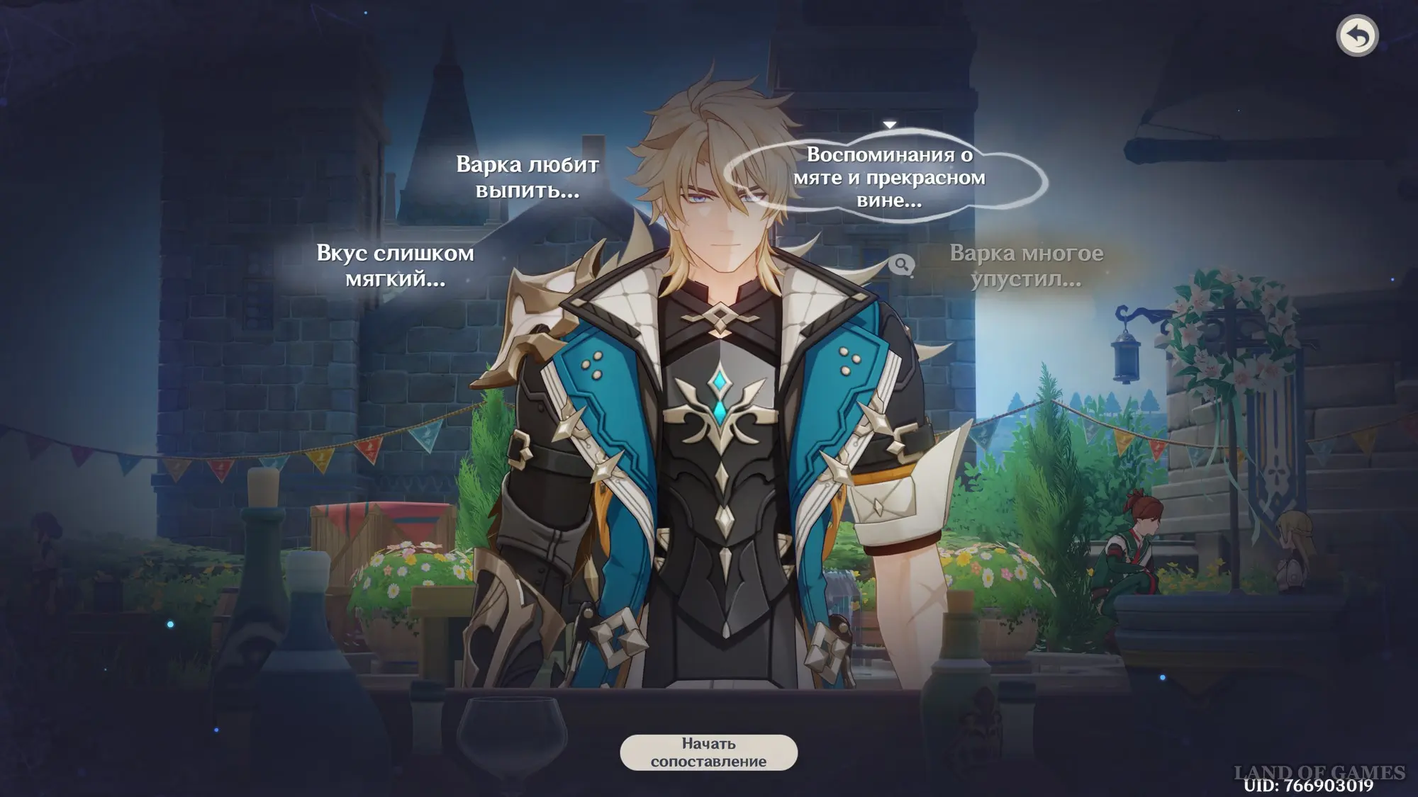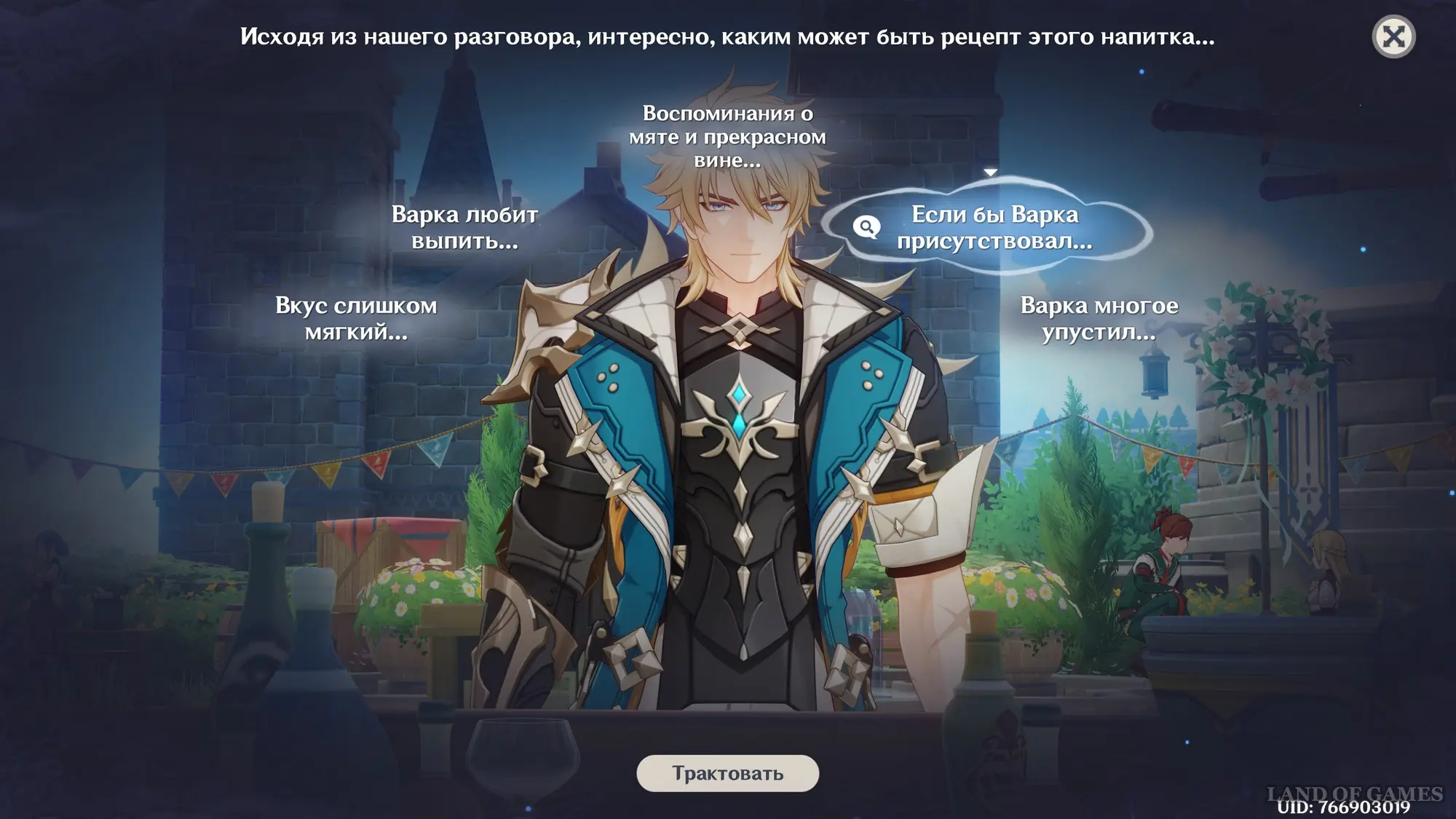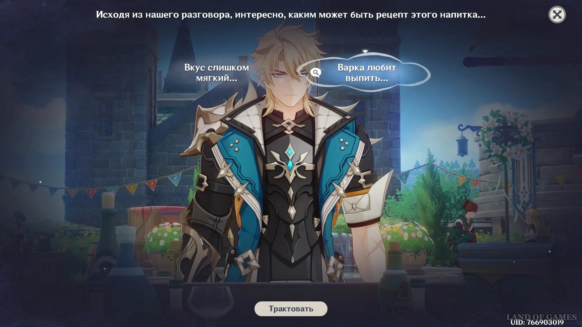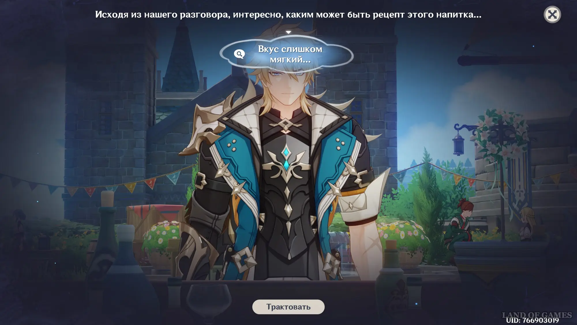 Первым делом вам нужно будет пройти сюжетное задание «Чужеземец, поймавший ветер», чтобы разблокировать доступ ко всем испытаниям главного ивента. Далее возьмитесь за выполнение стартовой миссии этой мини-игры под названием «Заметки почетного рыцаря о приготовлении коктейлей».