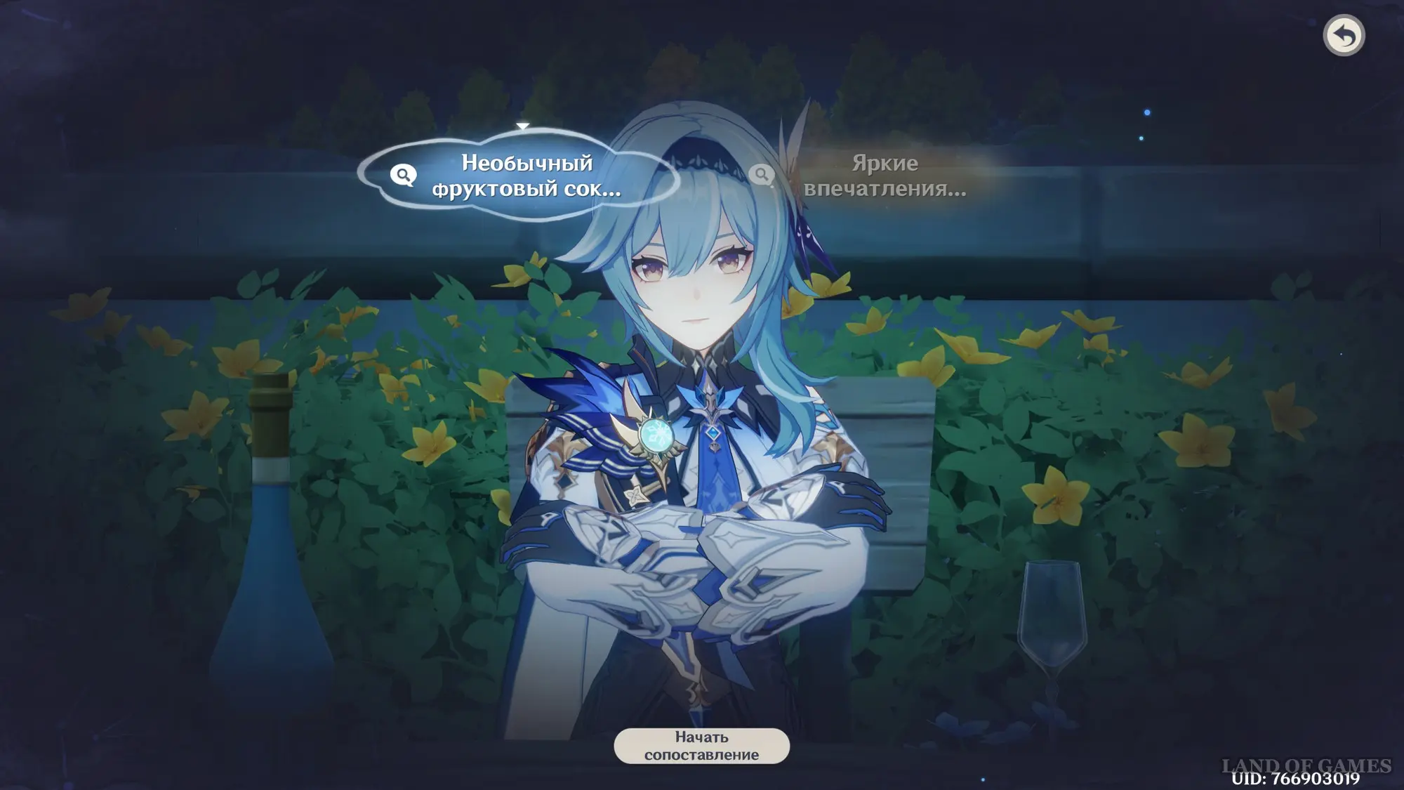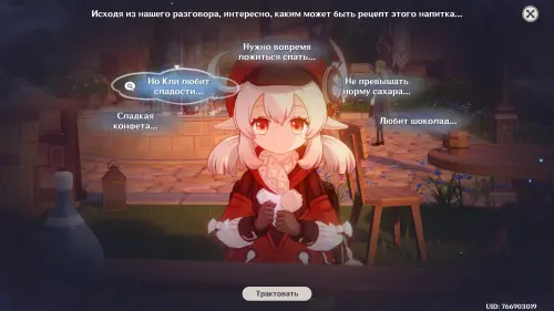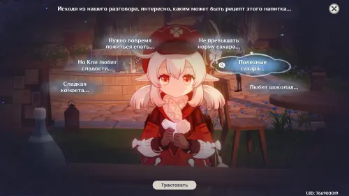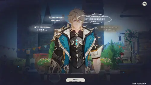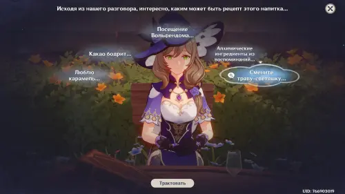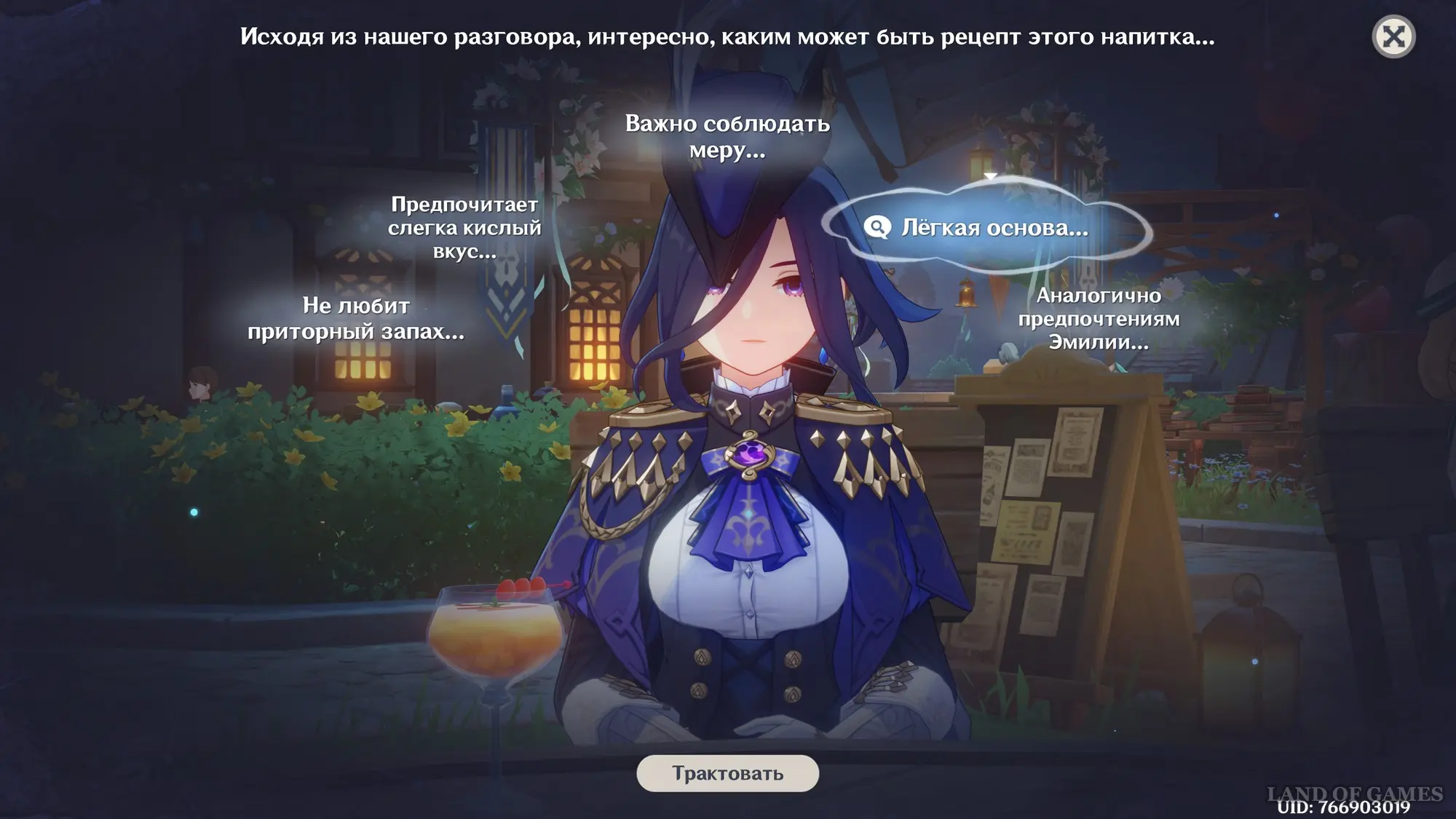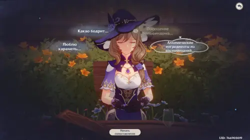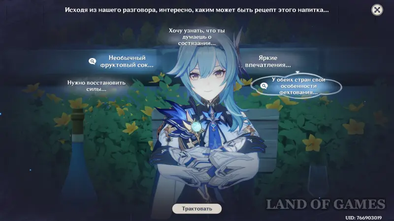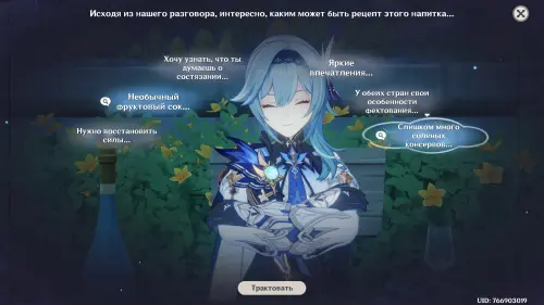 Тема для обсуждения: Другой гость из Фонтейна. Систематизируйте подсказки и трактуйте мысль «Аналогично предпочтениям Эмилии», а затем нажмите кнопку «Сопоставить» и соедините ее с облачком «Важно соблюдать меру», чтобы открыть новую мысль «Легкая основа» (трактуйте ее). В итоге вы получите новую тему для разговора: «Стиль Эмилии».