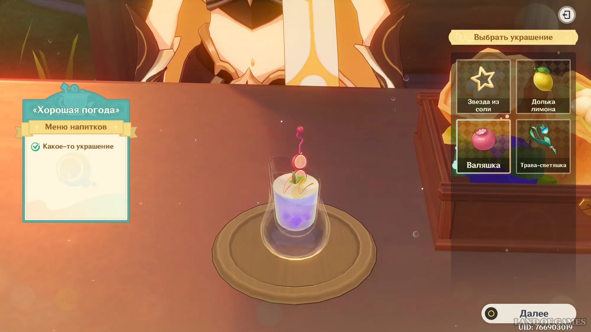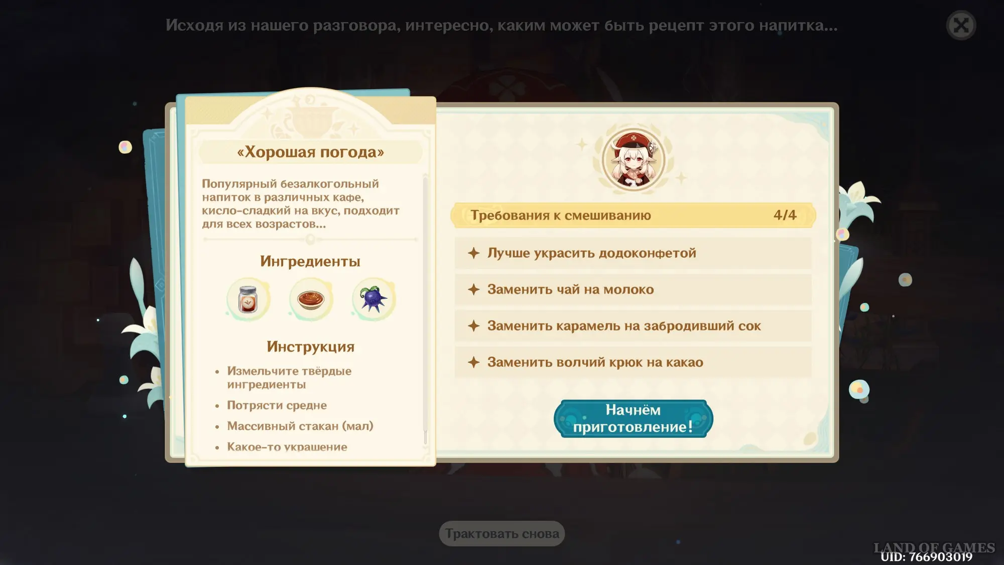 Взаимодействуйте с киоском и примитесь за прохождение второго этапа. Далее возьмитесь за приготовление напитка «Хорошая погода» для Кли: