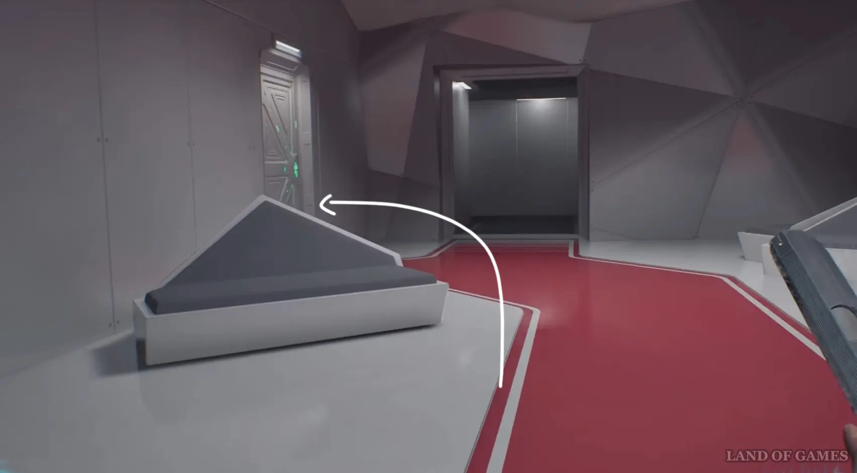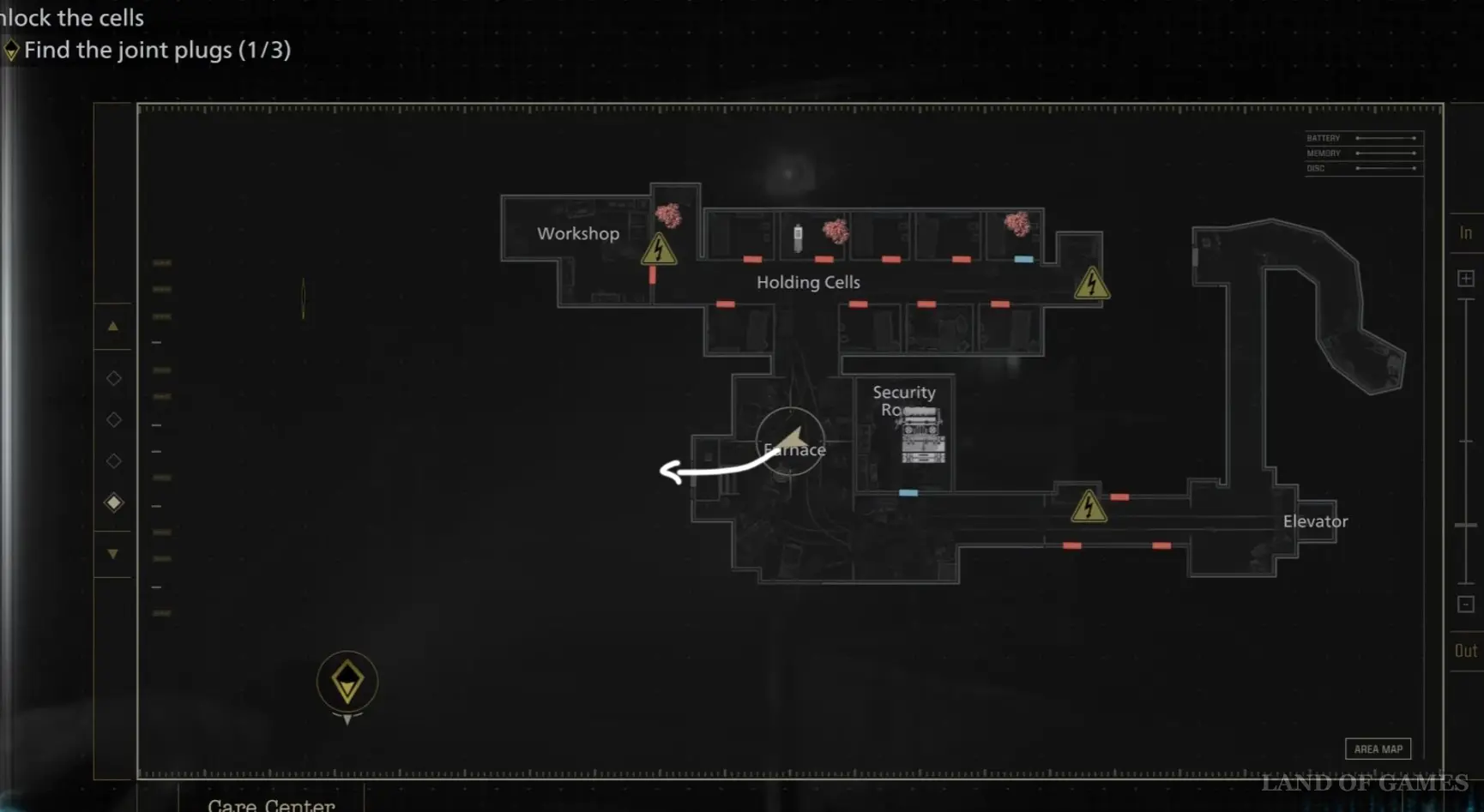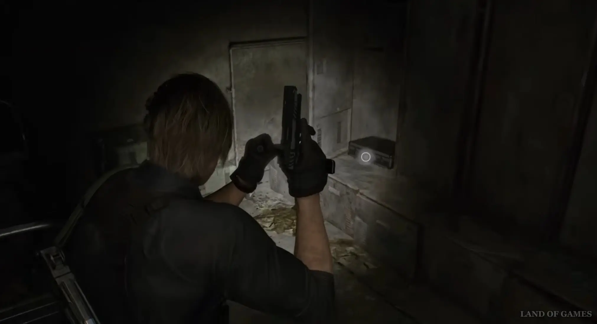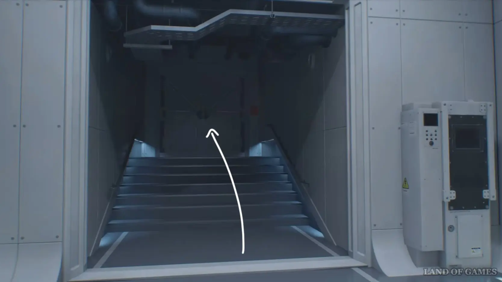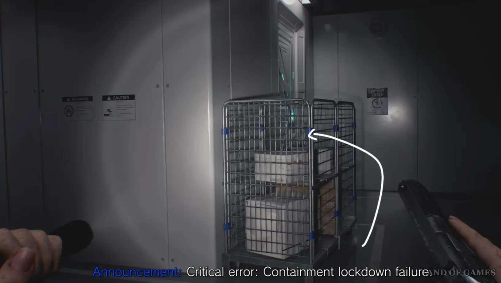Доберитесь до Ковчега (ARC), играя за Грейс, и пройдите во вход в лабораторию с точкой сохранения. Затем сверните вправо, идите через дверь и двигайтесь до конца комнаты, чтобы повернуть в левый проход. Здесь вы впервые столкнетесь с лизуном. Пригнитесь, обойдите монстра и дойдите до сейфа, стоящего на столе.