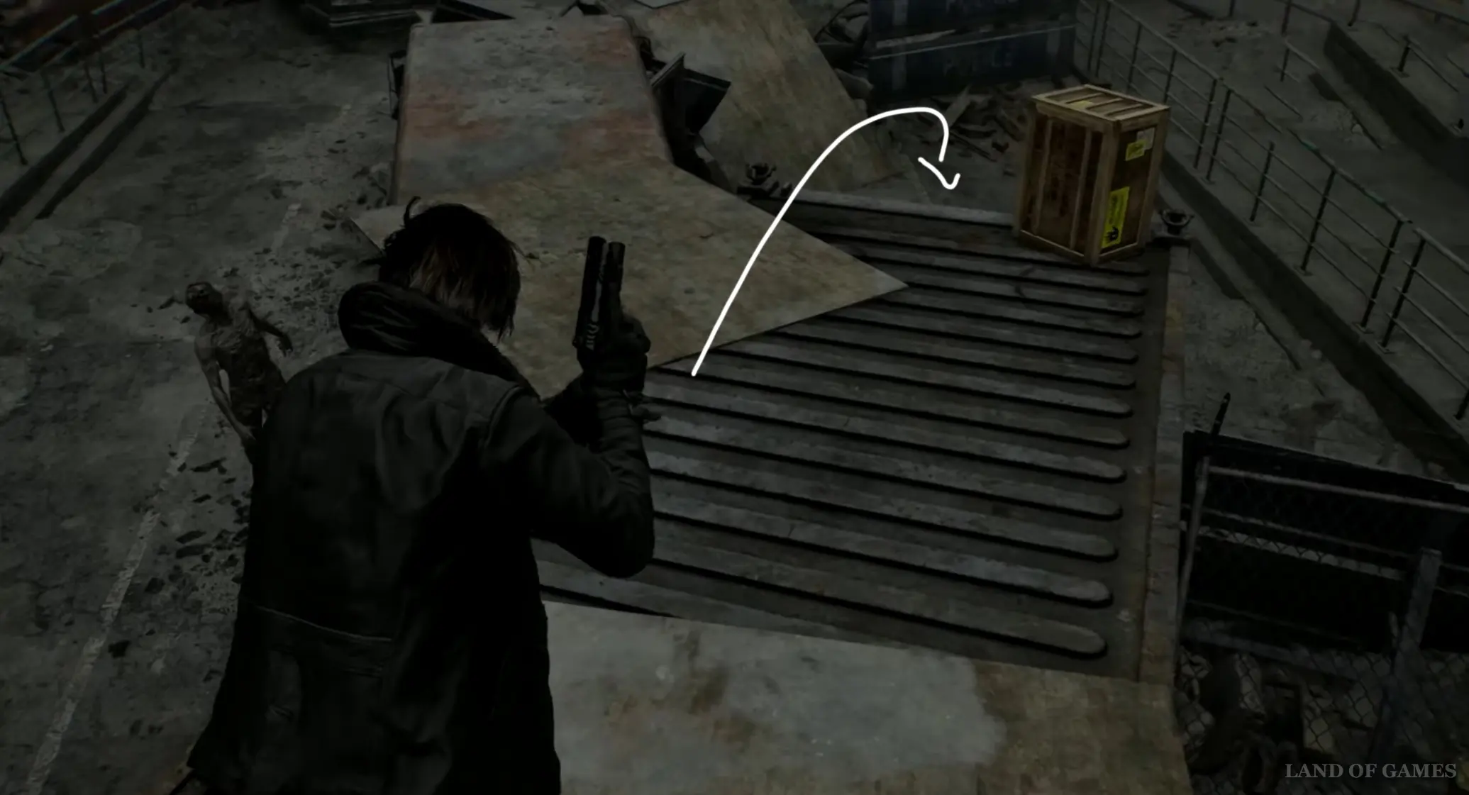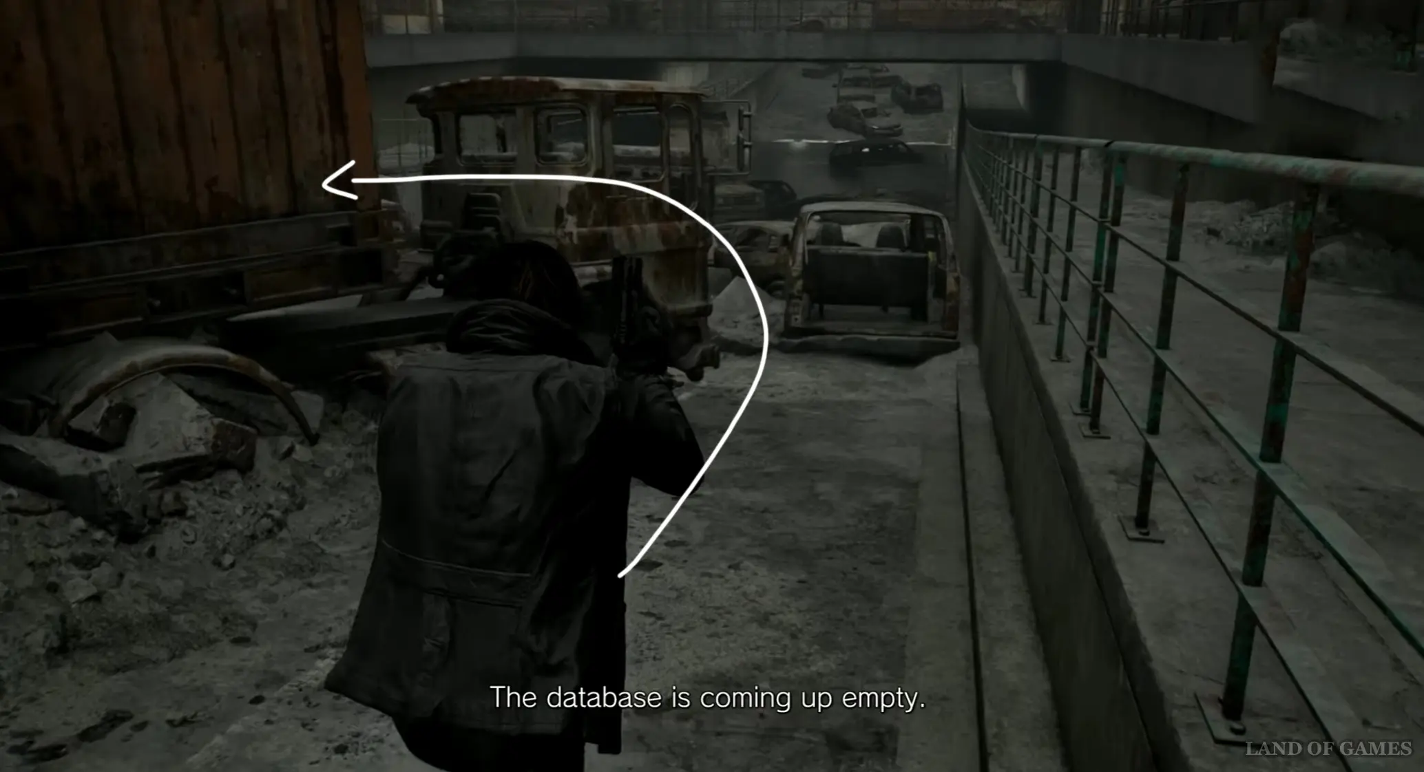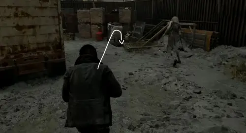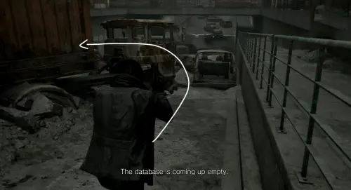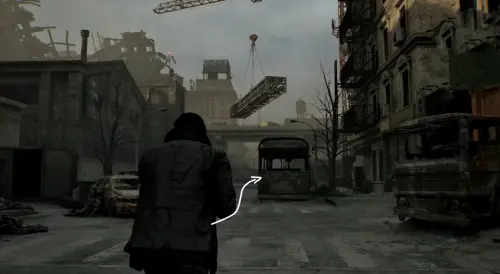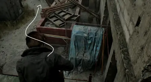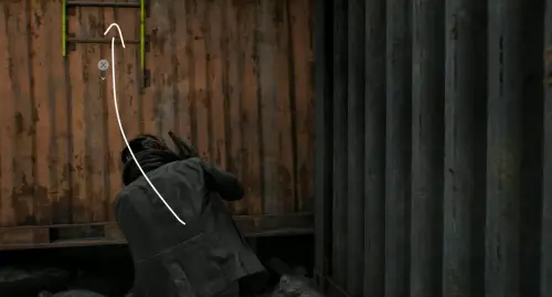 После нахождения ключа начните идти по главной дороге, расположенной между заправкой и квартирным комплексом «Кедровый ручей», на восток, в сторону большого скопления машин. Затем начните спускаться вниз по шоссе, и сверните дважды влево возле кабины грузовика. Обойдите его кузов и заберитесь на оранжевый контейнер по желтой лесенке.