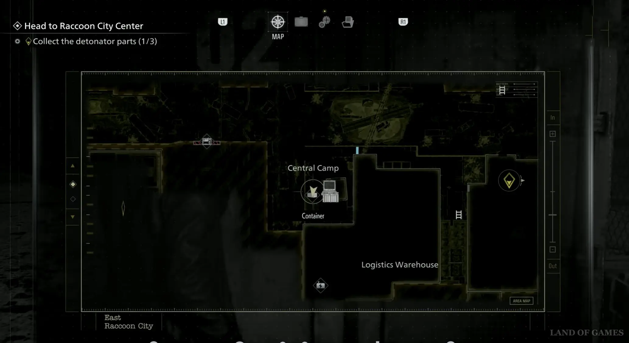 От предыдущего контейнера возвратитесь назад, пройдите мимо Склада на юге и взаимодействуйте с трансформатором, огороженным решетчатым забором, чтобы активировать кран и опустить мост через провал – пройдите по нему на другую сторону. Далее сверните налево и возвратитесь в Центральный лагерь.