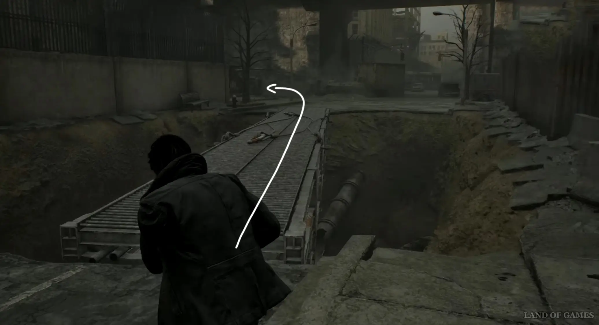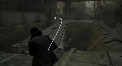 Забравшись на строительные леса, тут же спрыгните с них вниз, а потом двигайтесь вперед, держась правой стороны, и вскоре вы обнаружите открытый люк в земле – спуститесь туда, чтобы попасть в канализацию. Сразу же развернитесь, бегите по тоннелю вперед и сверните в первую дверь слева. Войдя в небольшую комнатушку, спрыгните в очередную дыру на полу, чтобы оказаться в метро.