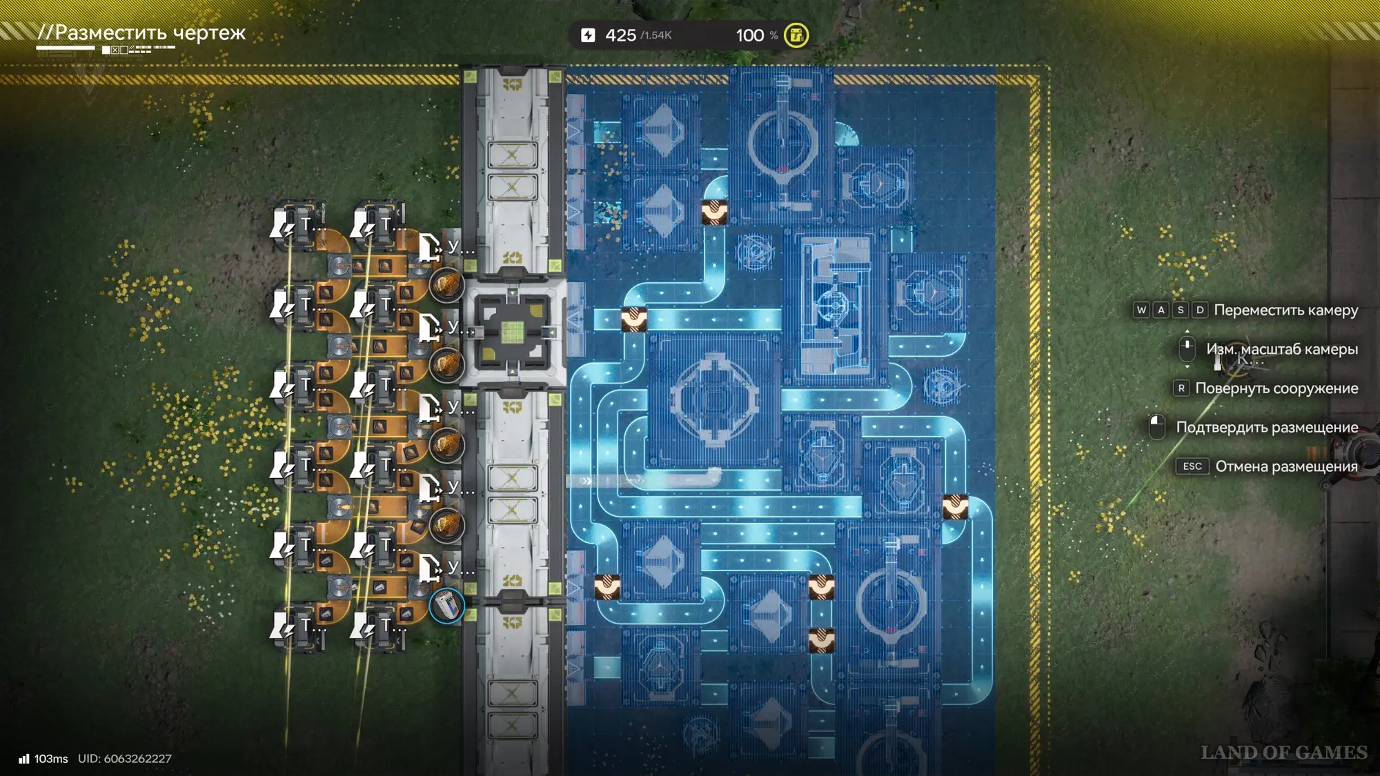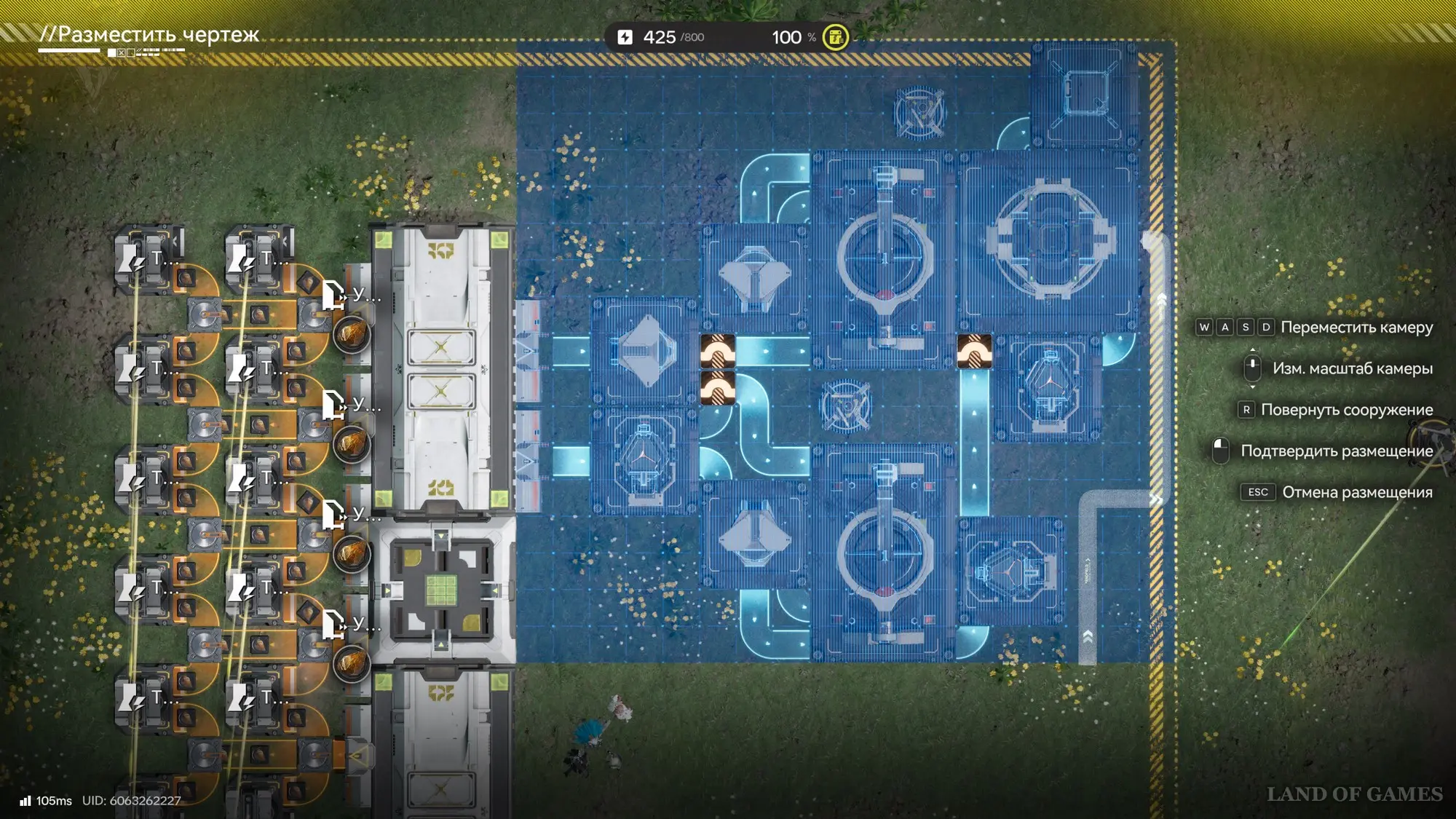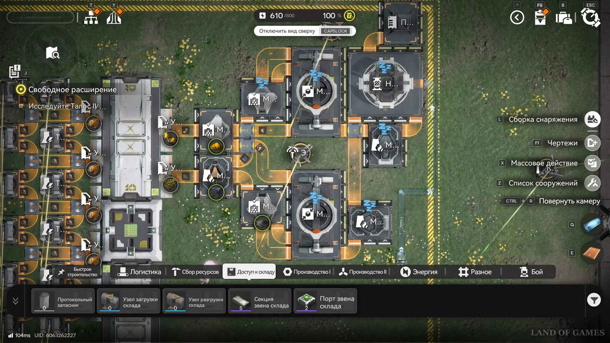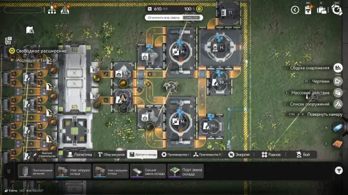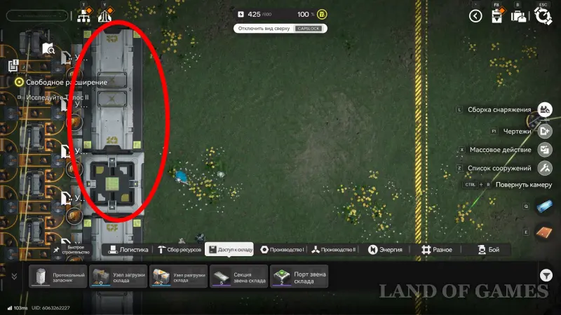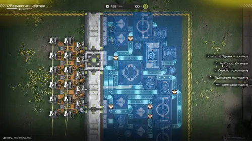 Заранее отметим, что данная конвейерная линия требует много свободного пространства и энергии, поэтому позаботьтесь о выработке большего количества электричества и расширении ключевой зоны АПК. Выполнив все условия, выберите соответствующую схему в разделе чертежей, а потом разместите производственный комплекс рядом со звеном склада и рекой, как показано на скриншоте ниже.