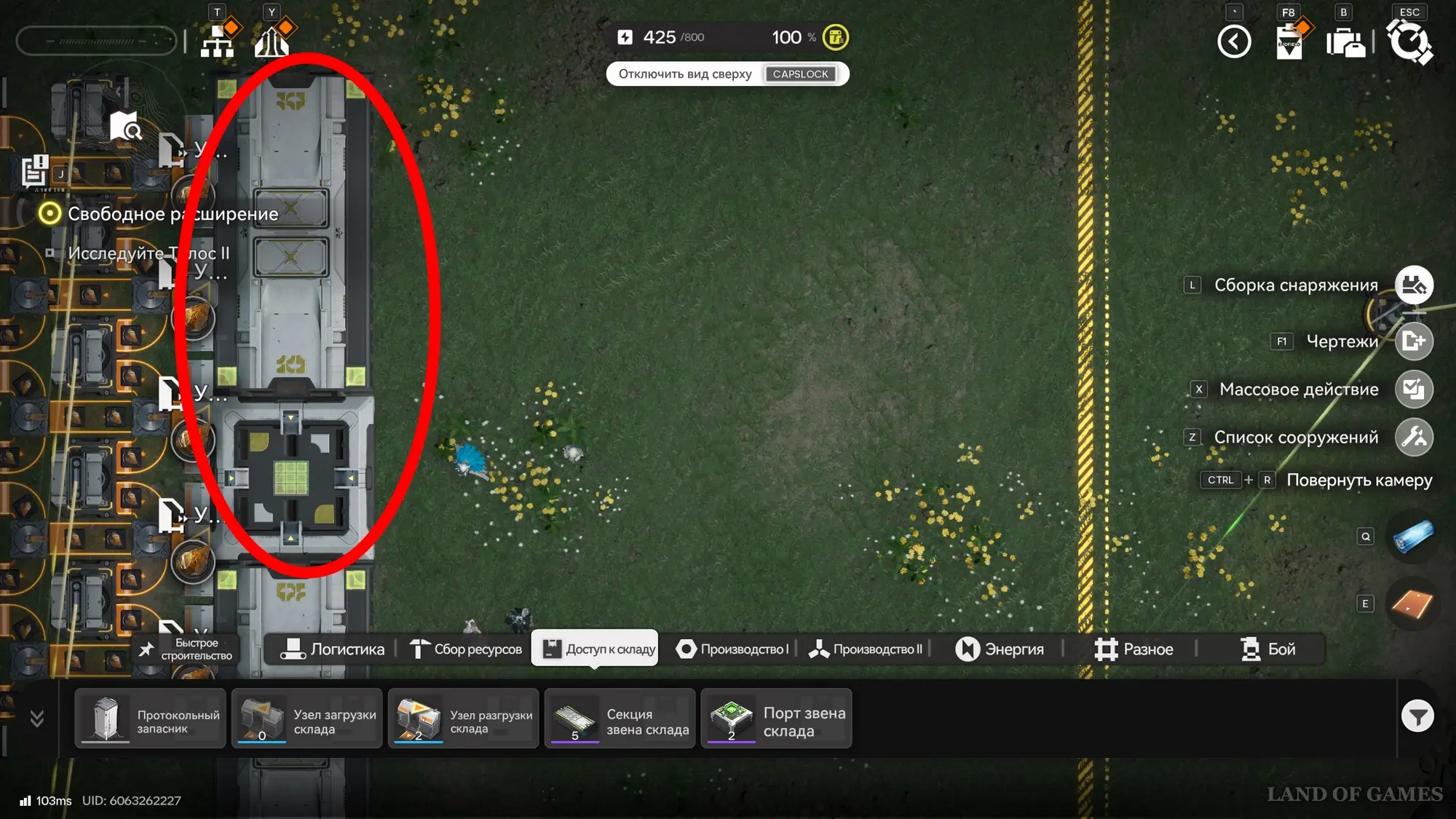 Подготовив все необходимые материалы и оборудование, первым делом установите секцию и порт звена склада рядом с рекой на севере, как продемонстрировано на скриншоте ниже. Но не размещайте слишком близко к границе, иначе у вас потом не хватит места для производственной цепочки.