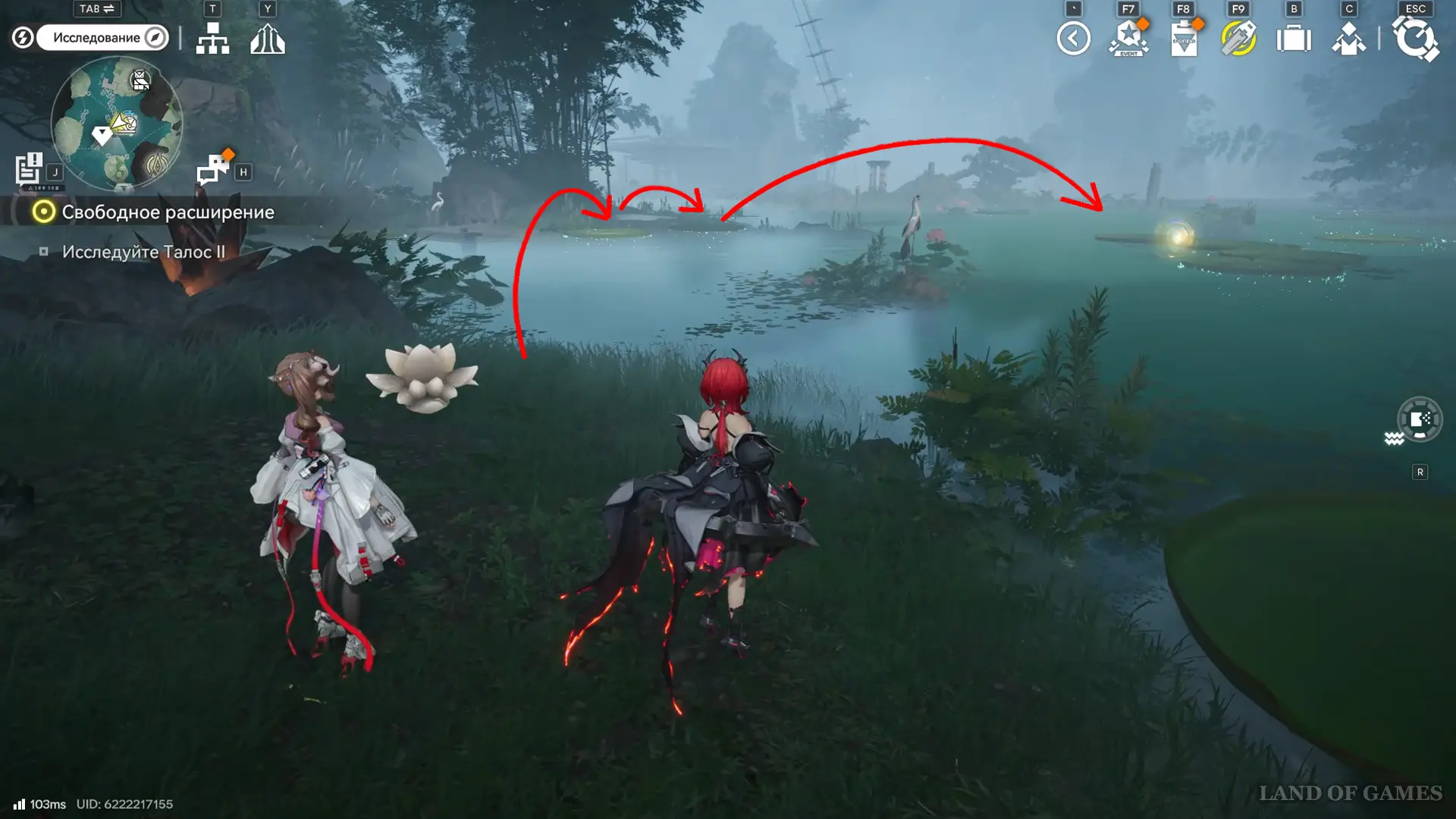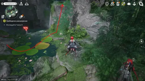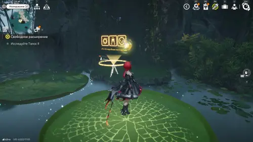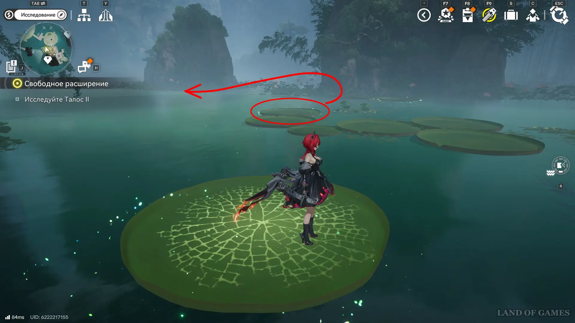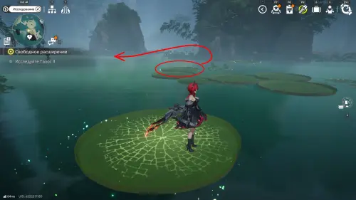 Переместитесь к точке ТП на севере от топи Омовения клинков и перепрыгните на ближайшую подвижную кувшинку, а доплыв до центра водоема, встаньте на ту, что слева и не спрыгивайте, пока не доберетесь до края скалы с очередным ауриленом.