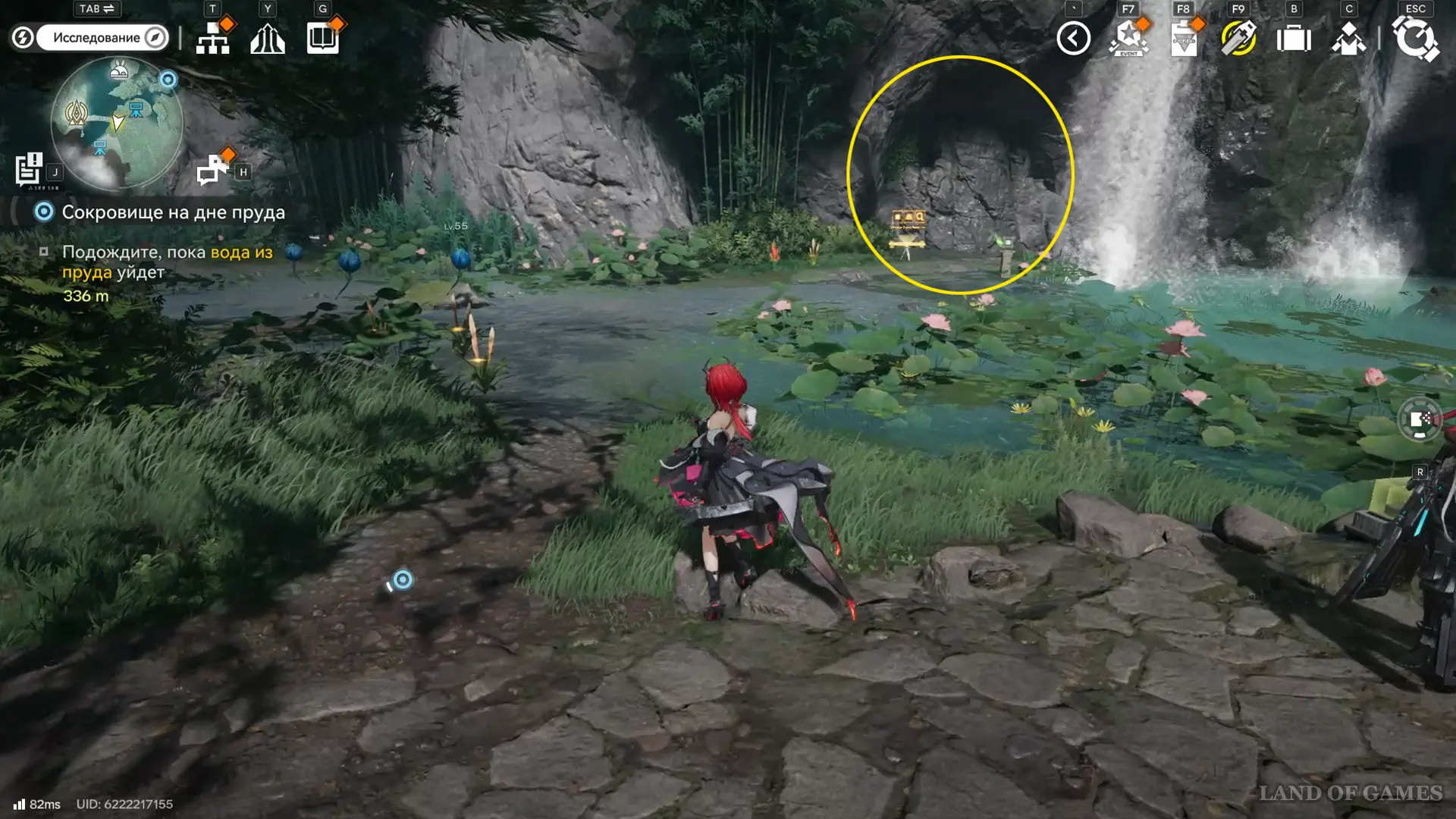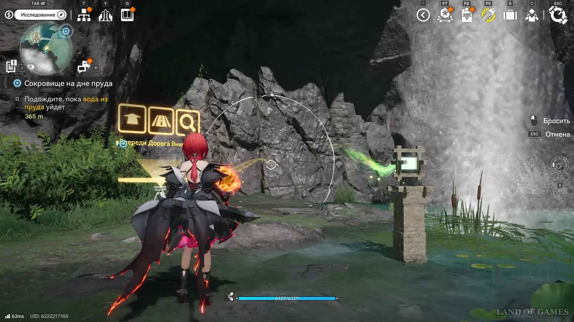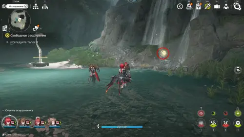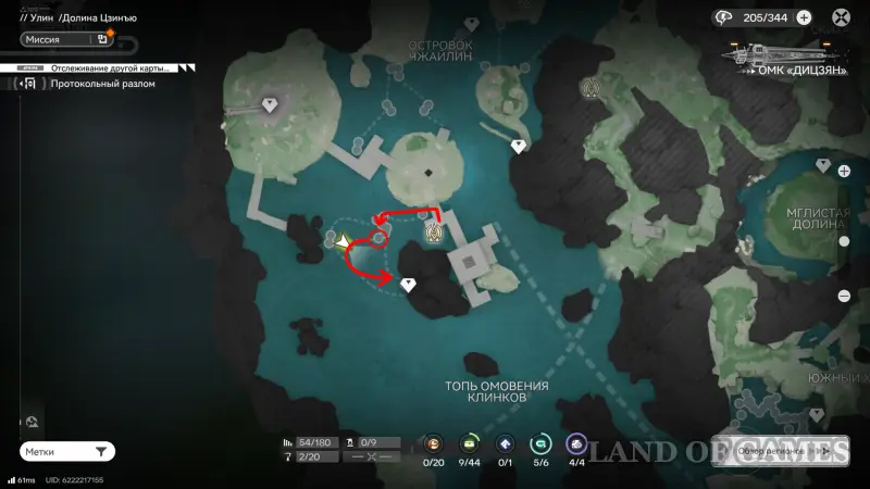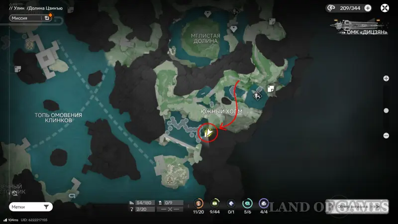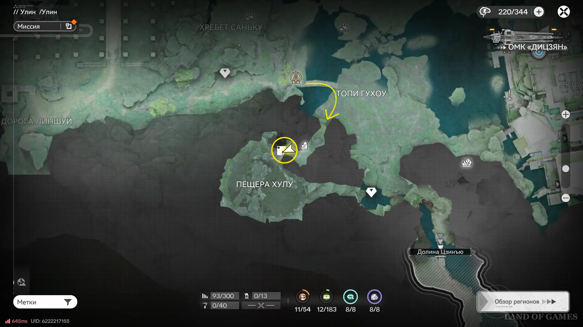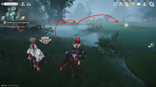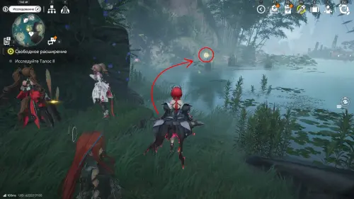 Далее переместитесь к топям Гухоу, а затем бегите через мелководное болото на юго-запад. В указанном на скриншоте выше месте есть оптический туман, за которым находится вход в пещеру Хулу — пройдя глубже, вы увидите 2-ю сферу, которую нужно догнать.
