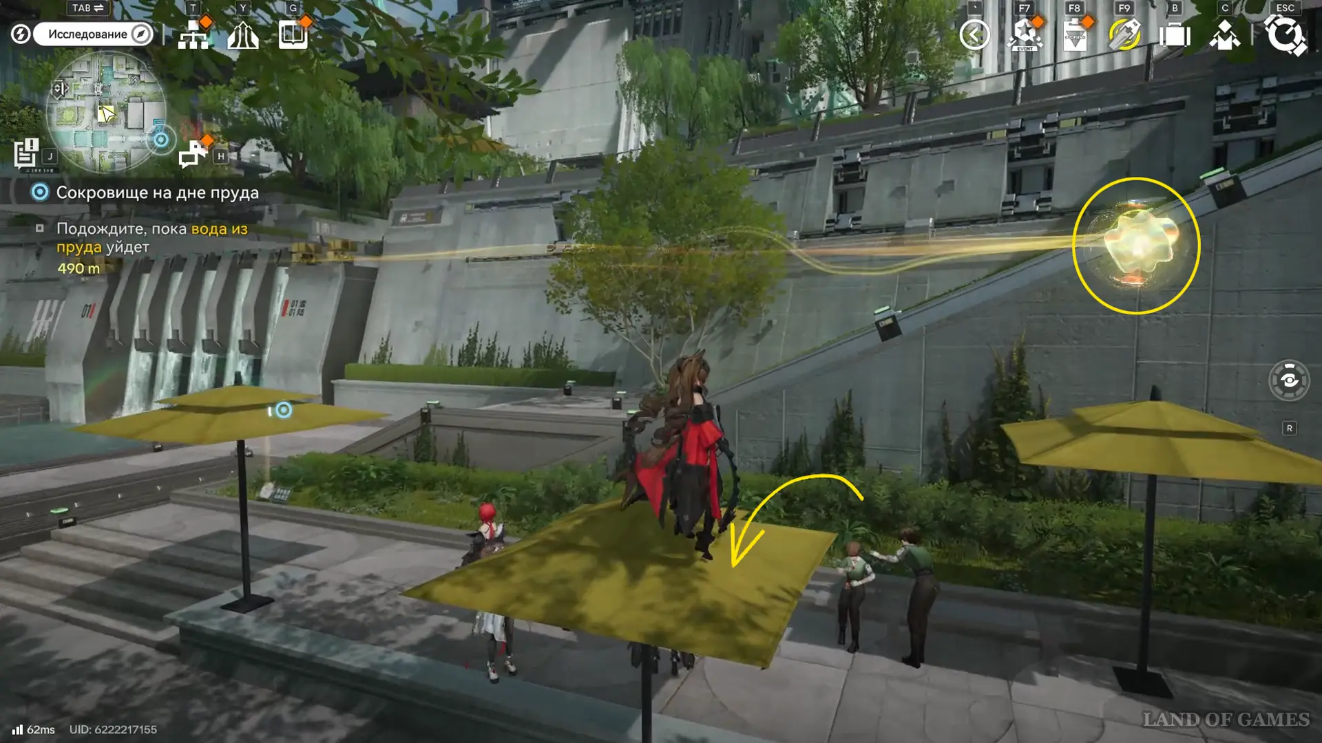 Чтобы забрать аурилен на зонтике во дворе к югу от Ксиранитового канала, поднимитесь на третий этаж по лестнице, что западнее двора (ориентируясь на метку с совой), а затем спрыгните к месту сбора трофея.