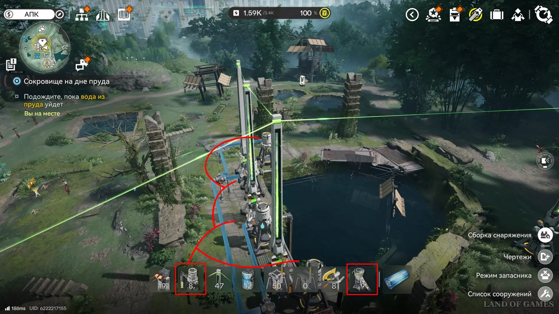 - Разместить по периметру пруда как можно больше гидронасосов и запитать их ксиранитовыми пилонами (убедившись, что они соединены общей сетью с АПК);