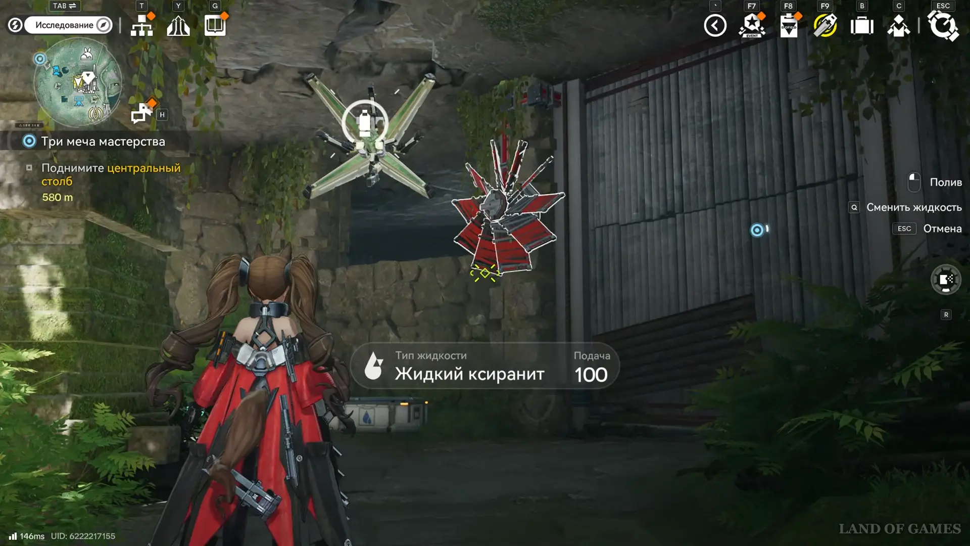 Когда начнете спускаться, на пути появится пропеллер с красными соплами — достаньте спрей и полейте его любой жидкостью. Пройдите внутрь, поверните налево и сразу повторите действие со вторым винтом. Затем двигайтесь вперед и еще раз полейте пропеллер, отвечающий за спуск платформы. Вовремя запрыгните на нее и подберите последний аурилен.
