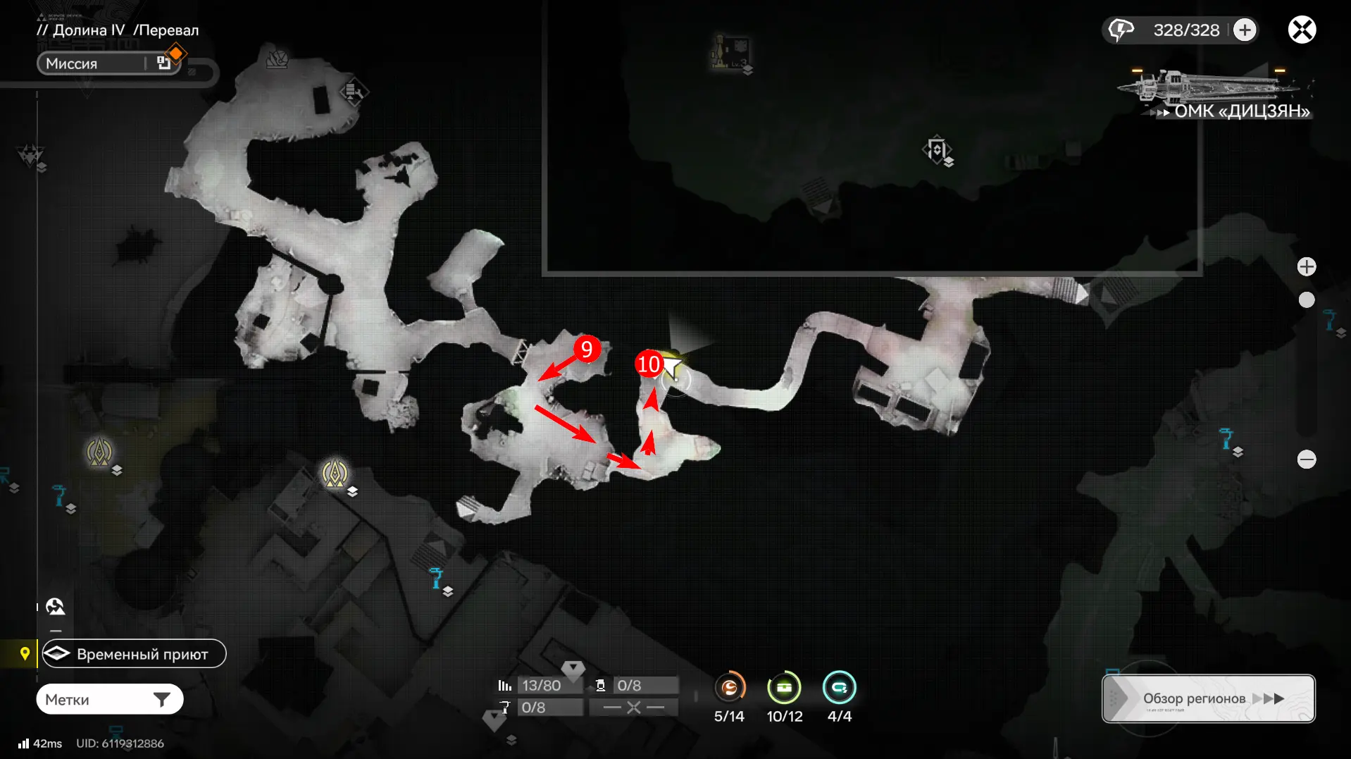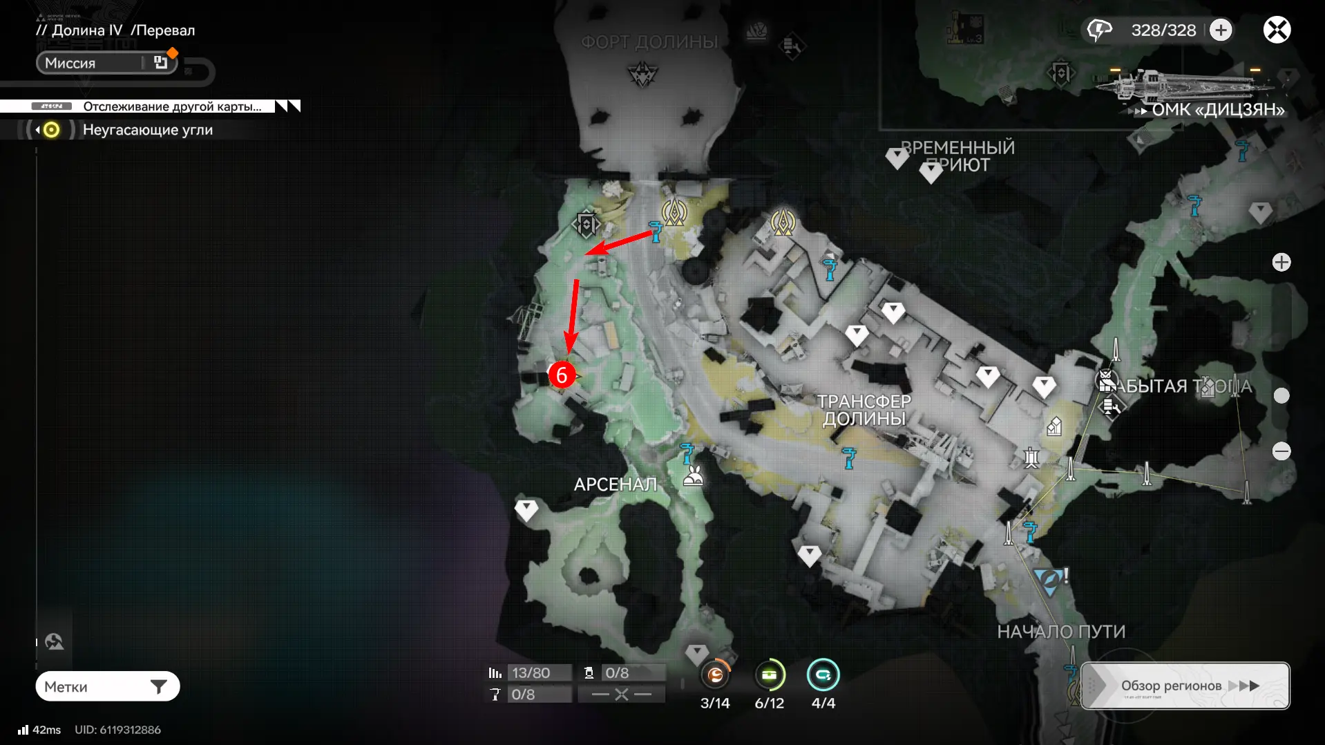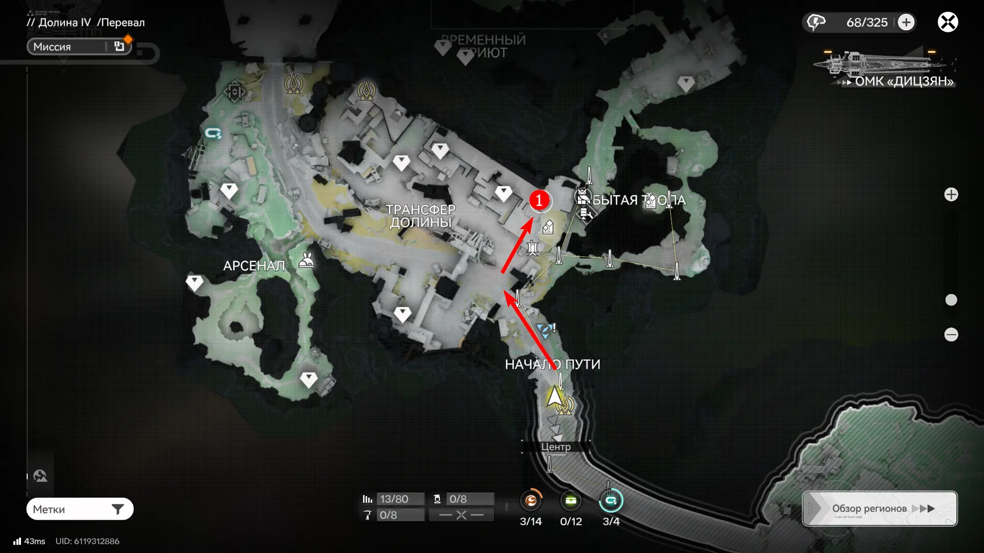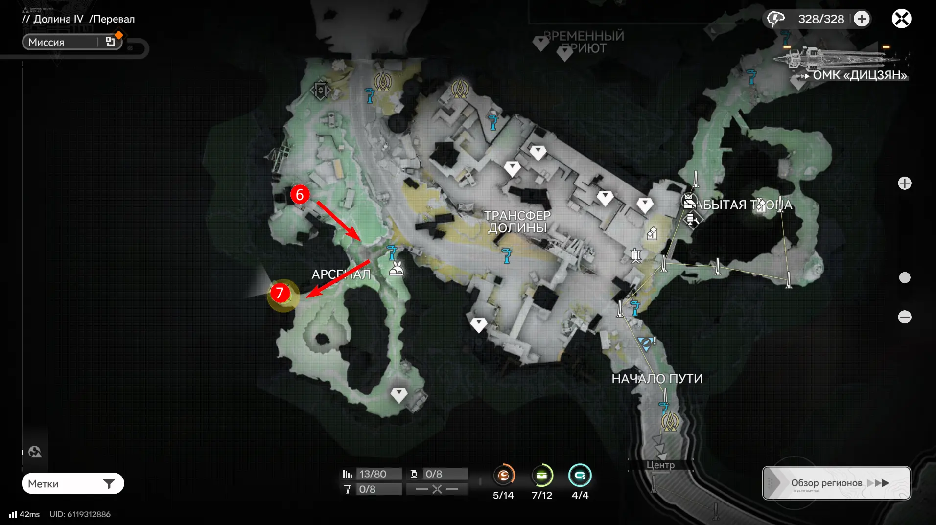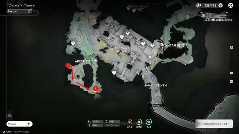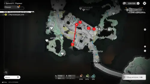 Всего на территории можно отыскать 12 ящиков ресурсов разной ценности, которые отмечены на карте порядковыми номерами. Собирать их можно в любой последовательности, но стрелками указан кратчайший маршрут. О том, как отыскать каждый из сундуков с ороберилами, расскажем далее.