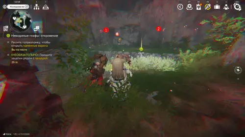 Используя дымку Землекрушителей, откройте их потайную пещеру, используя специальные рычаги в таком же порядке, как на скриншоте: сначала устройство с глифом солнца, затем дождя и человечка. Внутри обнаружите ценный ящик с припасами.