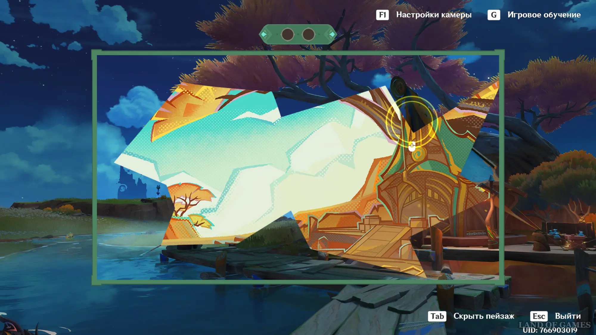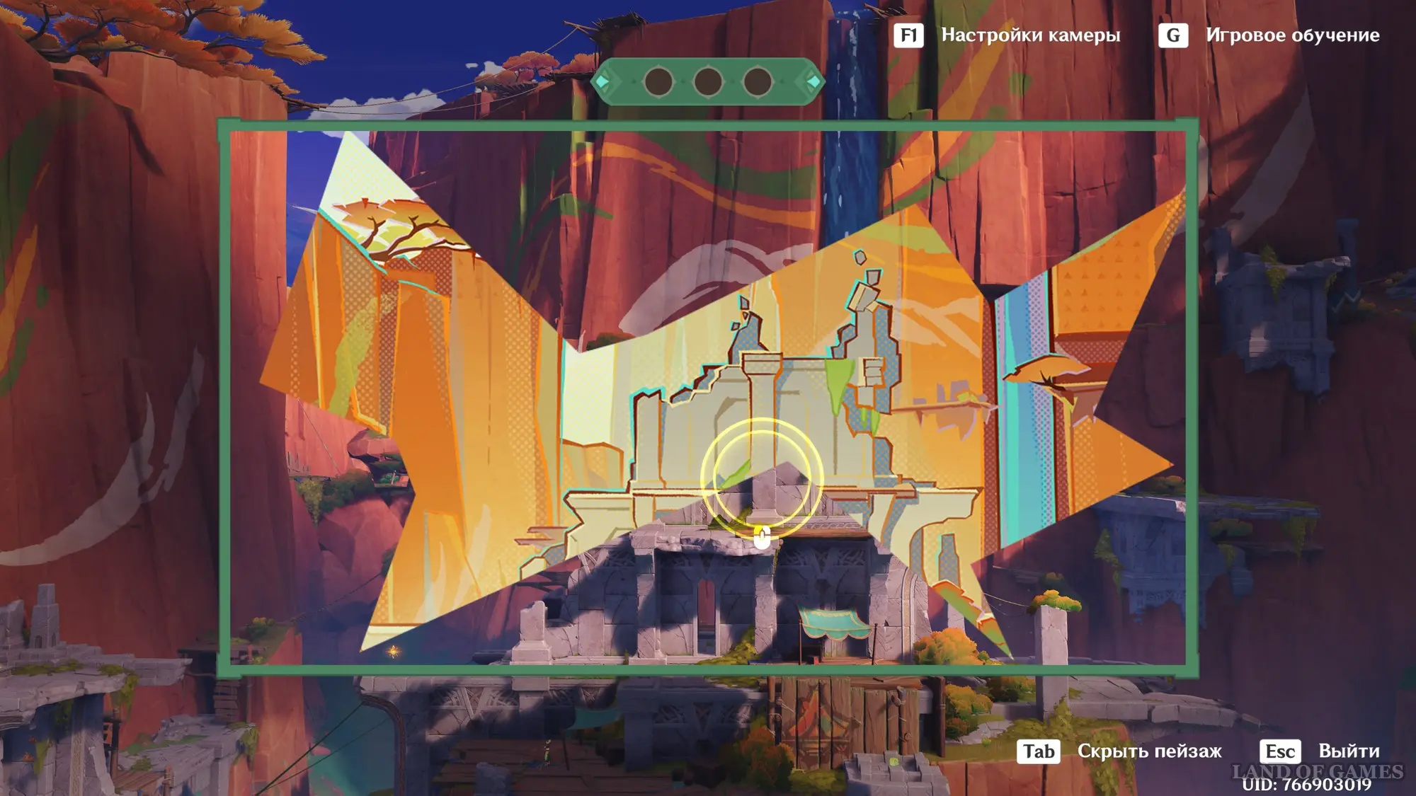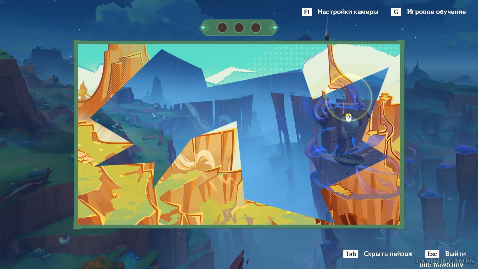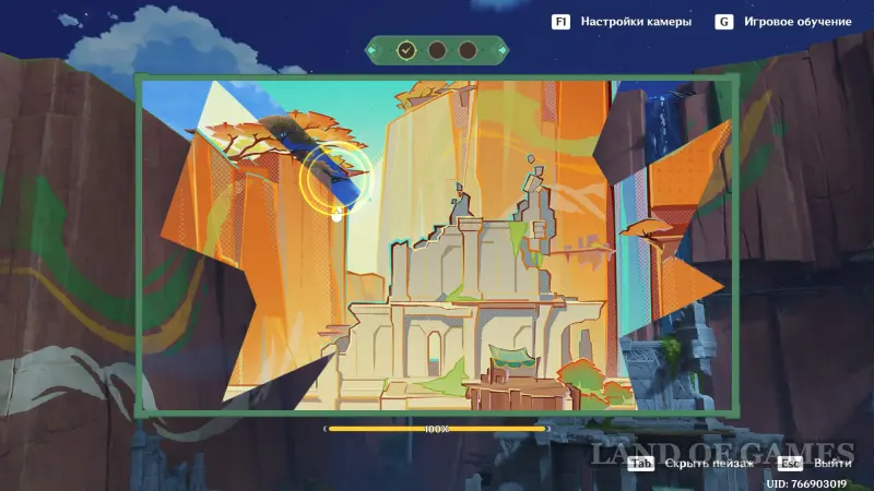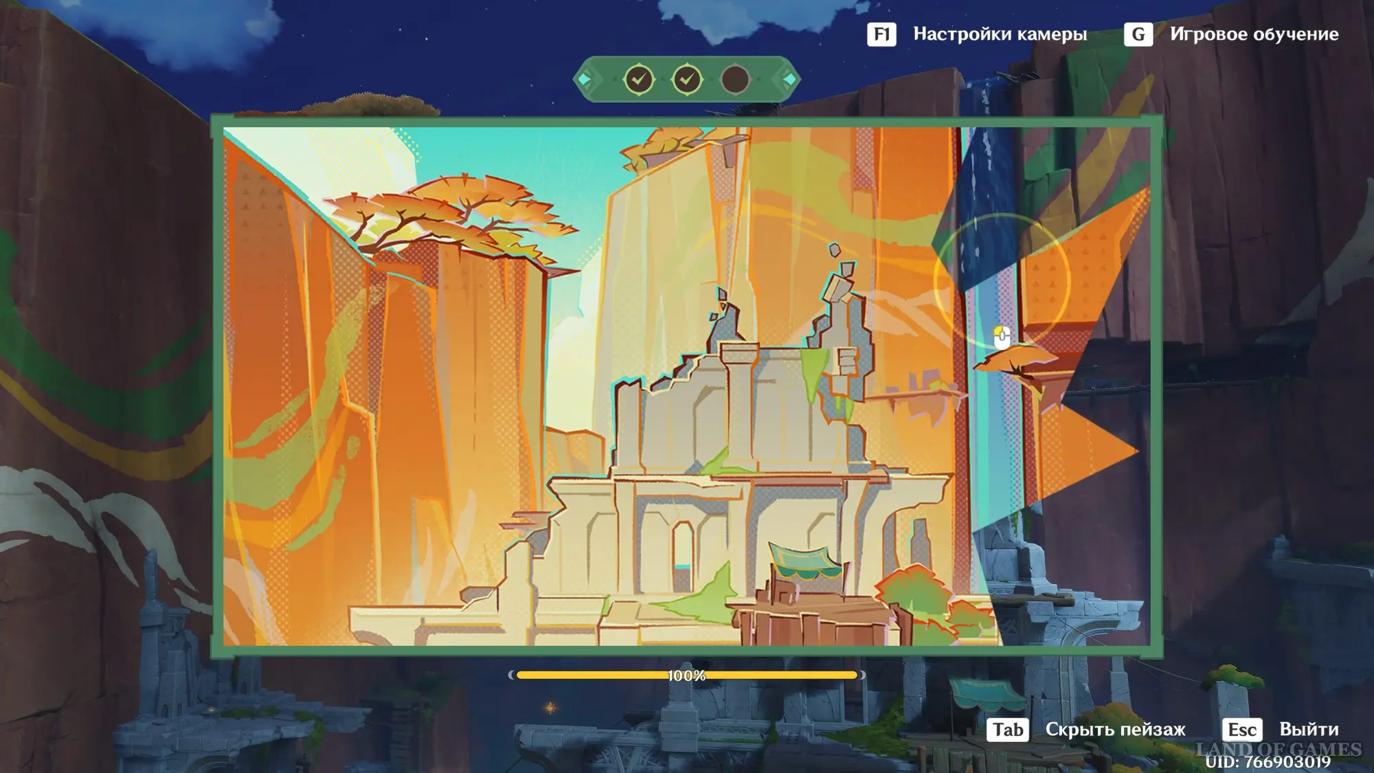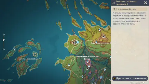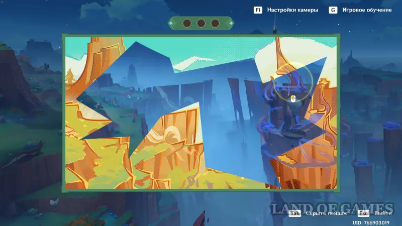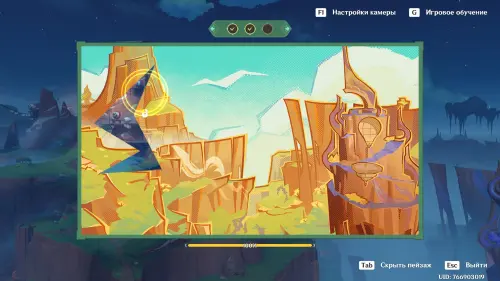 Телепортируйтесь к статуе Пиро Архонта на утесе Куауакан, а затем поднимитесь на вершину скалы, встаньте в подсвеченном месте и начните любоваться красотами. Вначале поверните камеру вправо и вниз в сторону поселения Повелителей ночного ветра, и нажмите ЛКМ, когда замигает экран.