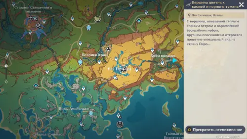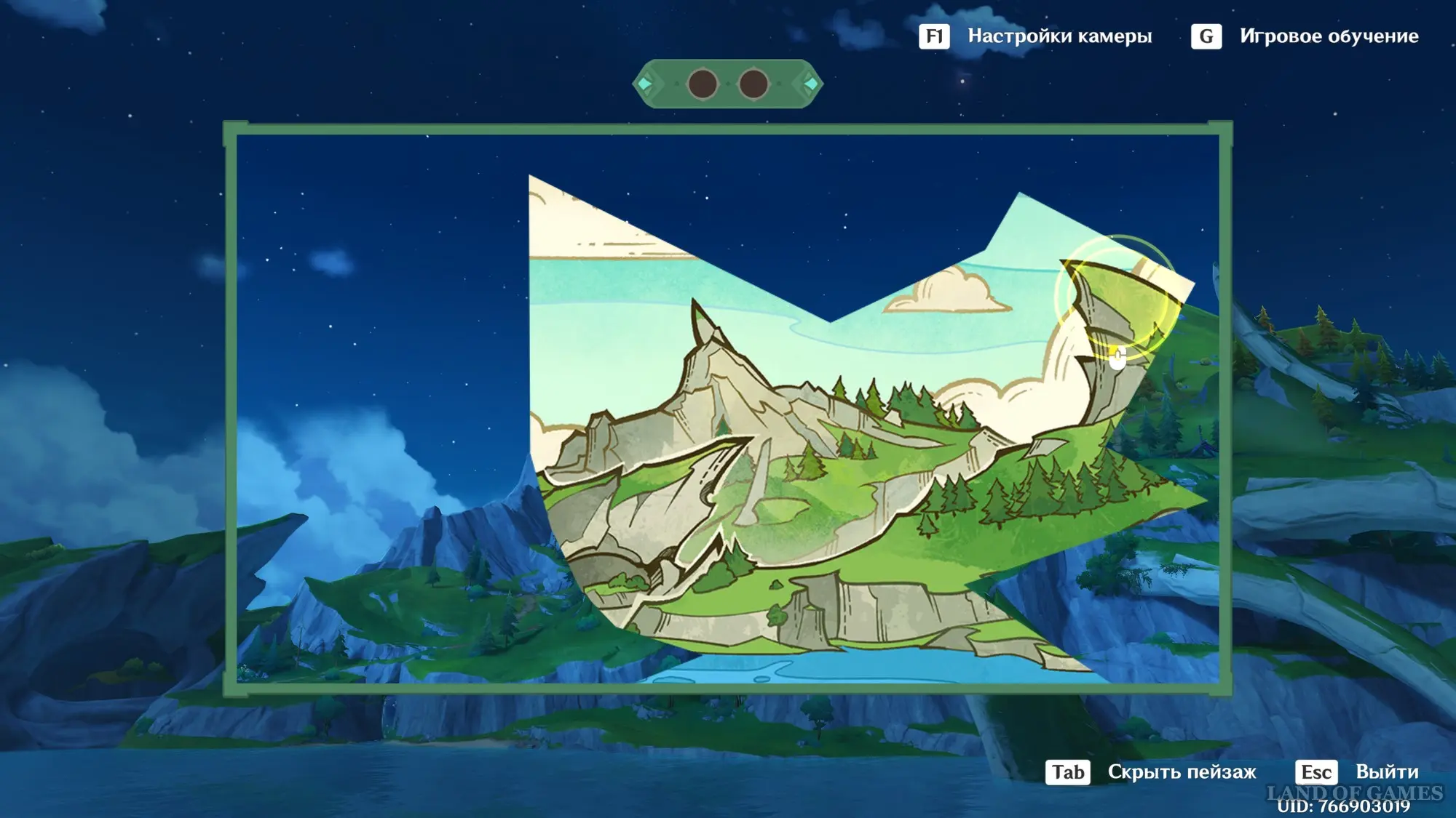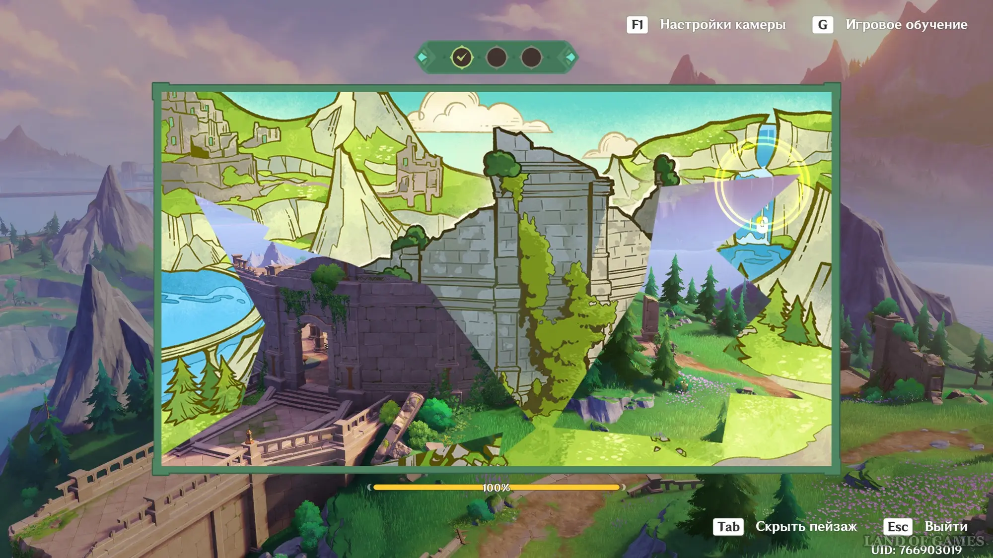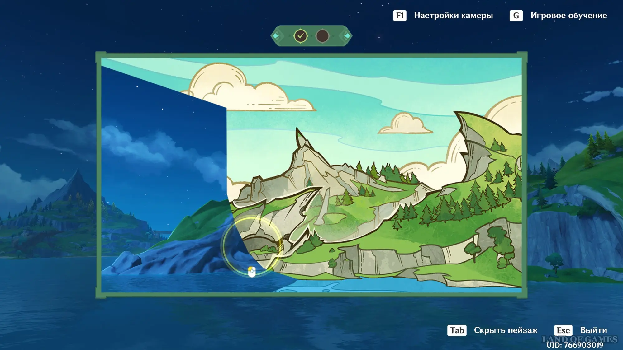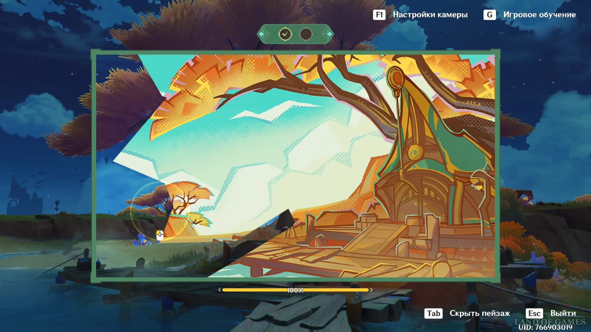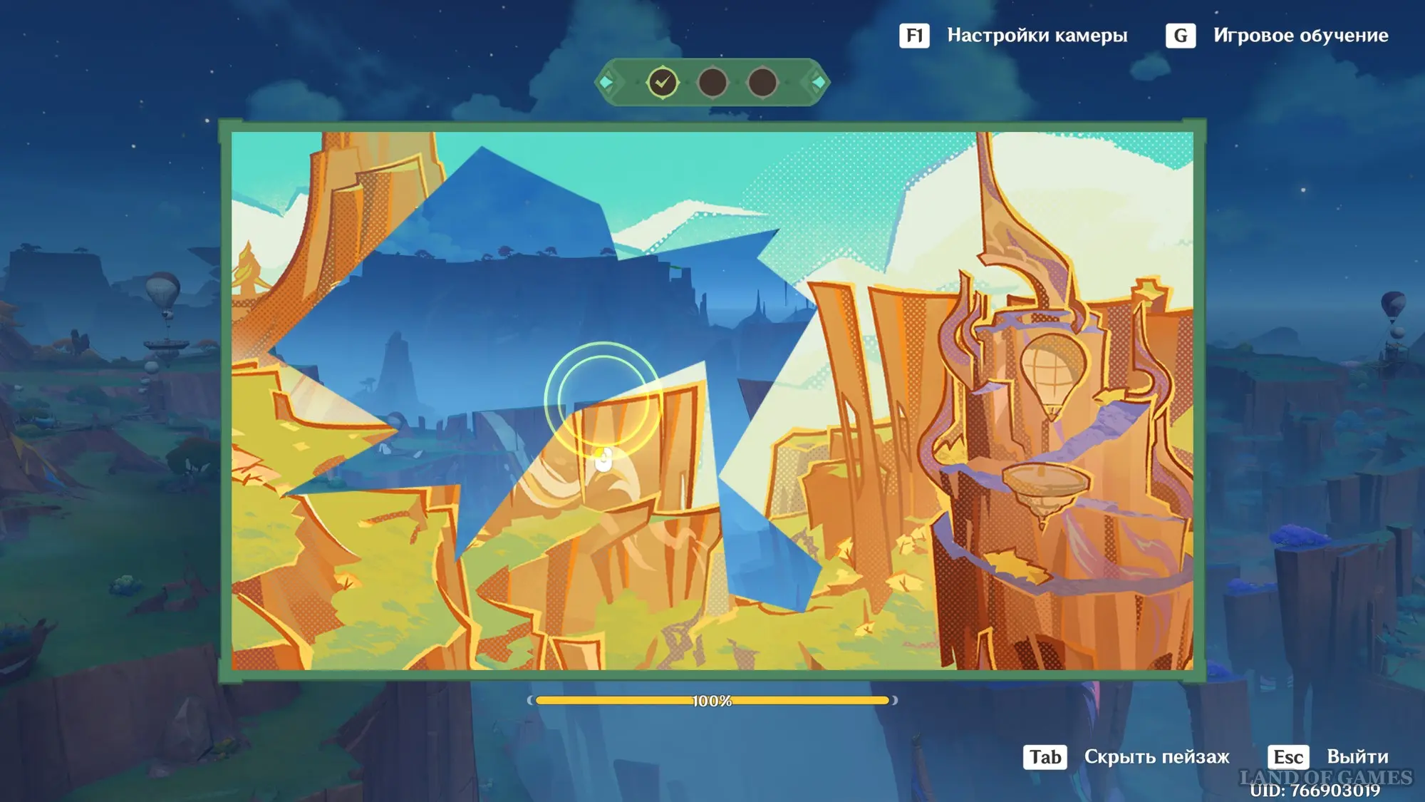 Телепортируйтесь к статуе Пиро Архонта на утесе Куауакан, а затем поднимитесь на вершину скалы, встаньте в подсвеченном месте и начните любоваться красотами. Вначале поверните камеру вправо и вниз в сторону поселения Повелителей ночного ветра, и нажмите ЛКМ, когда замигает экран.