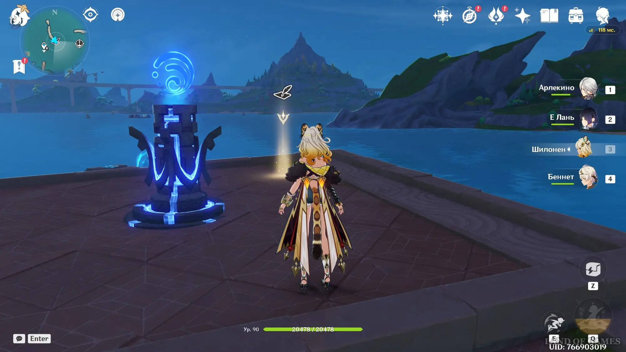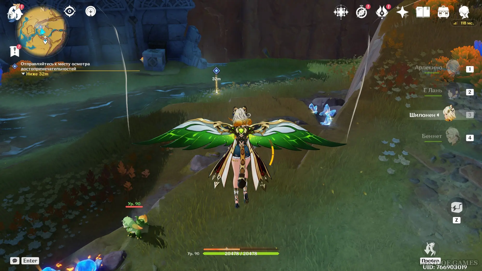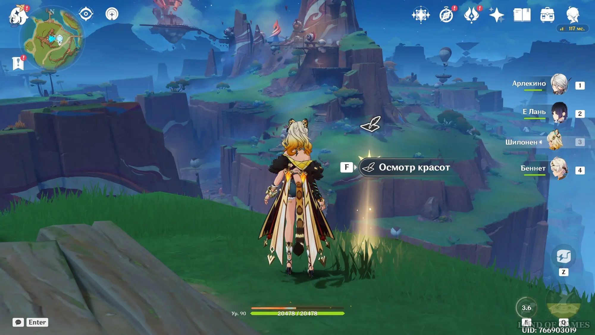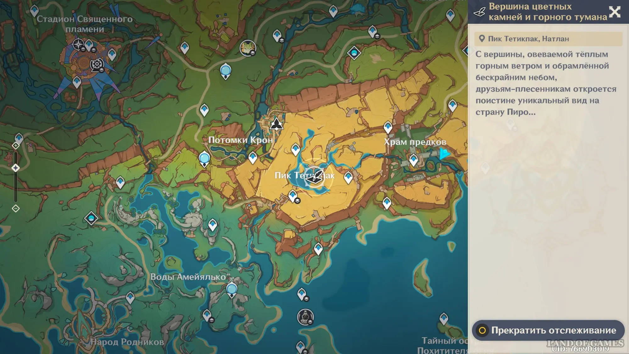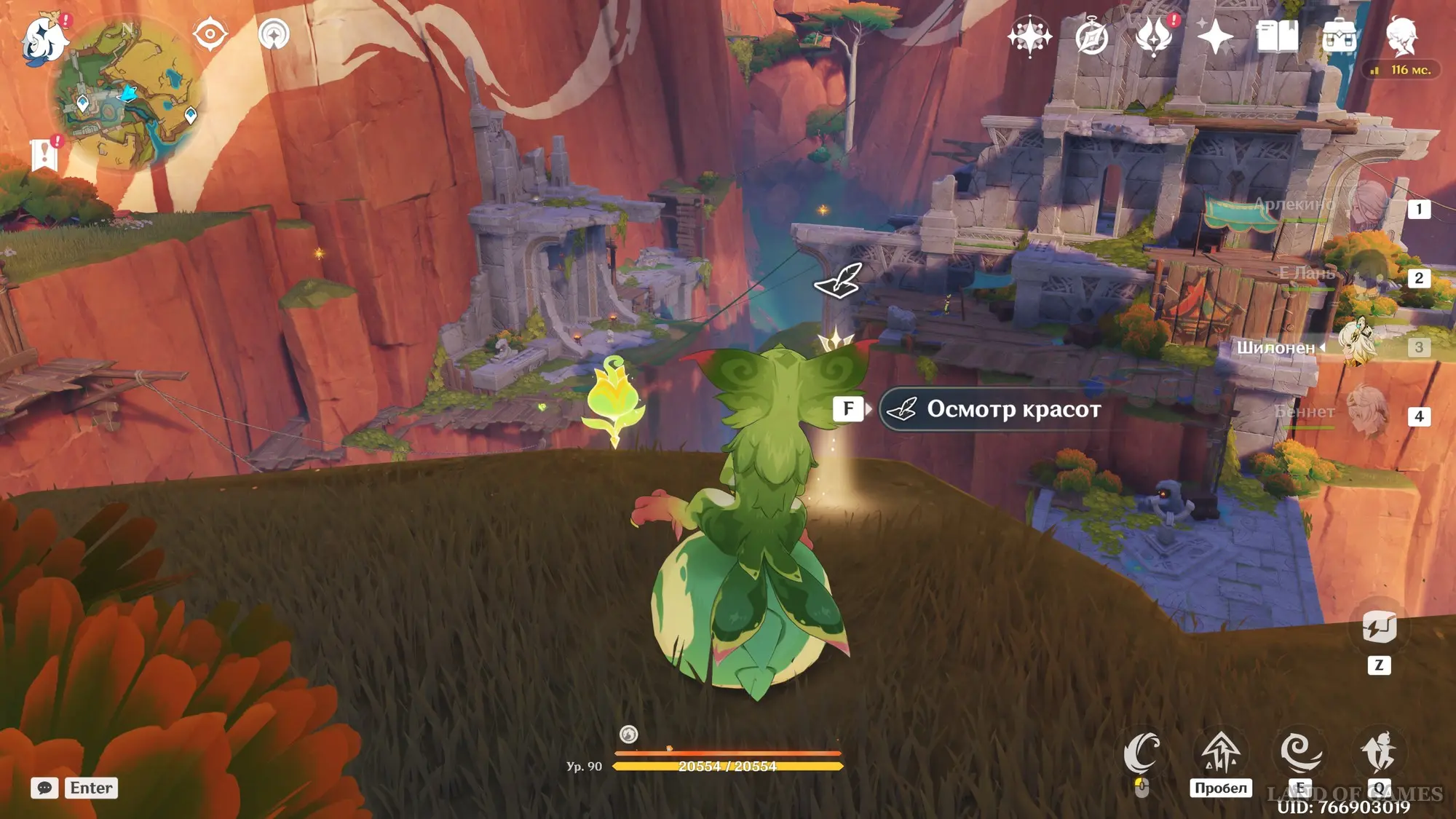 Телепортируйтесь к статуе Пиро Архонта на утесе Куауакан, а затем поднимитесь на вершину скалы, встаньте в подсвеченном месте и начните любоваться красотами. Вначале поверните камеру вправо и вниз в сторону поселения Повелителей ночного ветра, и нажмите ЛКМ, когда замигает экран.