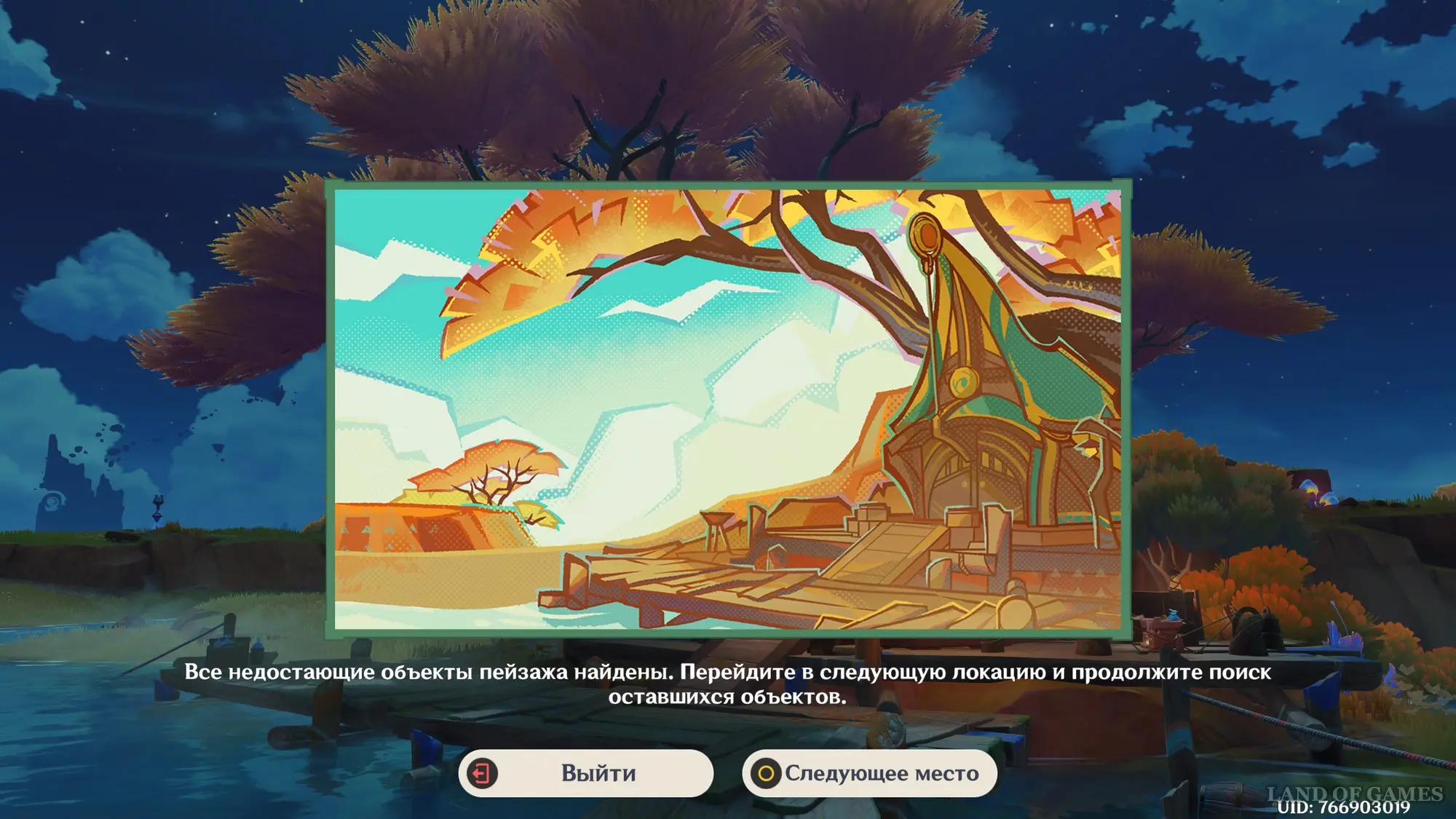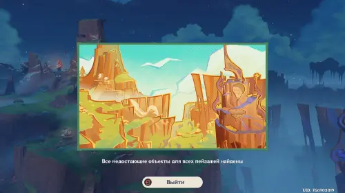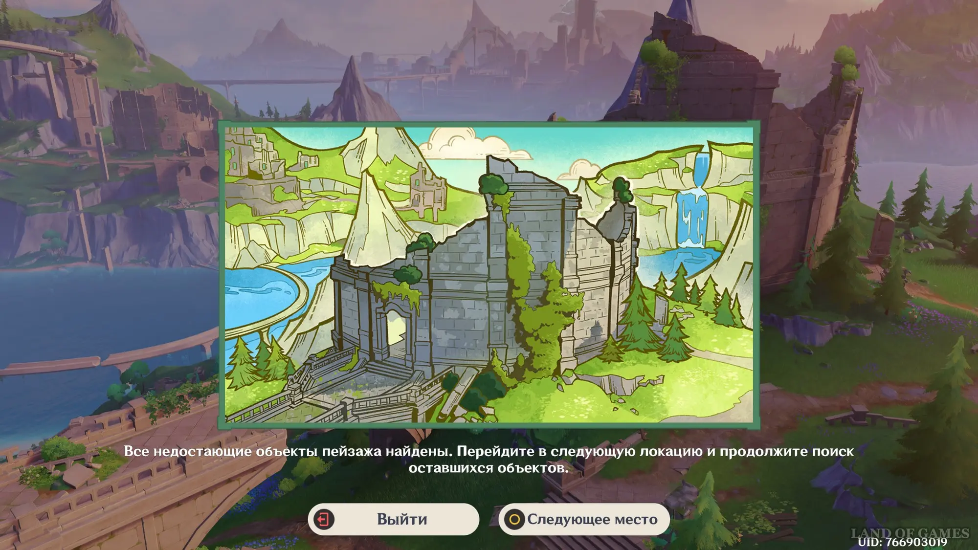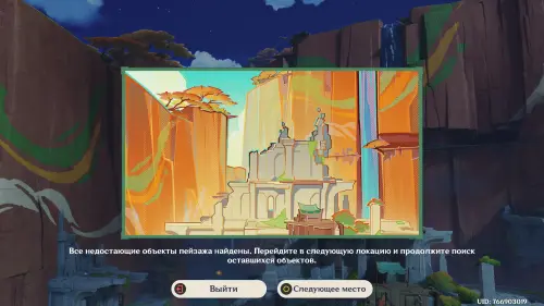 В конце поверните камеру вправо в сторону водопада и опустите ее немного вниз, чтобы сопоставить граффити на скале с картиной. Снова нажмите на ЛКМ. Поздравляем, вы нашли все недостающие объекты, поэтому можете переходить к следующему месту.