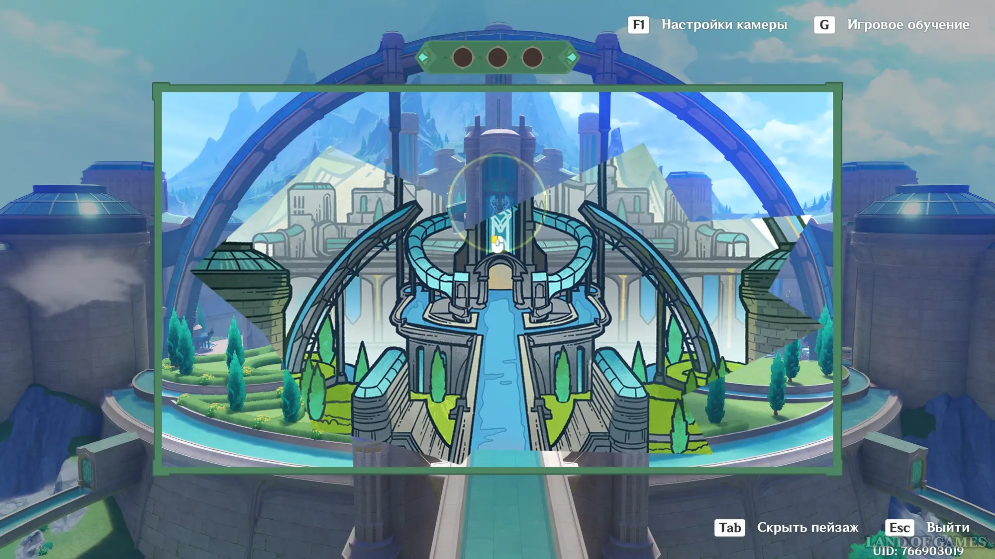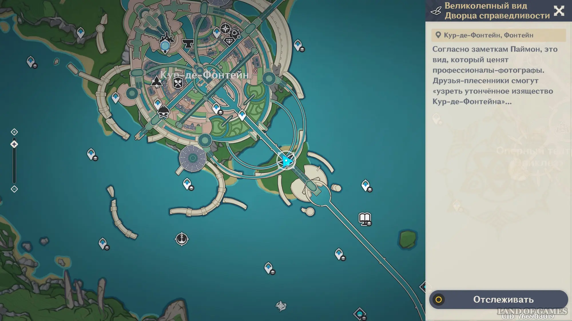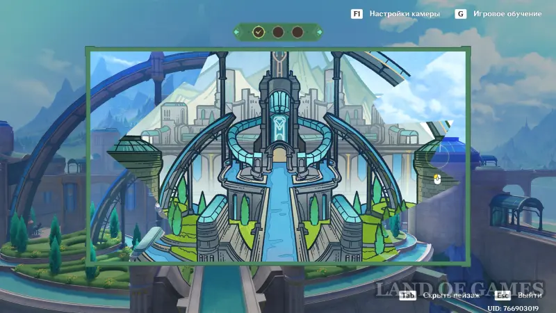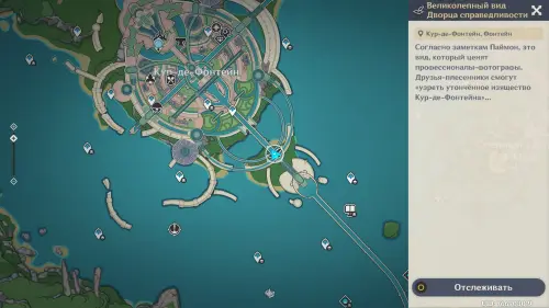 Сначала пройдите небольшой вступительный квест, в ходе которого вы заберетесь на верхушку водной транспортной линии Фонтейна. Затем встаньте в указанную точку и начните осмотр красот. Первым делом поверните камеру чуть ниже и к центру, чтобы запечатлеть верхнюю часть дворца.