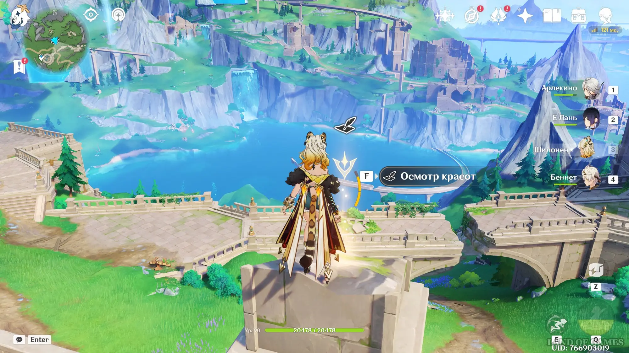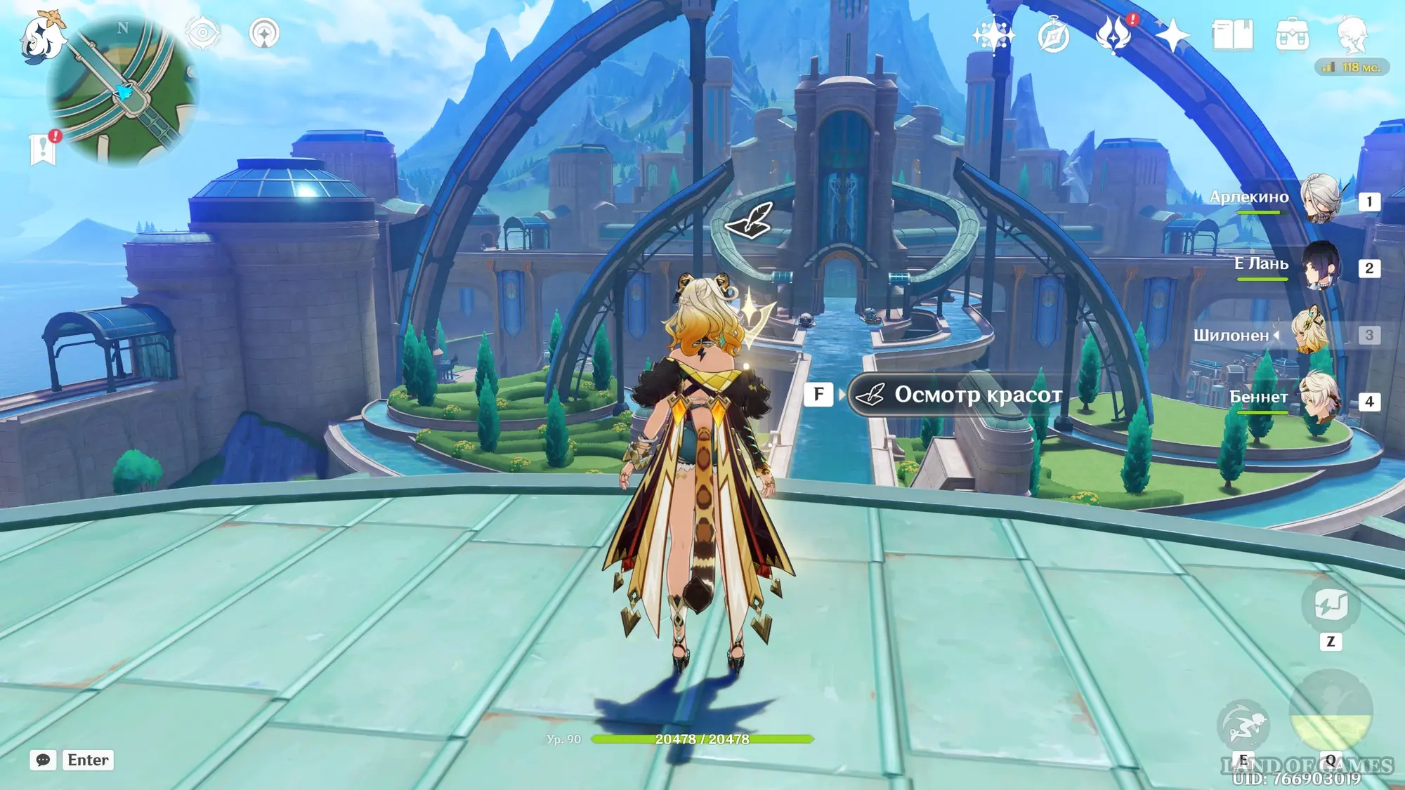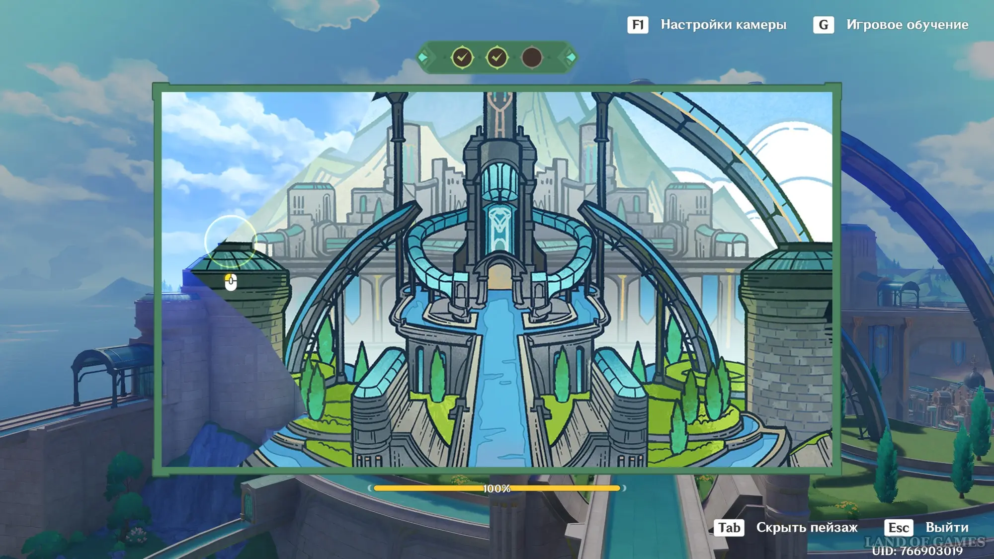 Сначала пройдите небольшой вступительный квест, в ходе которого вы заберетесь на верхушку водной транспортной линии Фонтейна. Затем встаньте в указанную точку и начните осмотр красот. Первым делом поверните камеру чуть ниже и к центру, чтобы запечатлеть верхнюю часть дворца.