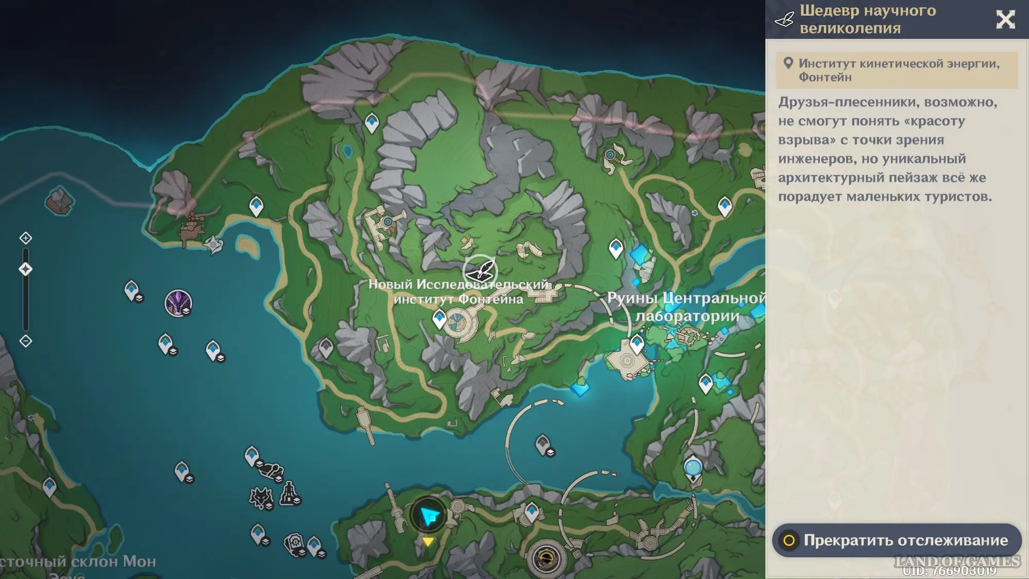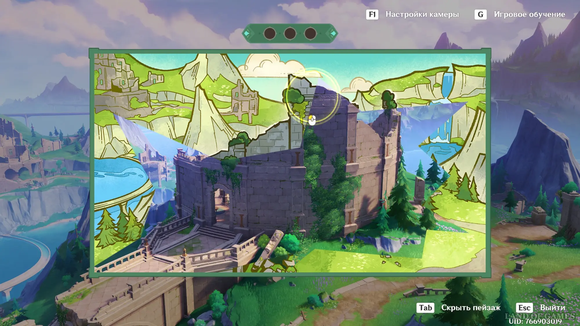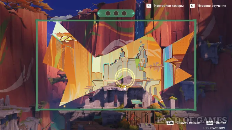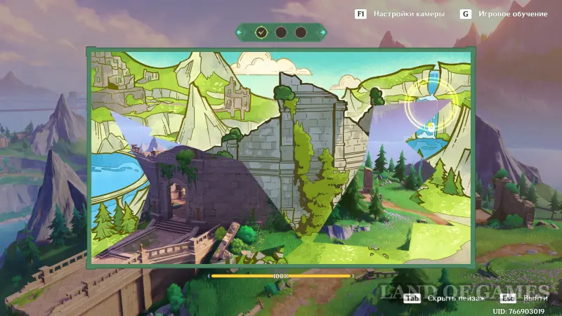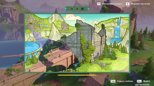 Переместитесь в Новый исследовательский центр Фонтейна, расположенный к северу от столицы региона и снова встаньте в подсвеченное место для начала нового сопоставления картины с пейзажем. Первым делом наведите камеру на вершину руин сооружения с левой стороны и сделайте его фото.