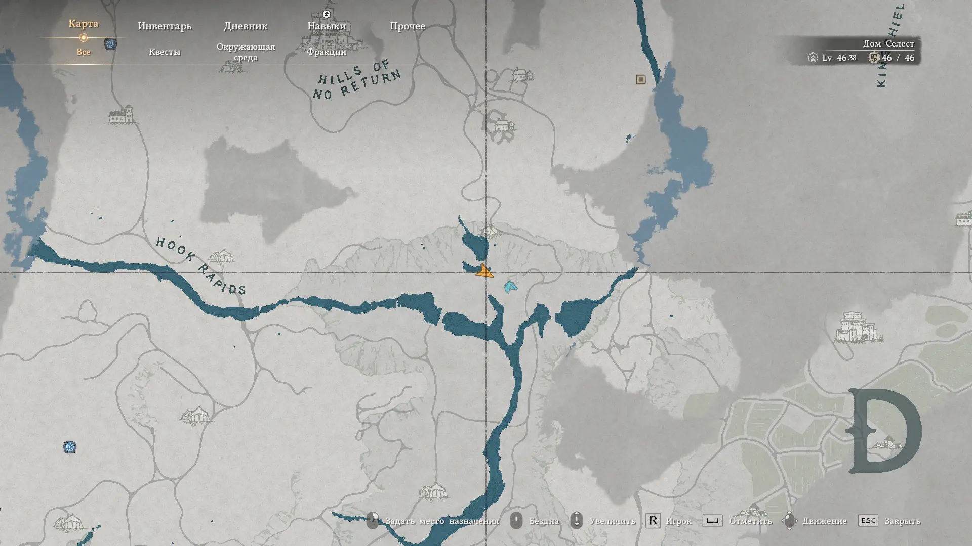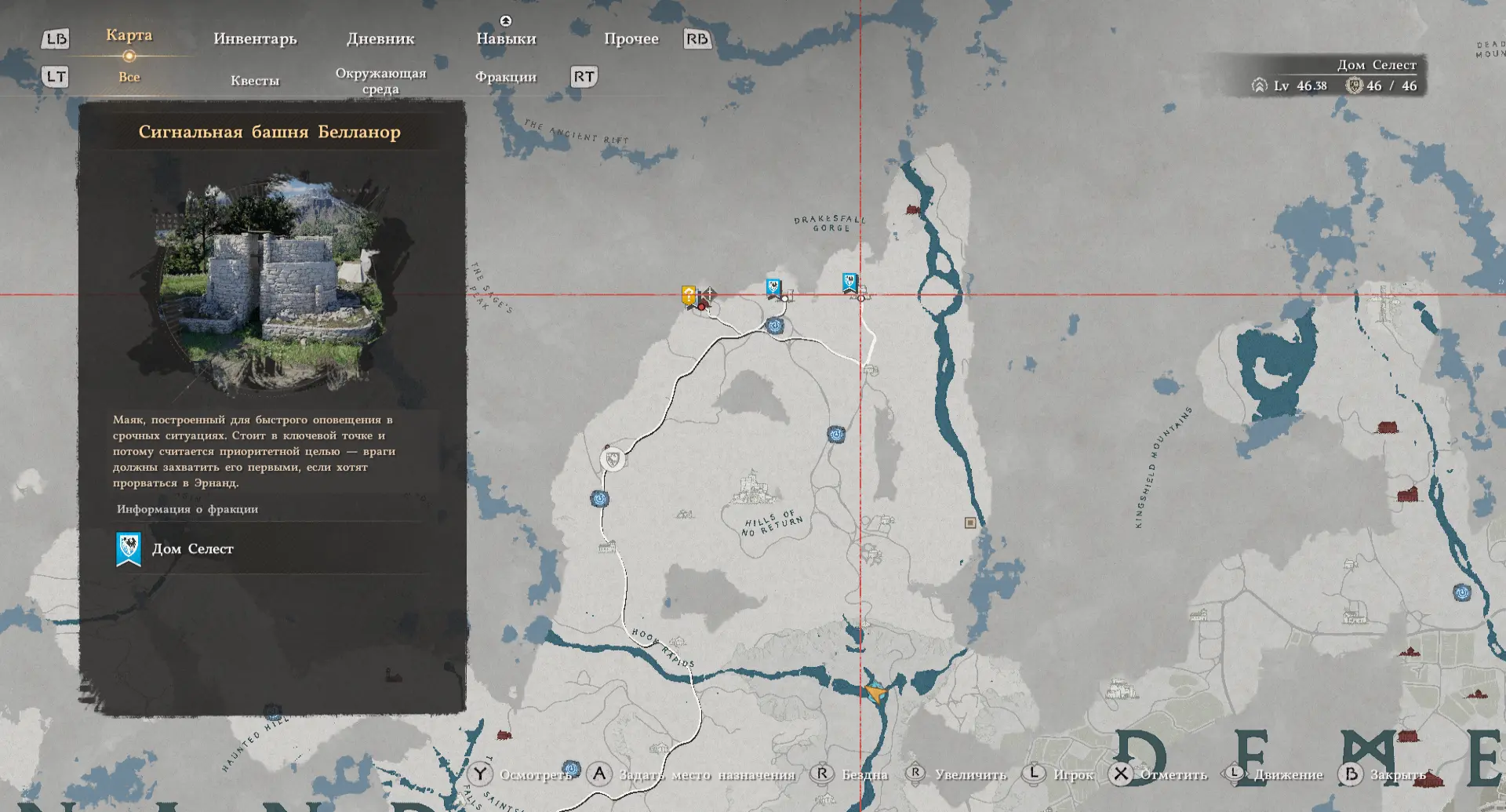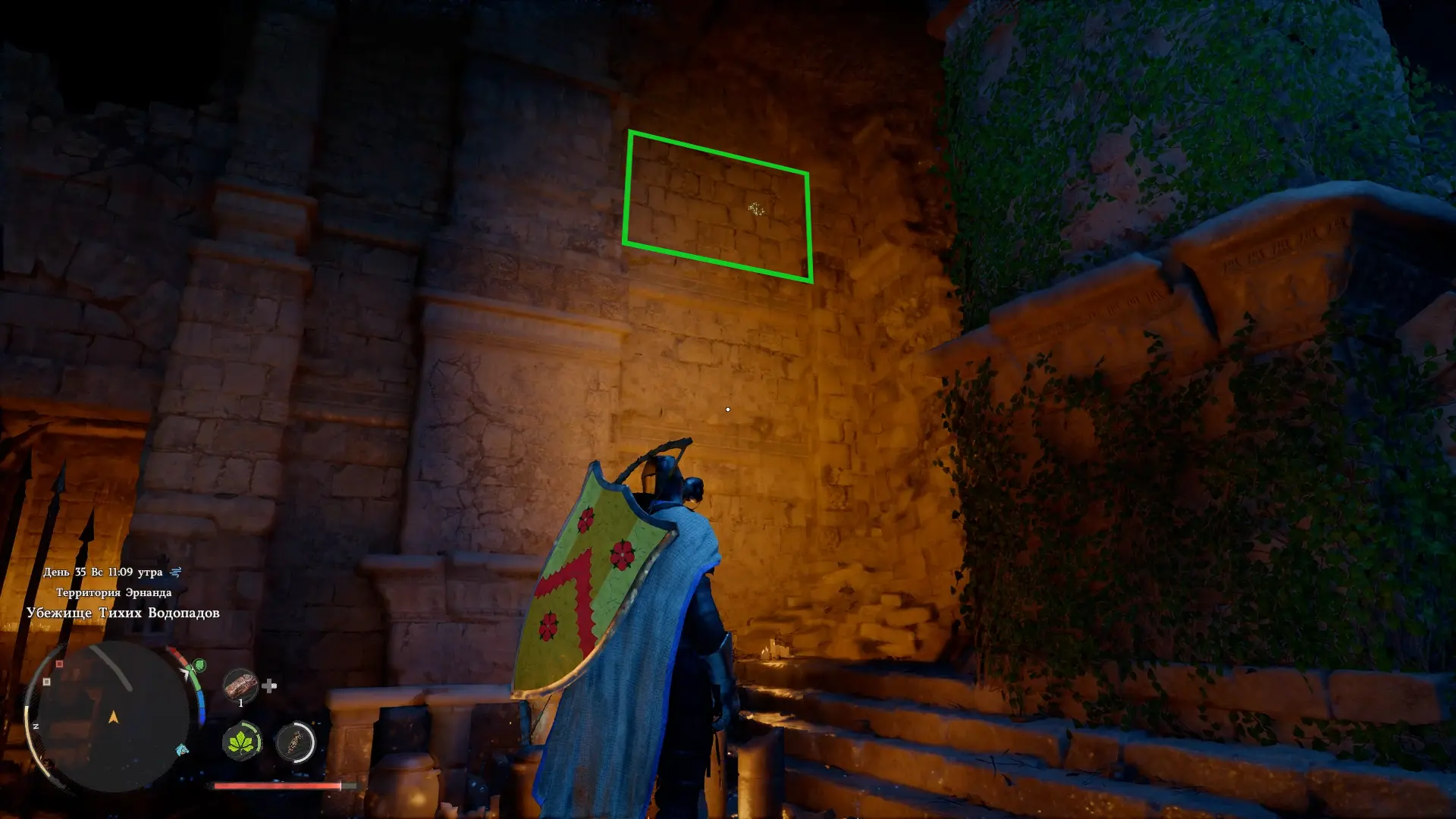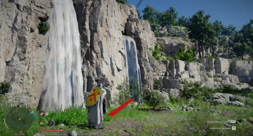 На карте изображены три рисунка: ущелье с водопадом, стена и пещера. Ущелье находится чуть ниже Замка Арбории рядом с Приютом «Синяя рябь». Спуститесь вниз от приюта к двум водопадам, а затем спланируйте вниз прямо в ущелье. Ближе к правому водопаду на дне ущелья находится пещера.