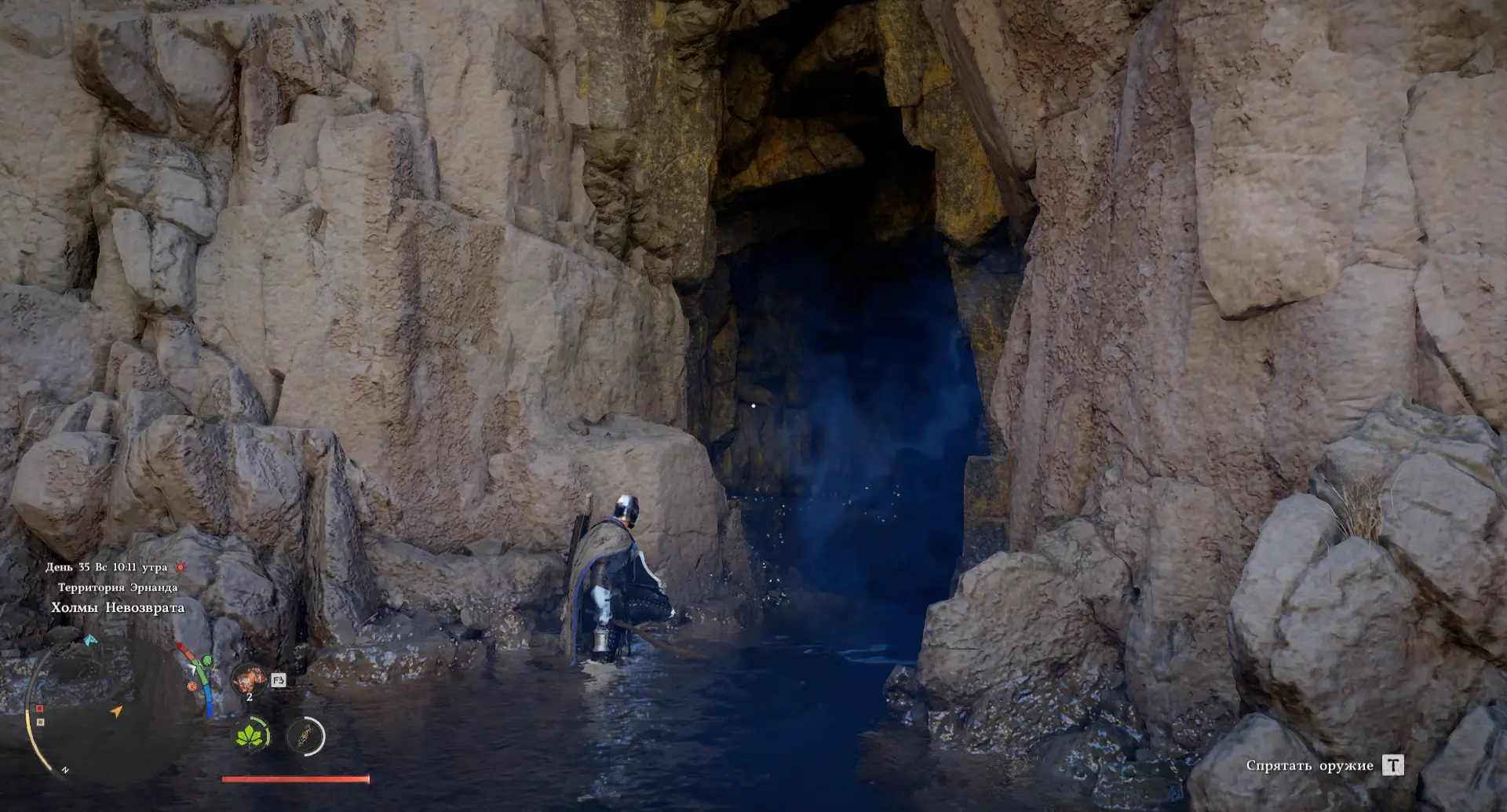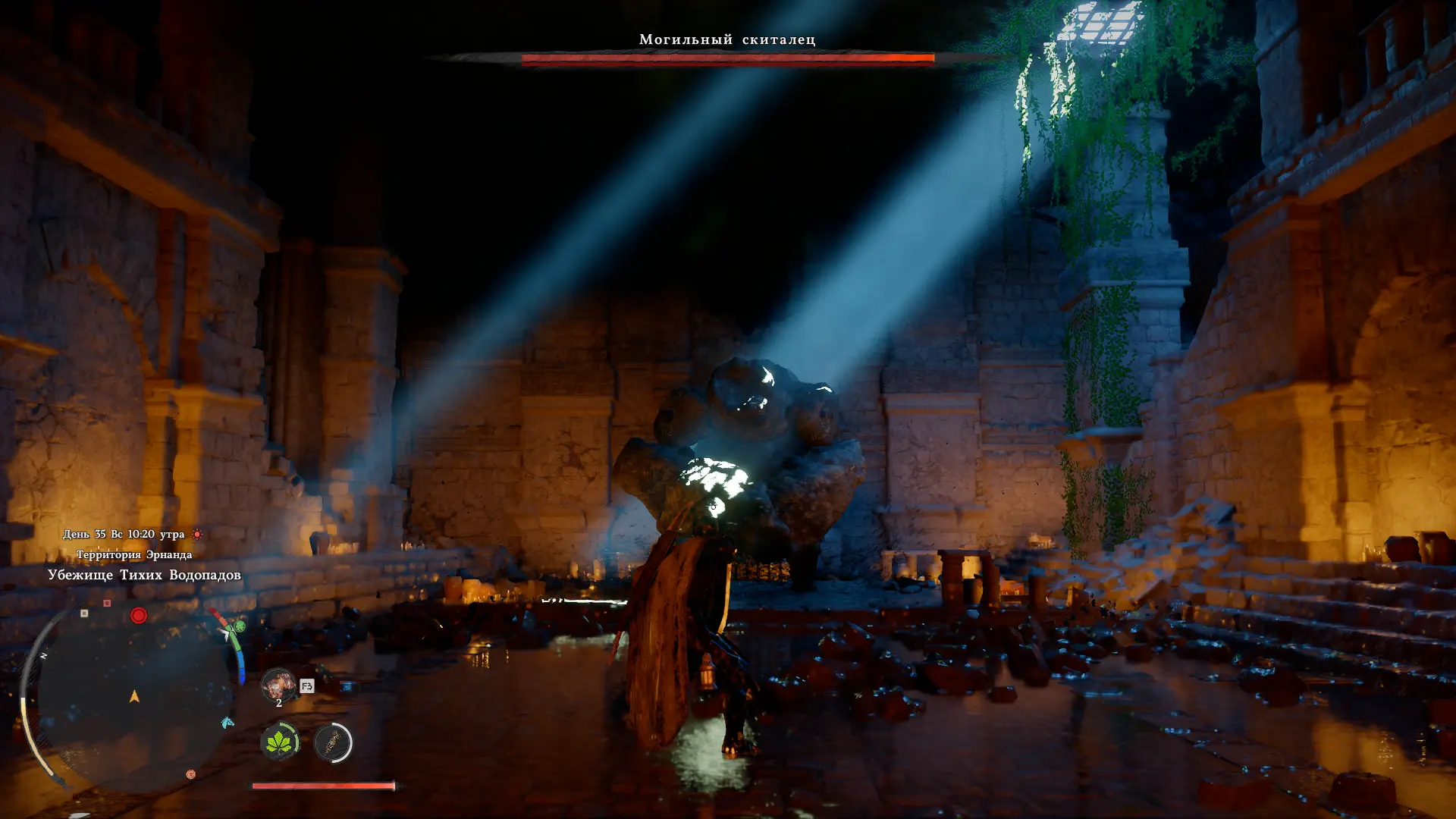 Внутри пещеры вам встретится каменный босс Могильный скиталец. Победить его несложно: заполняйте желтую полоску и бейте по булыжникам, когда противник распадается на части.