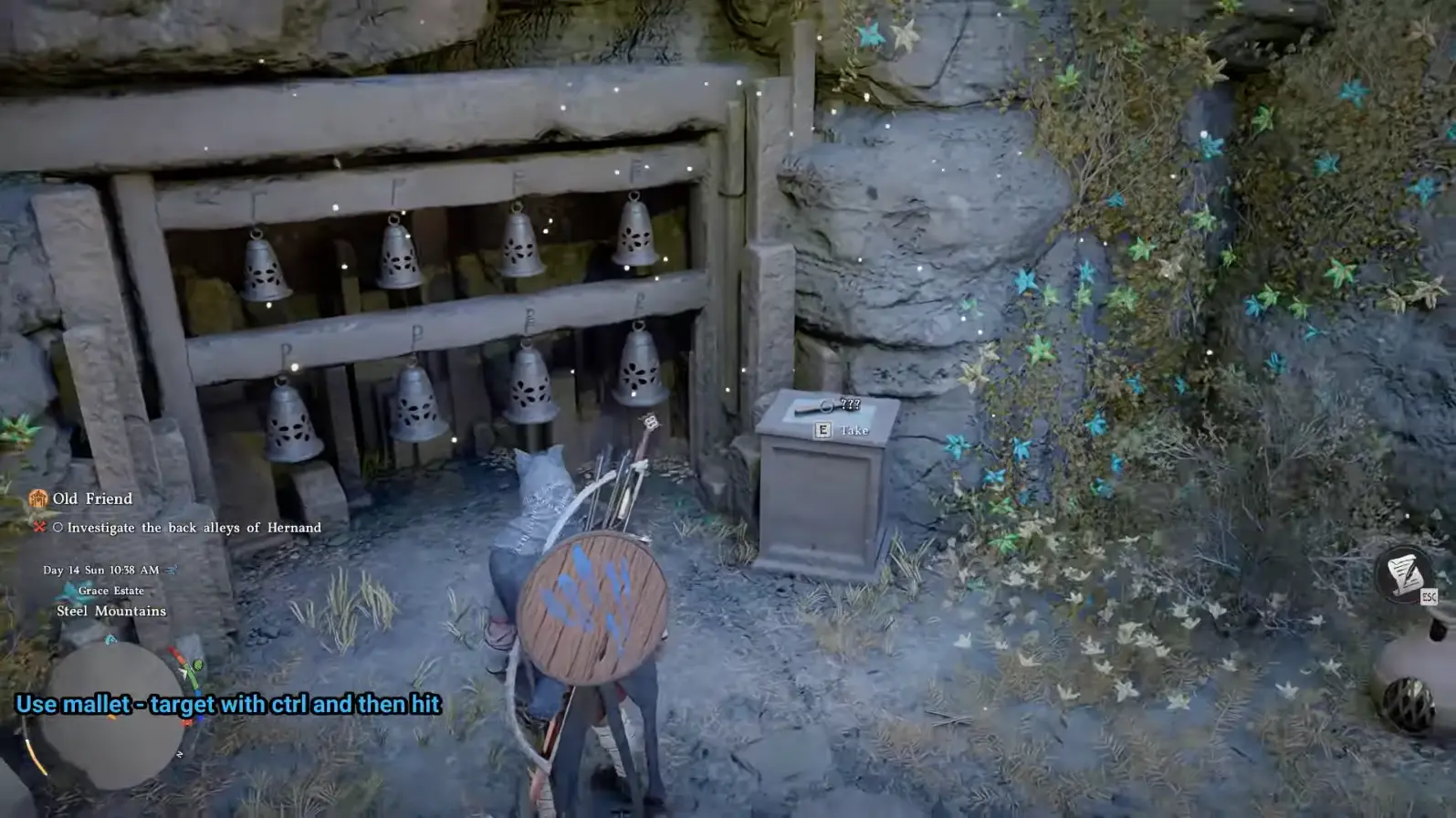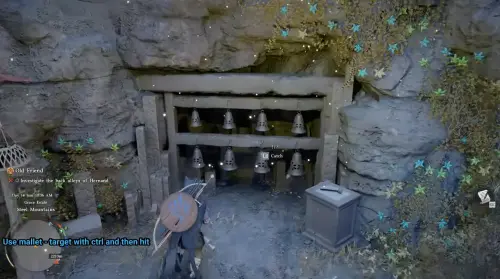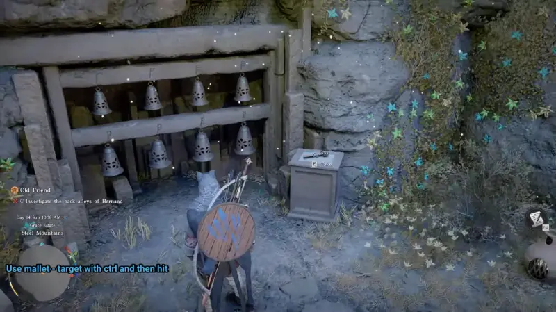 Чтобы взаимодействовать с колокольчиками, потребуется специальный инструмент – киянка. Подойдите к постаменту рядом с карильоном и возьмите молоточек. После этого откройте инвентарь и экипируйте его (без экипированной киянки удары по колоколам не будут засчитываться, поэтому этот шаг пропускать нельзя).