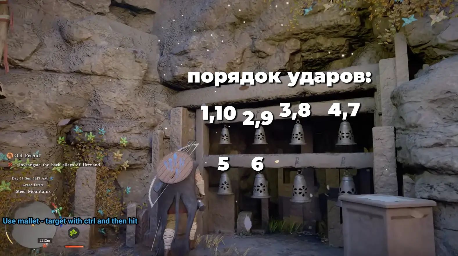Подойдите вплотную к карильону, зажмите кнопку прицеливания и направляйте удары киянкой по нужным колоколам. Механика взаимодействия похожа на добычу ресурсов или рубку деревьев, поэтому, если вы уже занимались этим ранее, управление покажется знакомым.