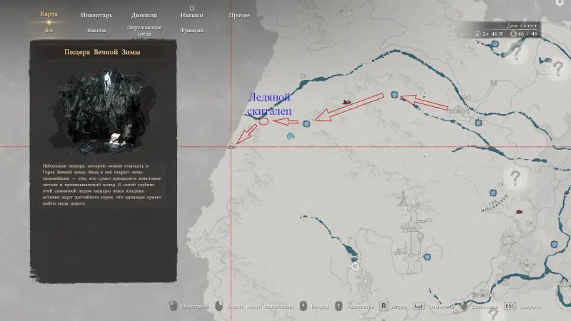 Наброски на карте указывают на ледяную пещеру, находящуюся в горах на западе Эрнанда. Если у вас не открыт ближайший телепорт, отправляйтесь в путь из Форта Варспайк. В этом случае по дороге можно открыть пару телепортов и рядом с рекой встретиться с боссом Ледяной скиталец, с которого выпадает силовое ядро. Если не планируете сражаться с боссом, после второго телепорта сразу поднимайтесь в гору, не сворачивая к реке.