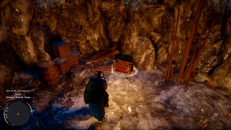 Спустившись в ледяную пещеру, откройте сундук и получите Латные перчатки ледяной тьмы, которые повышают скорость карабканья и плавания на 2%. Не забудьте подобрать в дальнем углу пещеры Двуручный меч Сидмона. Чтобы выбраться из пещеры используйте перекаты (уклонение).