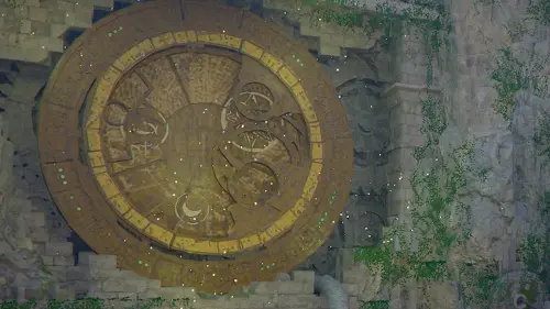 Добравшись до нужной точки, осмотрите руины и найдите помещение с большой настенной фреской и тремя горизонтальными дисками управления. Именно с ними предстоит взаимодействовать, чтобы восстановить изображение и открыть путь к награде.