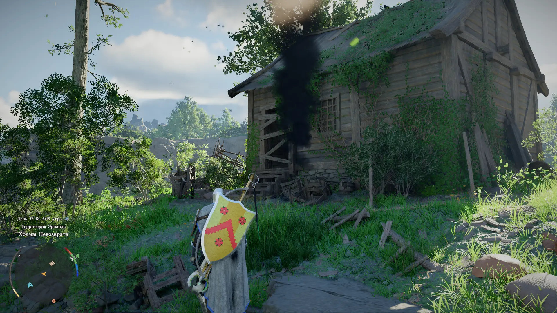 Третий фрагмент карты клада располагается недалеко от Замка Арбории — в маленьком деревянном доме на холме. Его легко заметить по черному дыму, поднимающемуся от него вверх. Сломайте доски, заграждающие входной проем, и войдите внутрь дома. Фрагмент карты лежит на тумбе в дальнем углу.