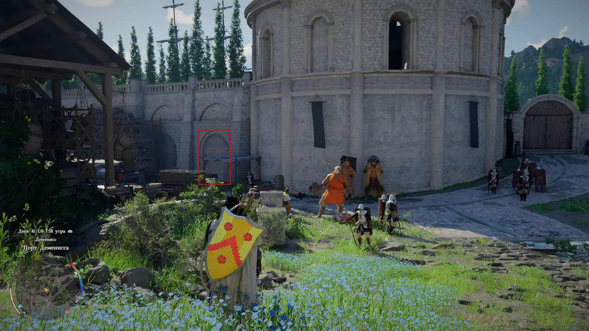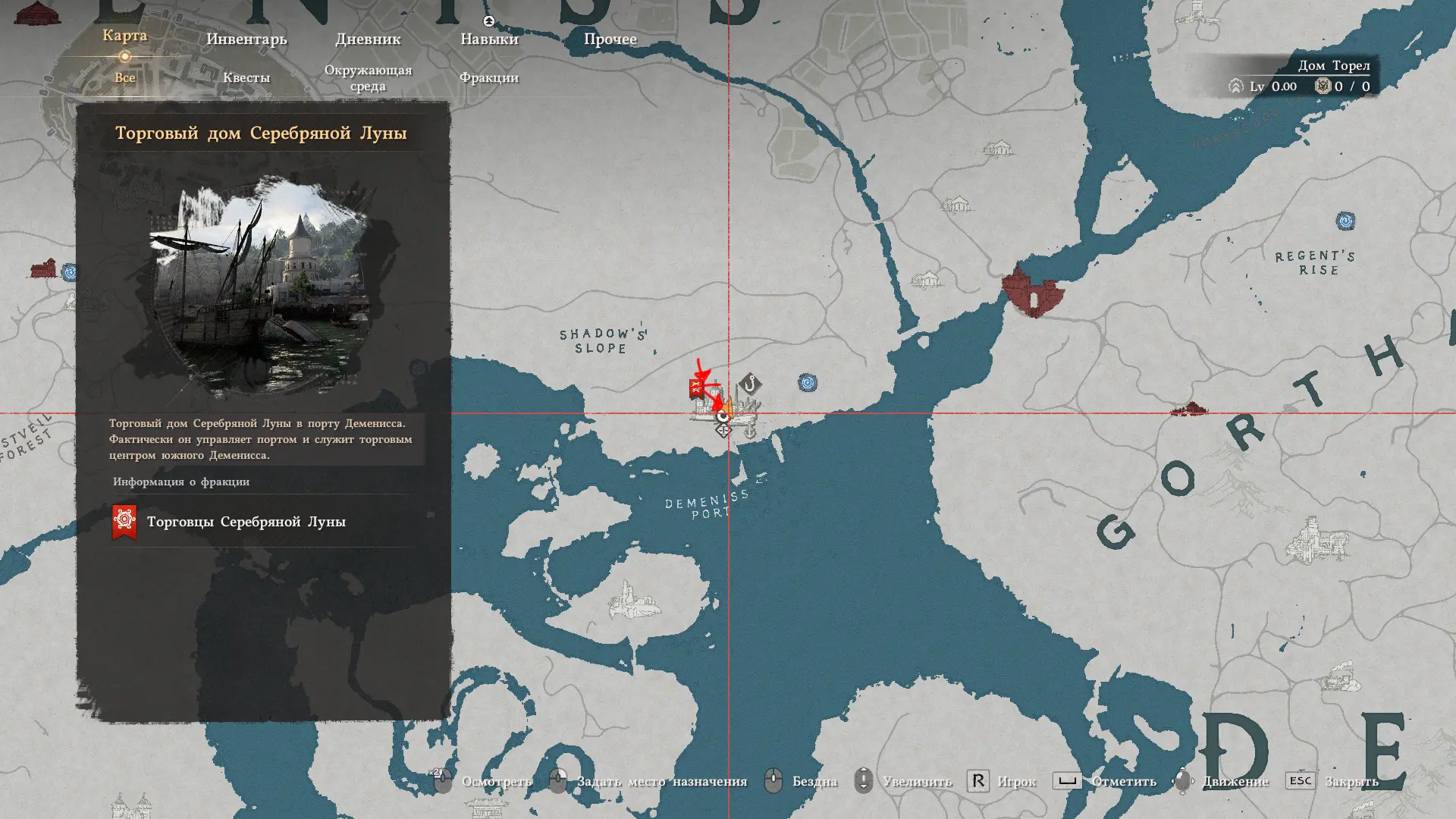 На фрагменте карты нарисована дорога, ведущая к Торговому дому Серебряной луны. Если спуститься к торговому дому по этой дороге с севера, можно сразу заметить нужную арочную стену, которая также изображена на карте.