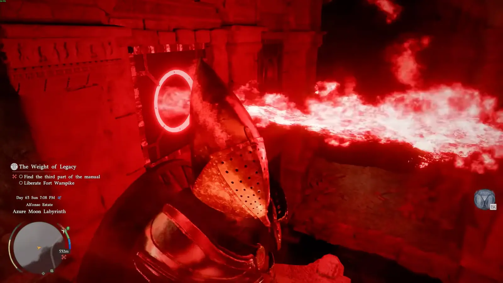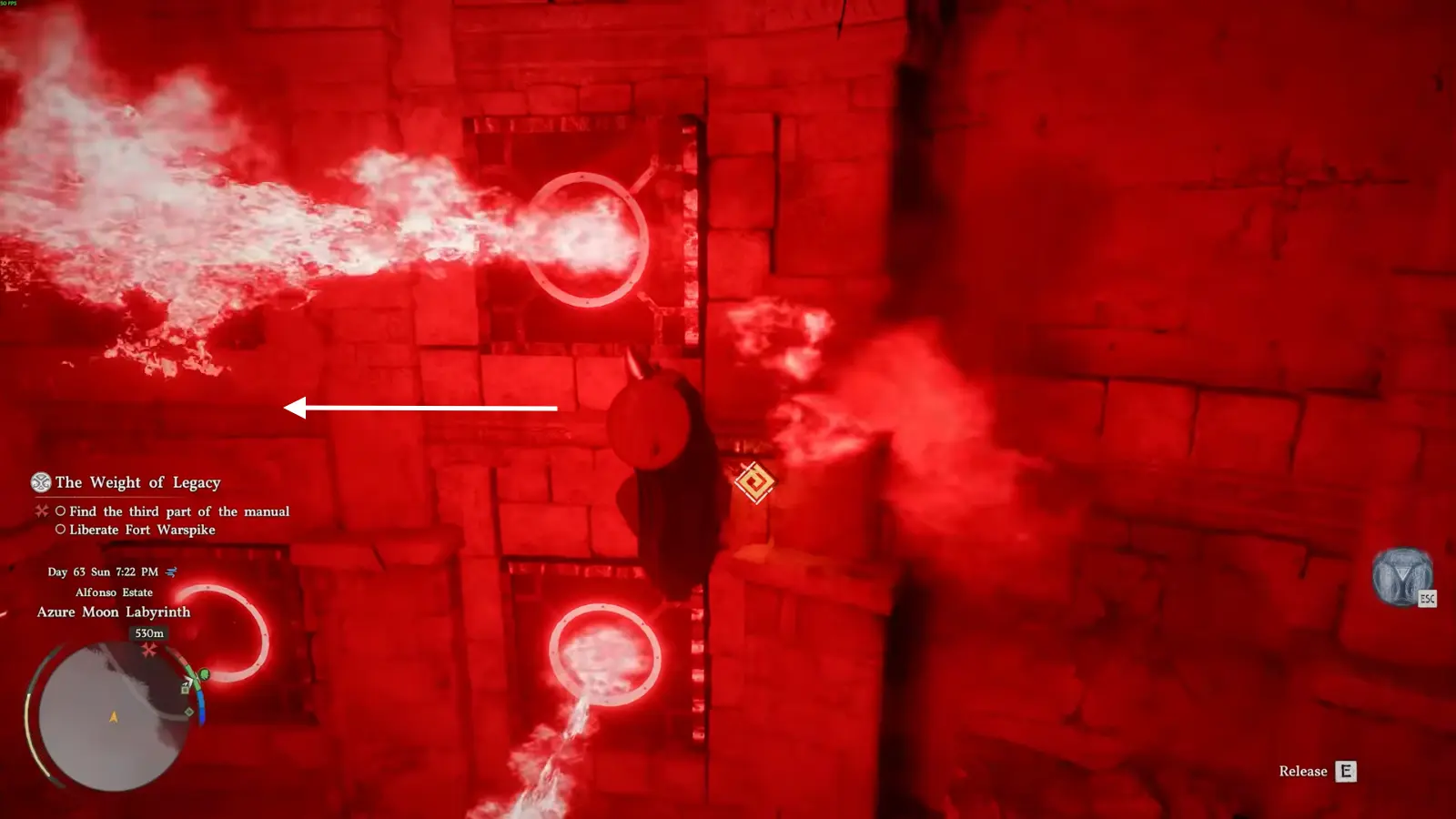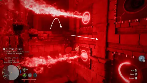 Вторая ловушка выглядит проще, но на деле опаснее. В ней изначально видна только одна струя огня, однако при попытке перепрыгнуть активируются дополнительные. Здесь снова лучше использовать обход по стене, но уже по правой.