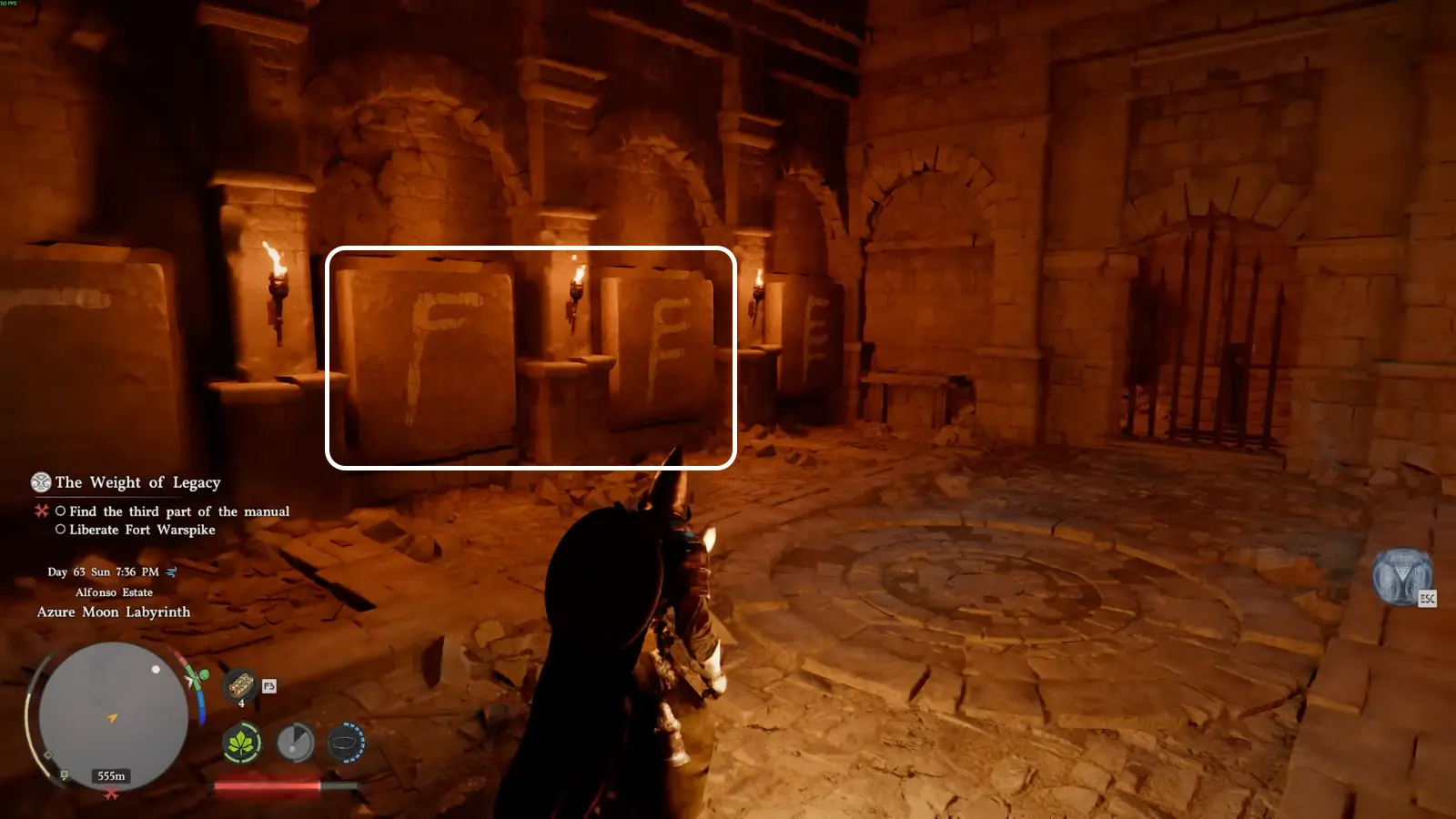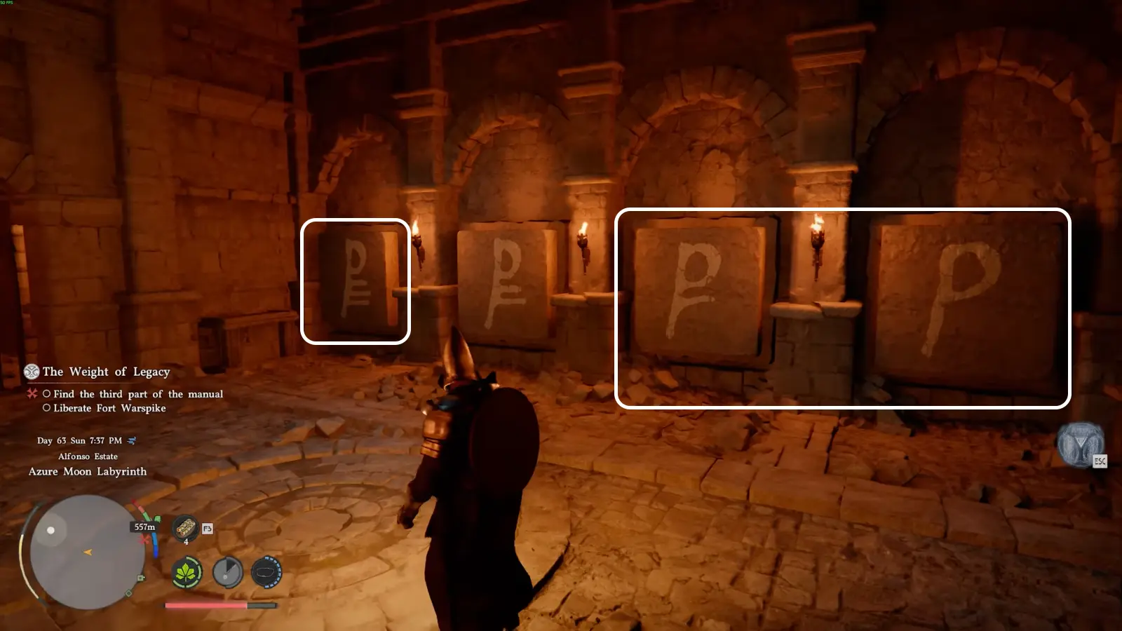 Внутри зала вы увидите восемь каменных панелей с глифами. Они расположены по обе стороны комнаты и делятся на два типа: символы, напоминающие букву Р с разным количеством линий, и символы, похожие на F, также с вариациями штрихов.