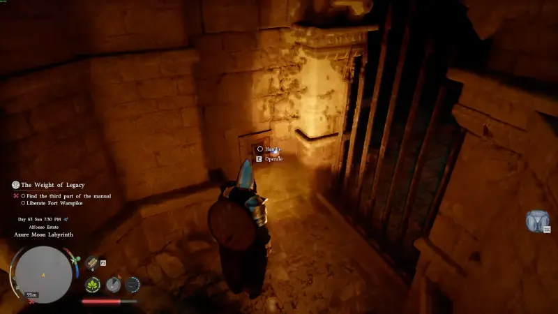 Пройдя ловушки, спуститесь вниз по лестнице и двигайтесь дальше по коридору, пока не наткнетесь на рычаг перед решеткой. Активируйте его, он откроет путь в зал с основной головоломкой.