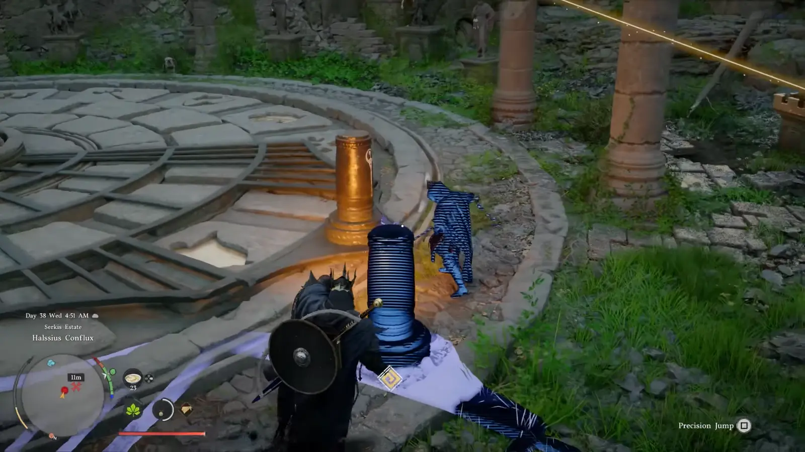 На первой стадии для взаимодействия доступна только одна статуя, держащая золотой щит. Встаньте у внешнего кольца механизма, используйте Колющий удар и начните движение по кругу влево.