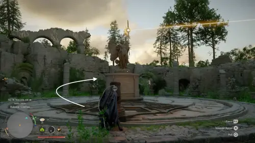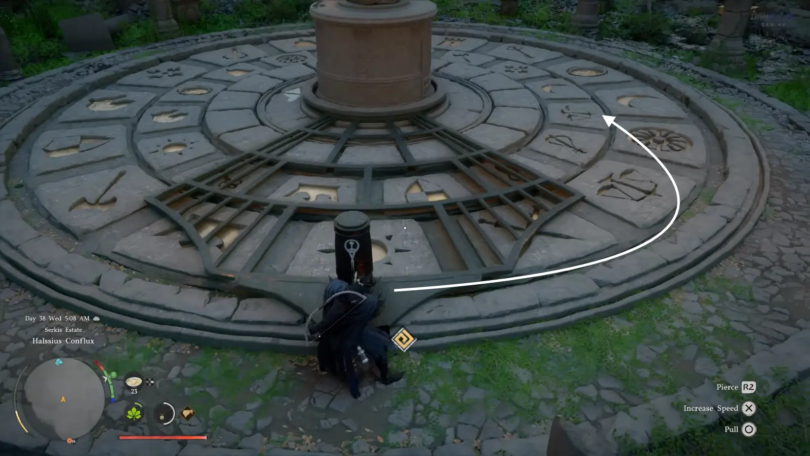 Теперь ориентиром становится статуя с весами. Снова используйте Колющий удар, но на этот раз двигайтесь вправо по кольцу. Найдите символ весов, остановившись в нужной точке, вы активируете продолжение загадки, кувшин и лютню, которые понадобятся дальше.