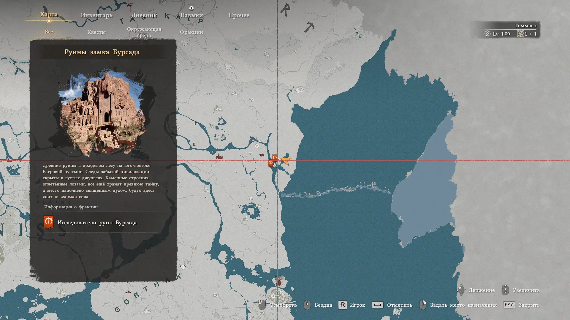 На карте изображены Руины замка Бурсад, которые располагаются на севере от города Делесия. Чтобы найти сокровища, встаньте под разрушенным мостом, находящимся в правом крыле древнего замка (точное местоположение моста указано на карте выше).
