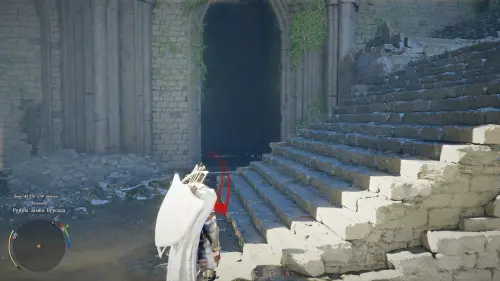 Находясь под мостом, направьте взгляд в сторону замка и идите вперед к арке. Оказавшись внутри, поверните налево и продолжайте идти по темному коридору, пока не доберетесь до стены с поворотным механизмом.