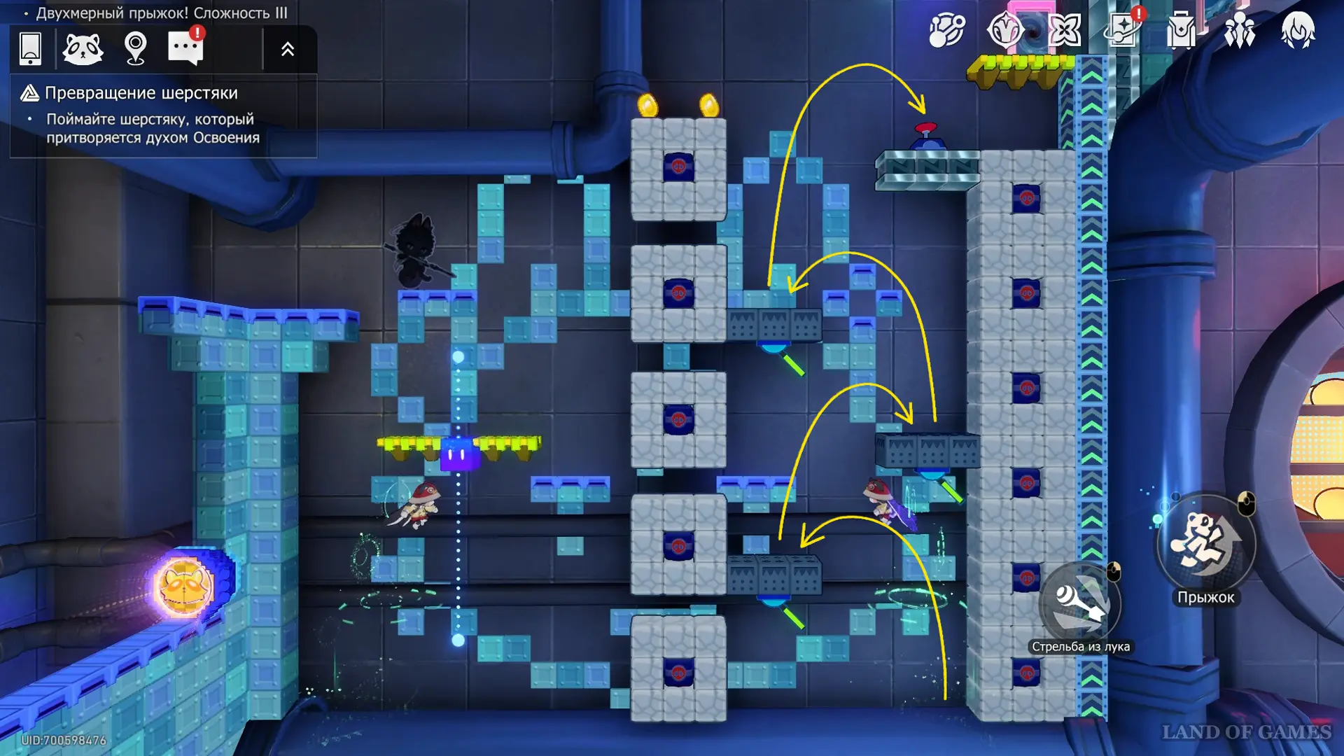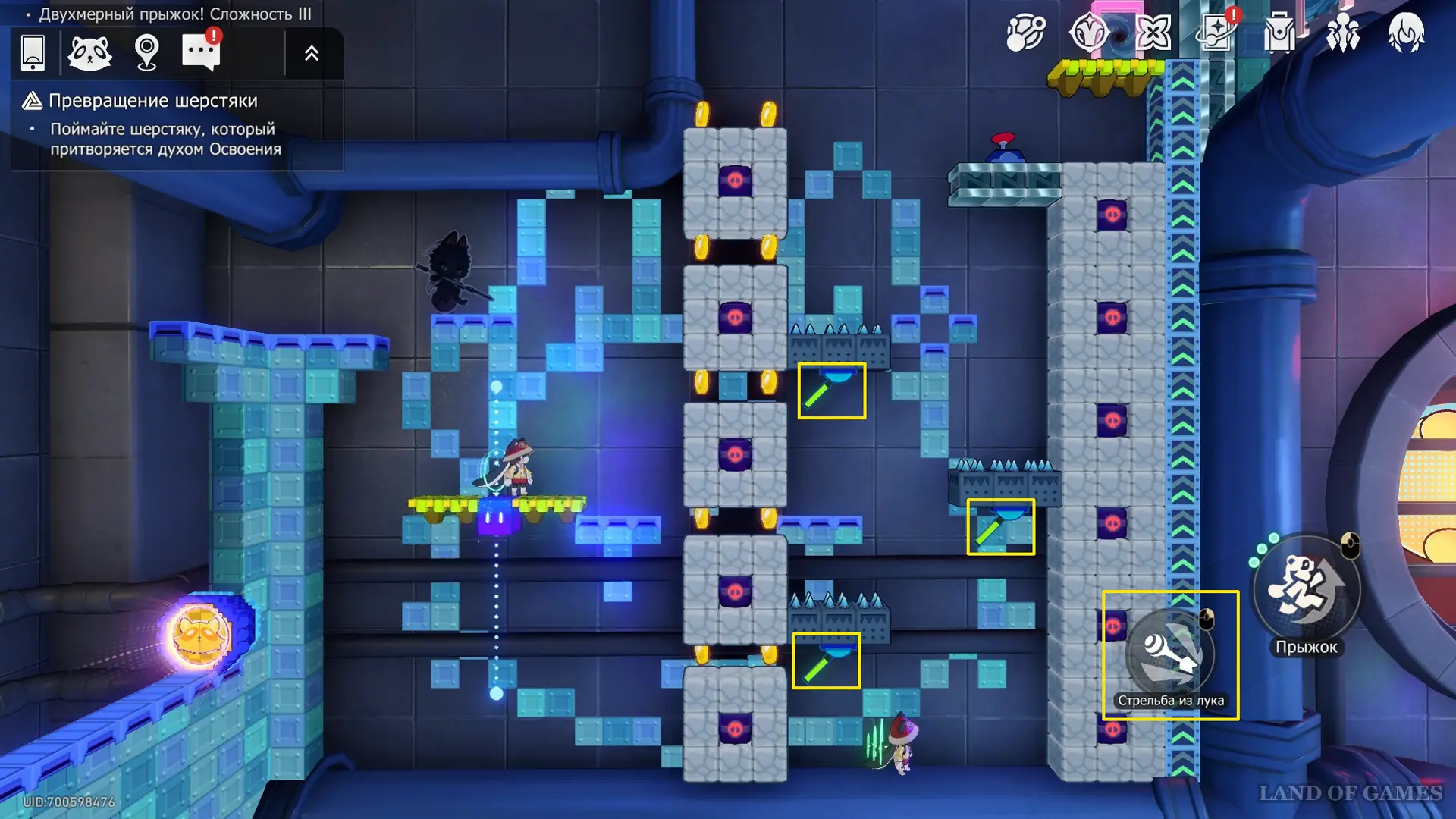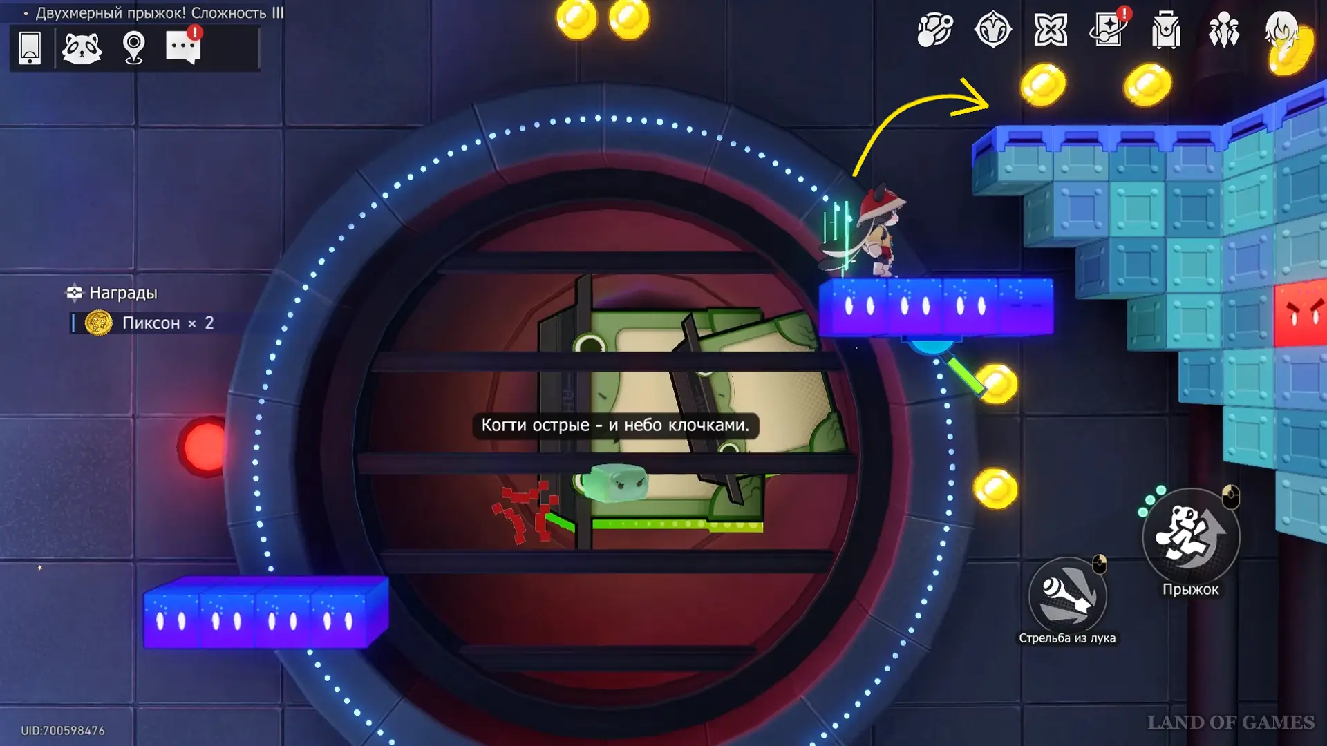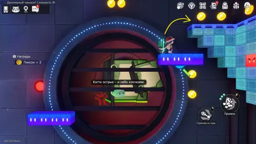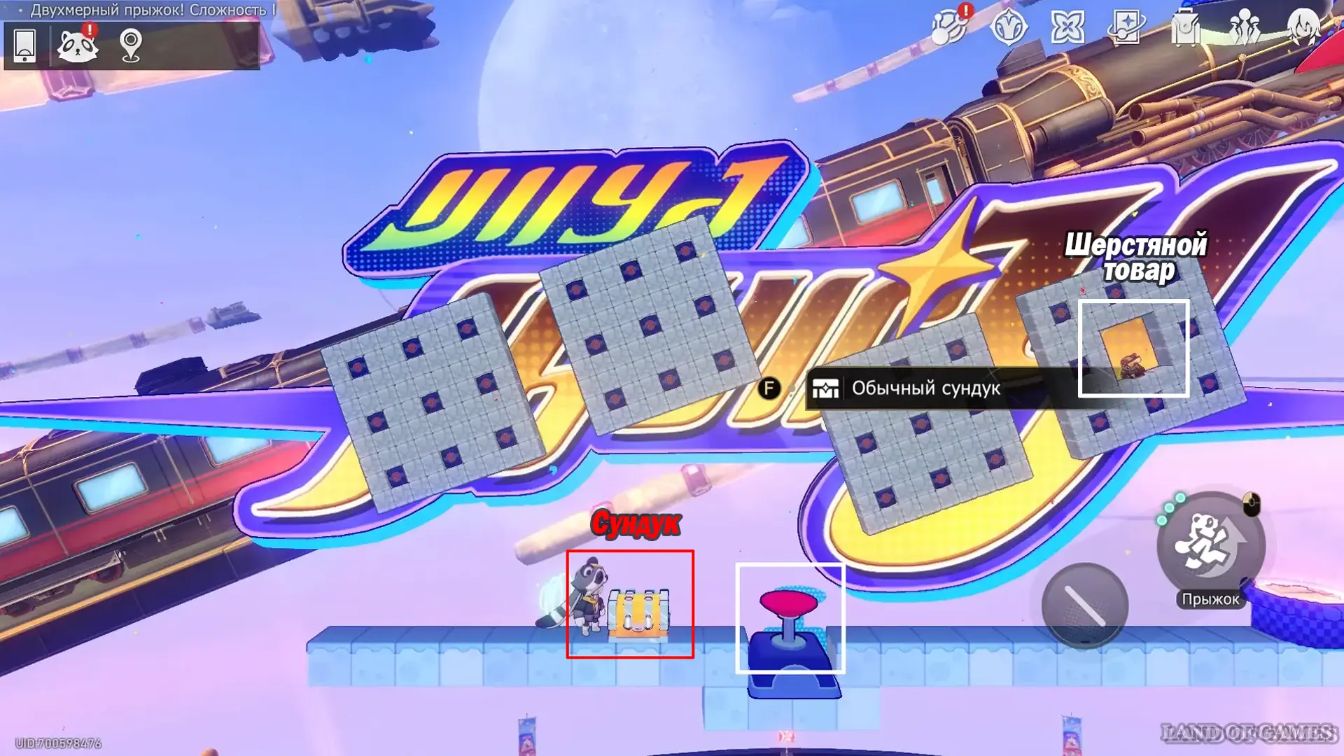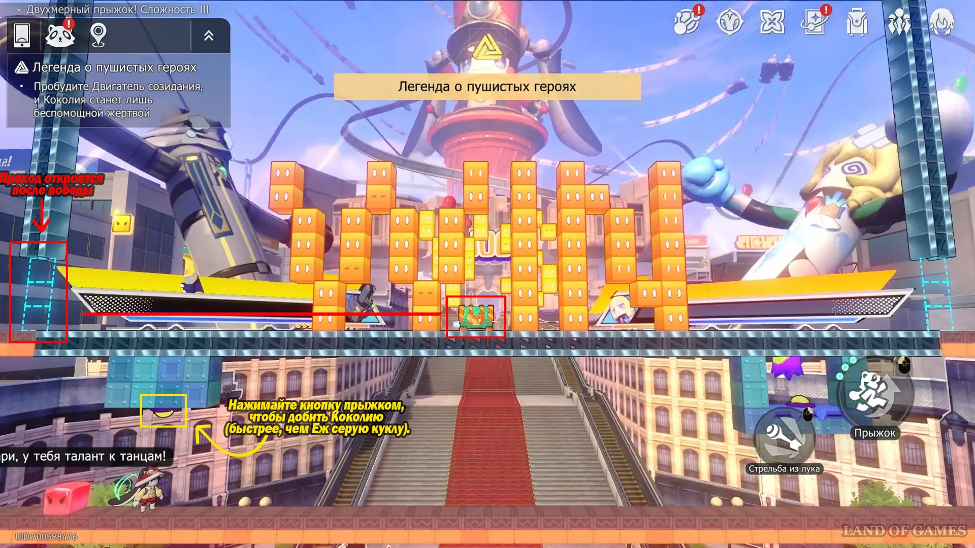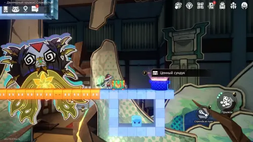 На третьей площадке подбегите к кнопке под синими блоками слева и быстро нажимайте ее в прыжке, чтобы снизить ХП Коколии и завершить испытание «Легенды о пушистых героях». Затем поднимитесь через открывшийся сверху проход и заберите ценный сундучок.