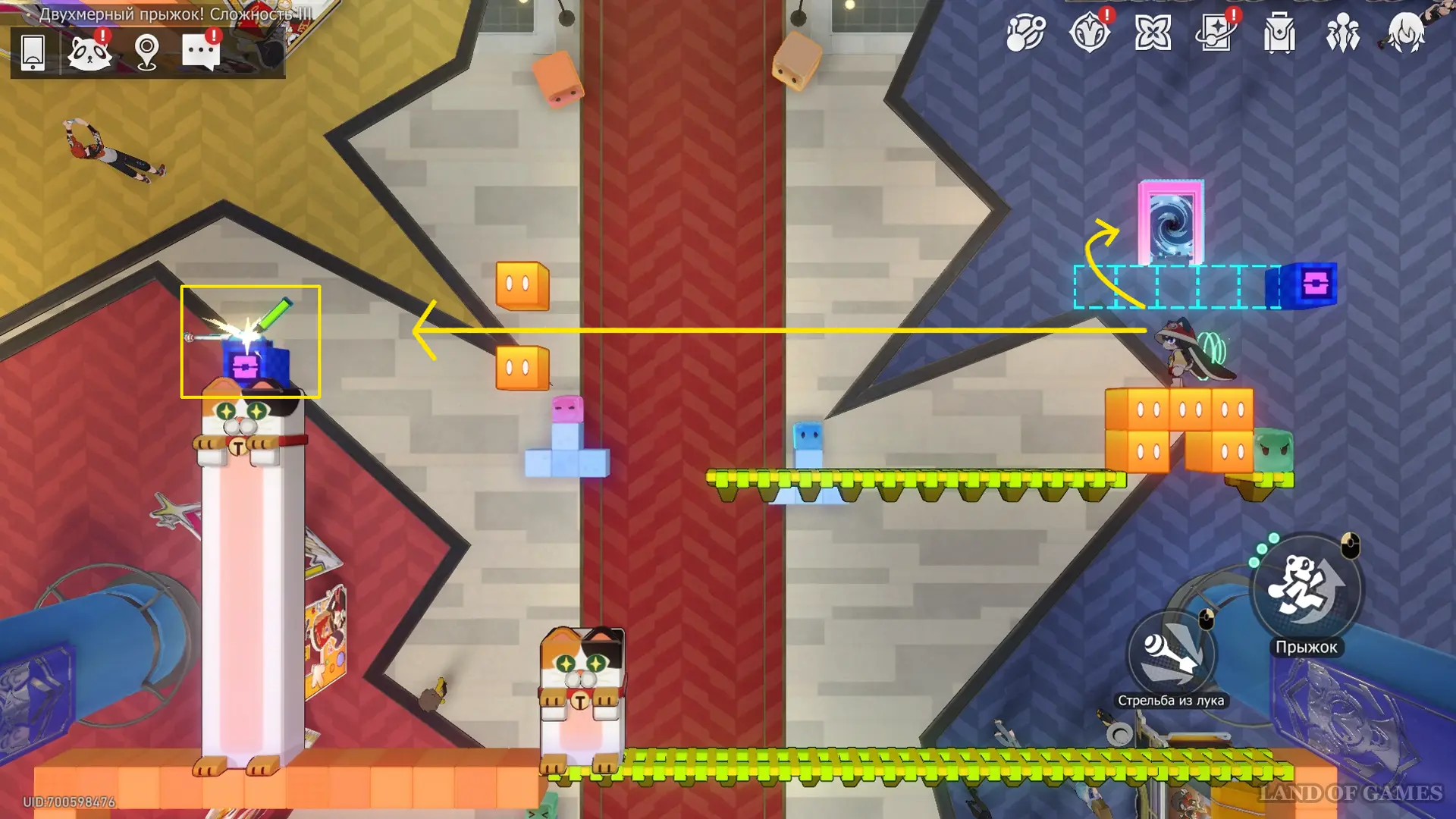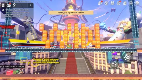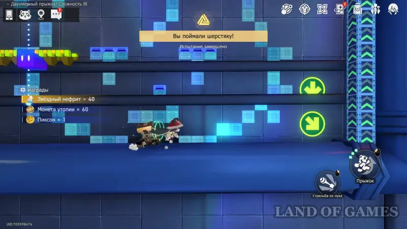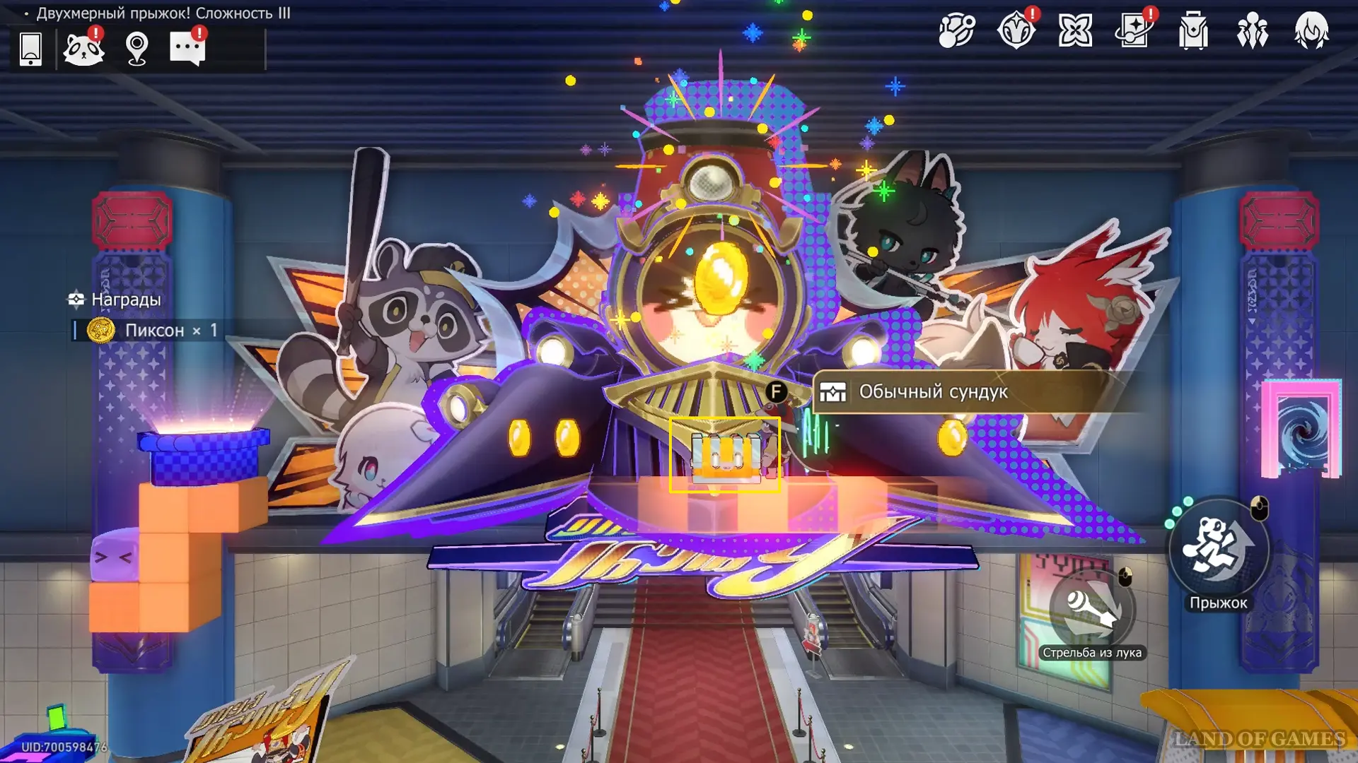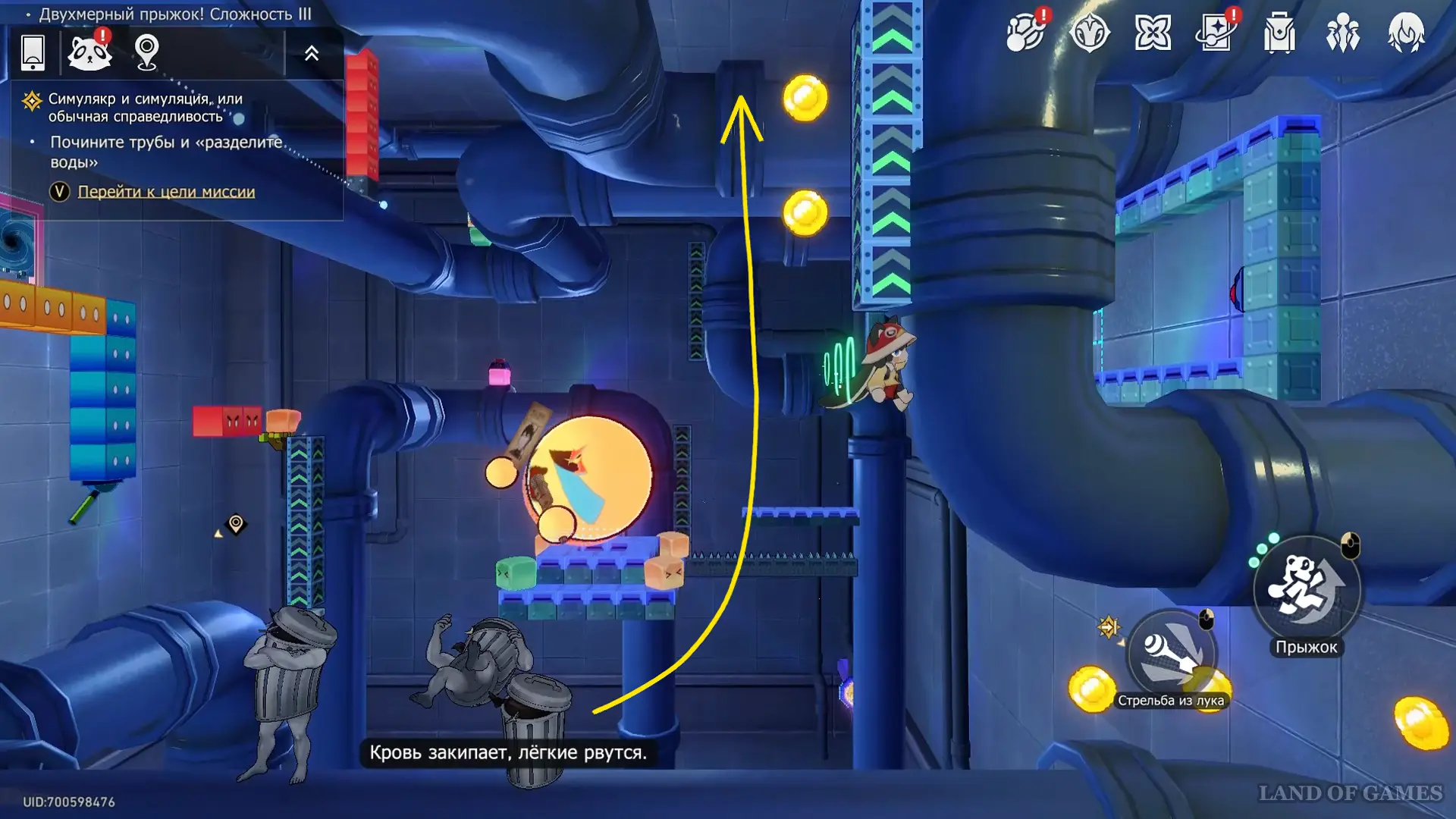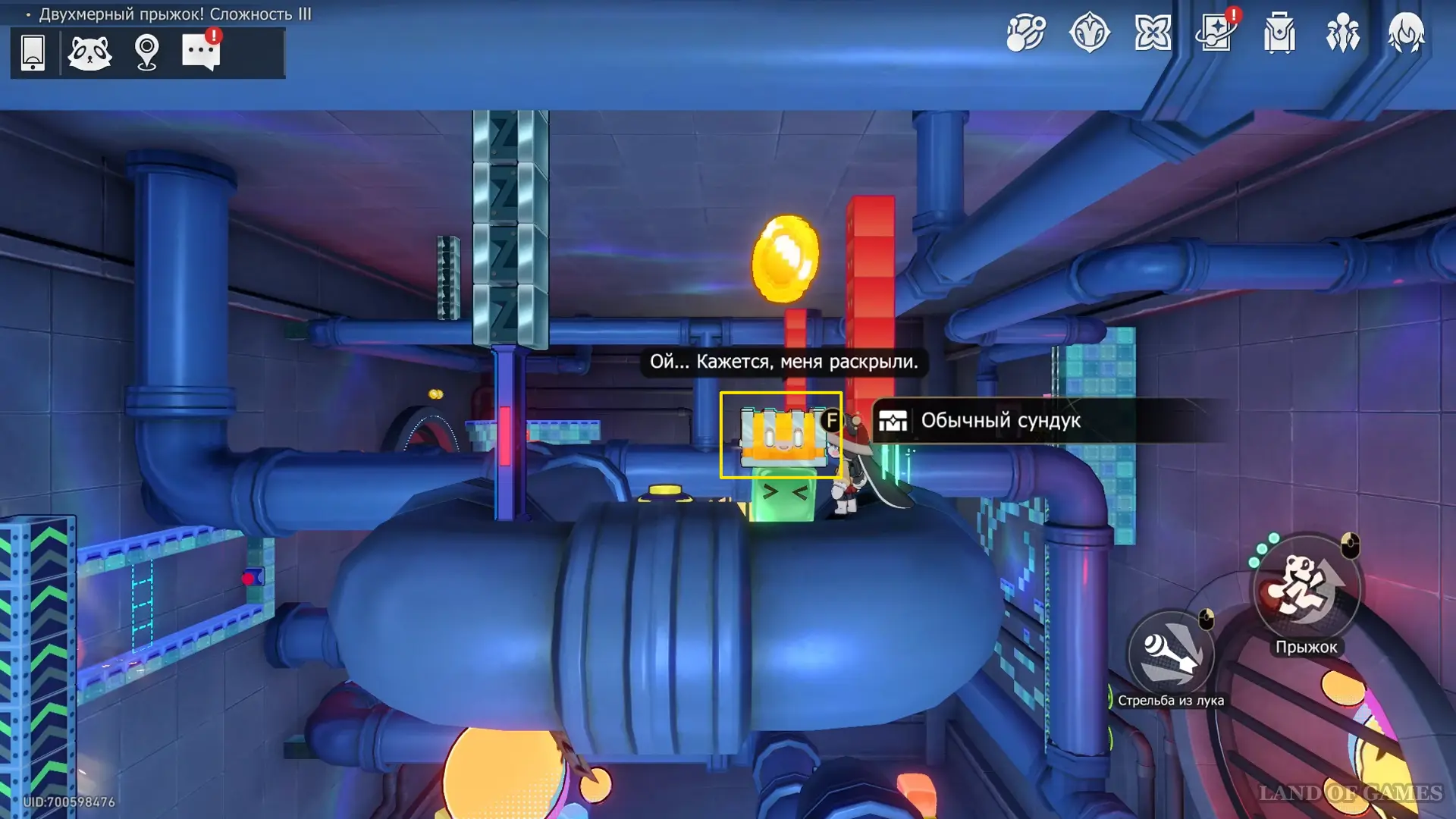 На третьей площадке подбегите к кнопке под синими блоками слева и быстро нажимайте ее в прыжке, чтобы снизить ХП Коколии и завершить испытание «Легенды о пушистых героях». Затем поднимитесь через открывшийся сверху проход и заберите ценный сундучок.